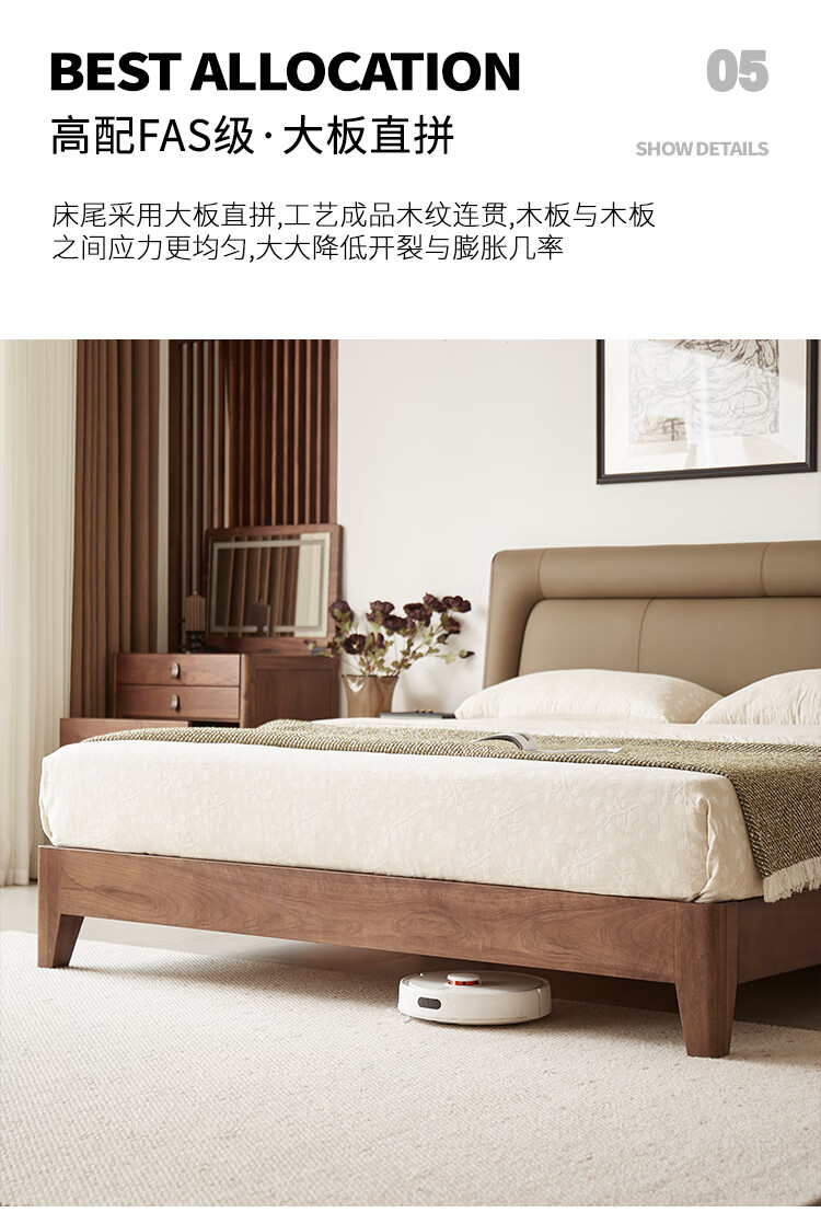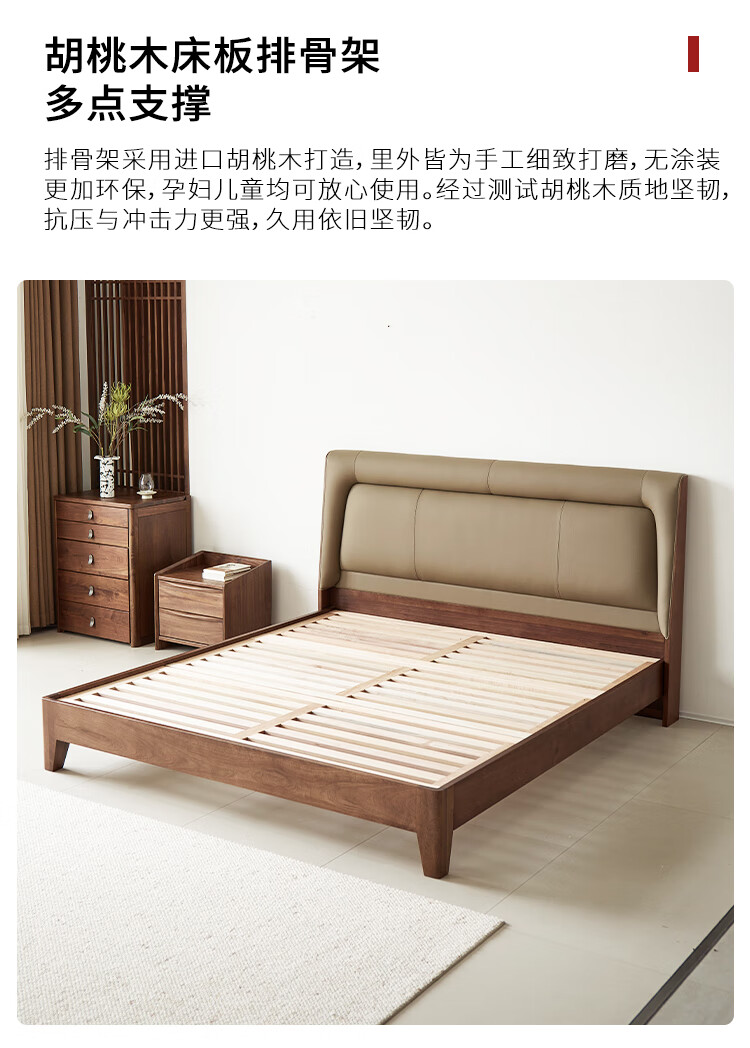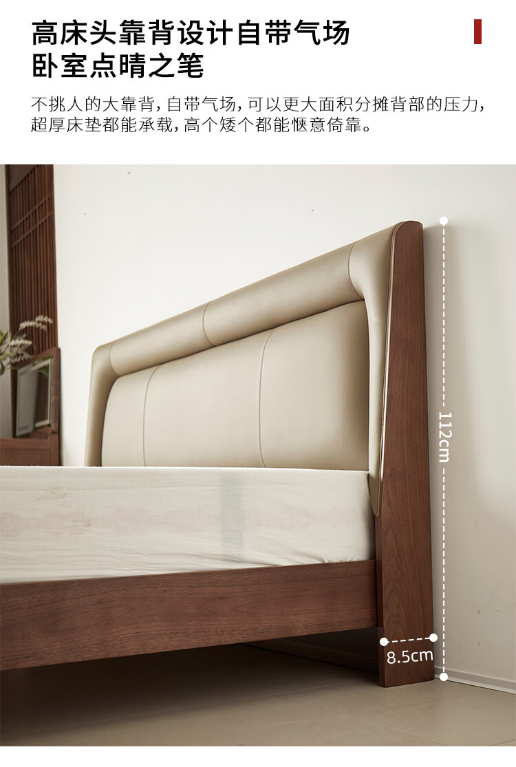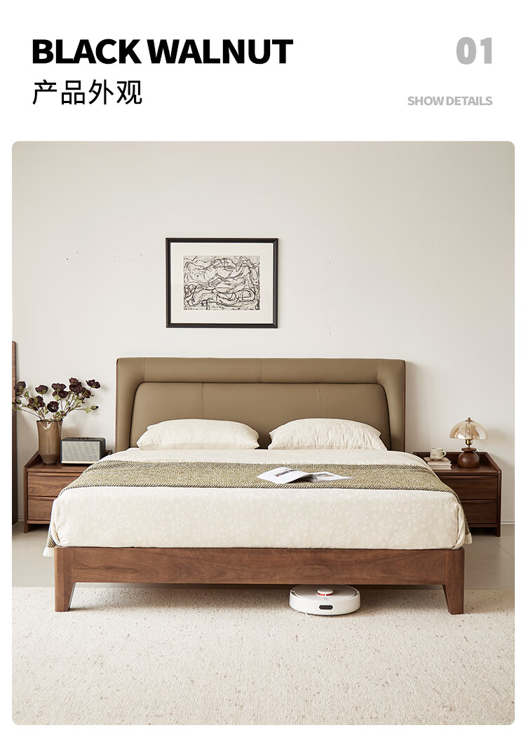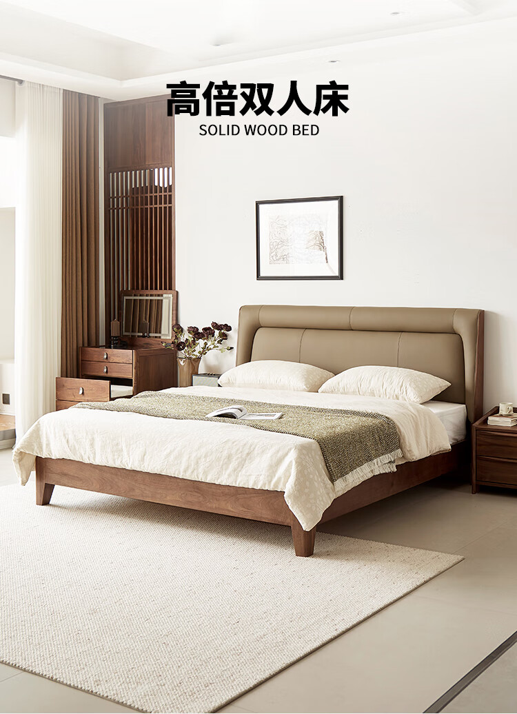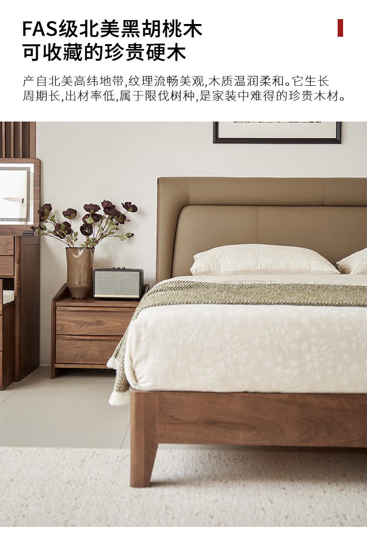 梵而全实木双人床北美黑胡桃家具现代简约真皮软靠主卧大床1.8x2米 高倍双人床【北美黑胡桃-真皮软靠】
