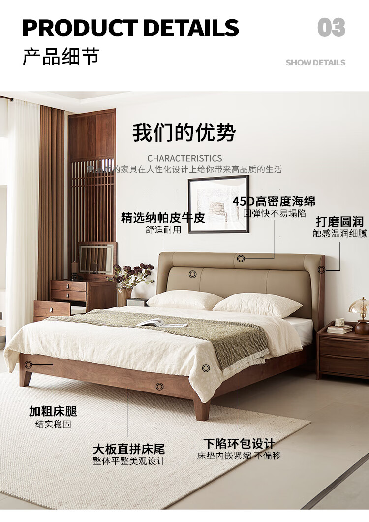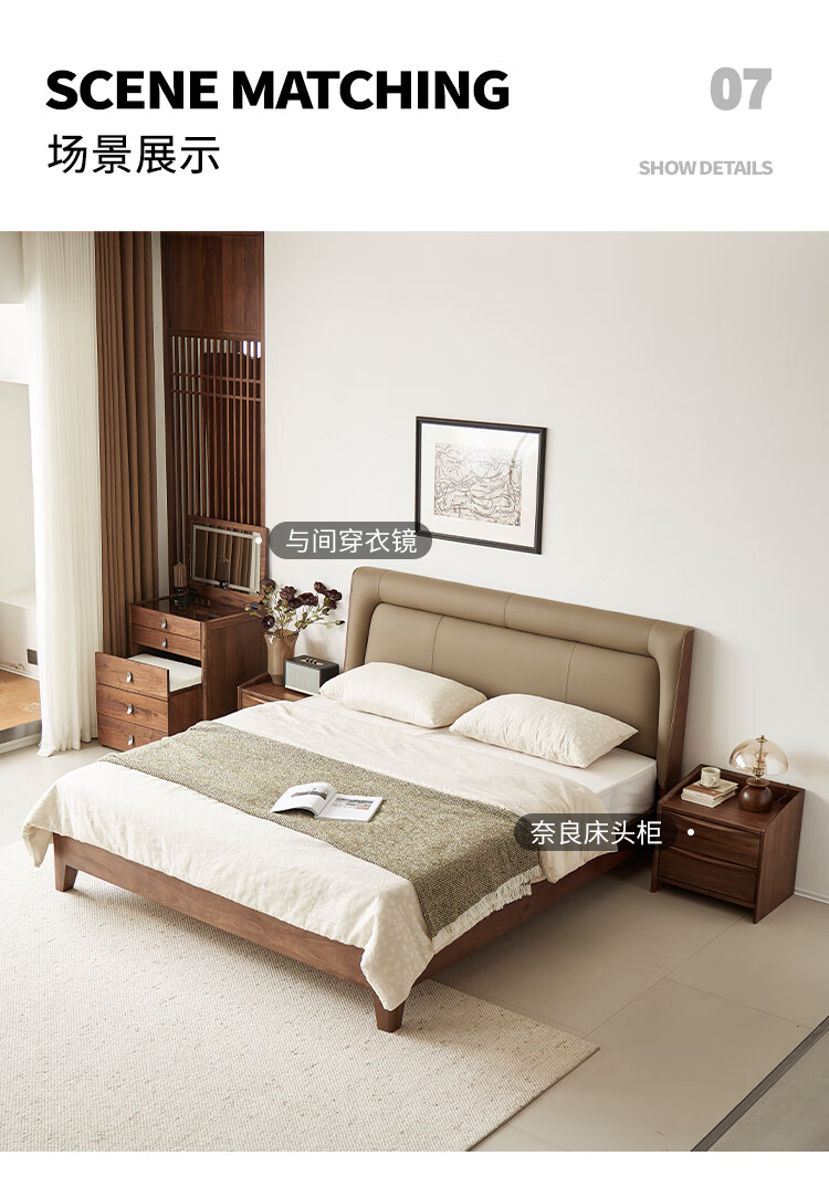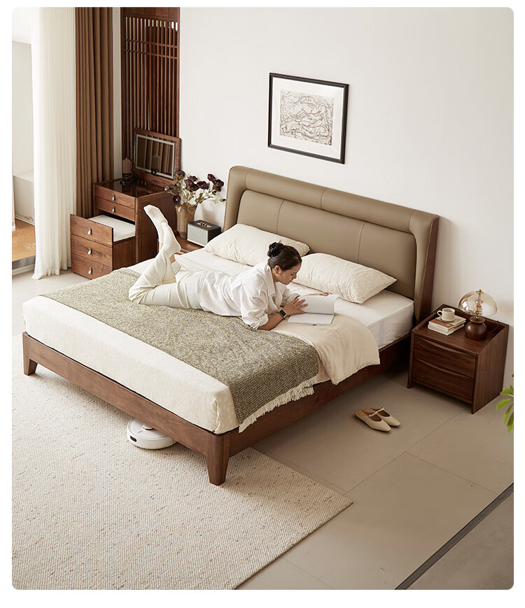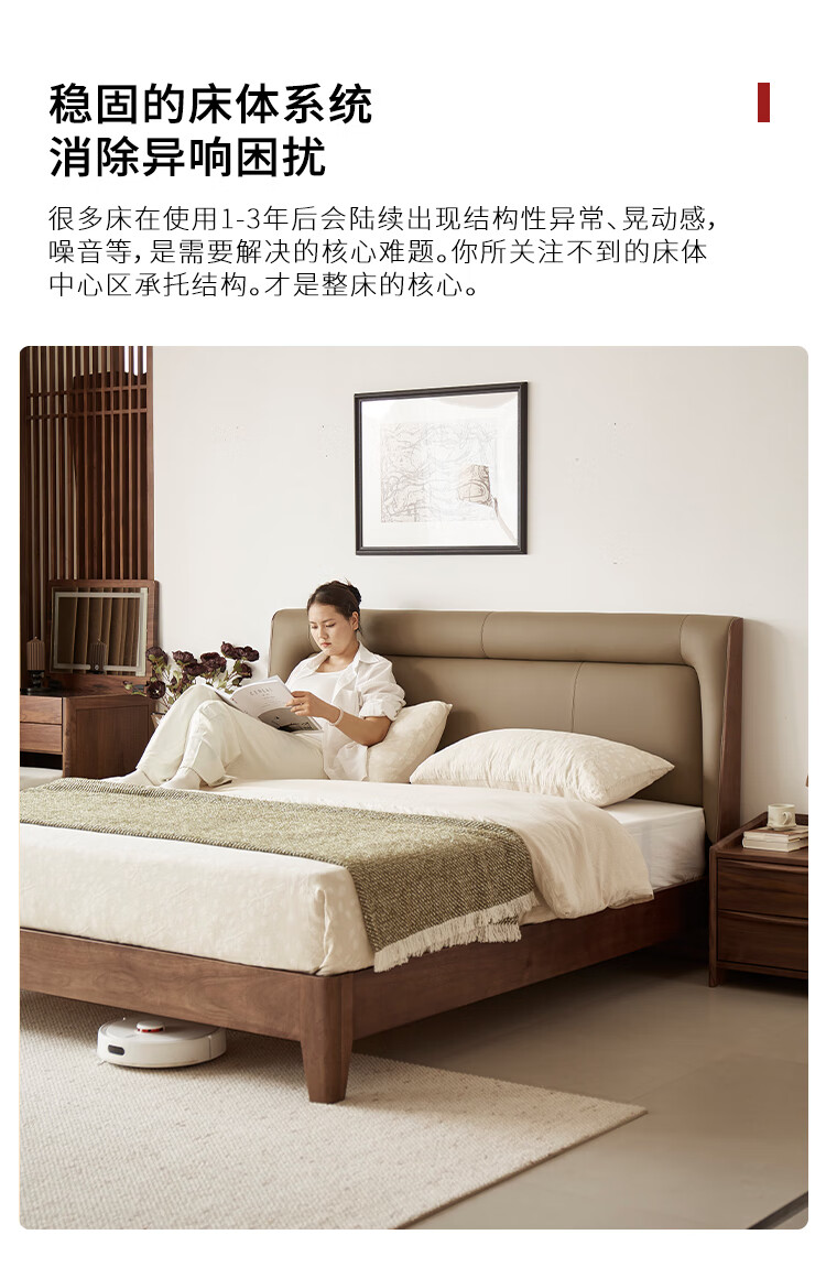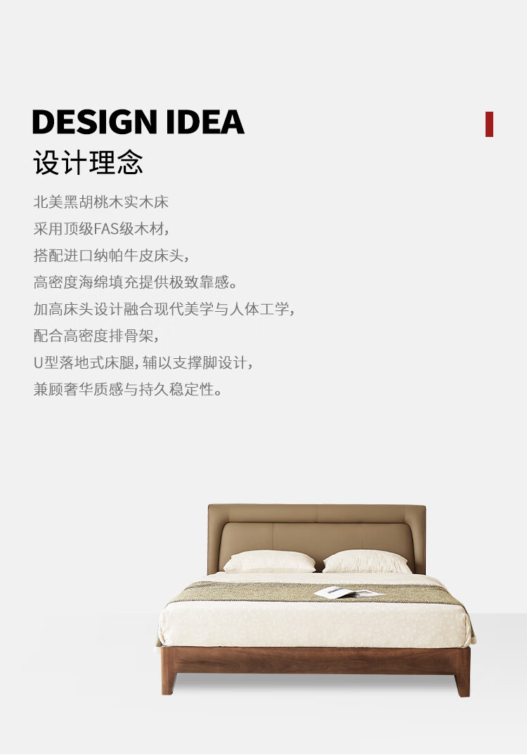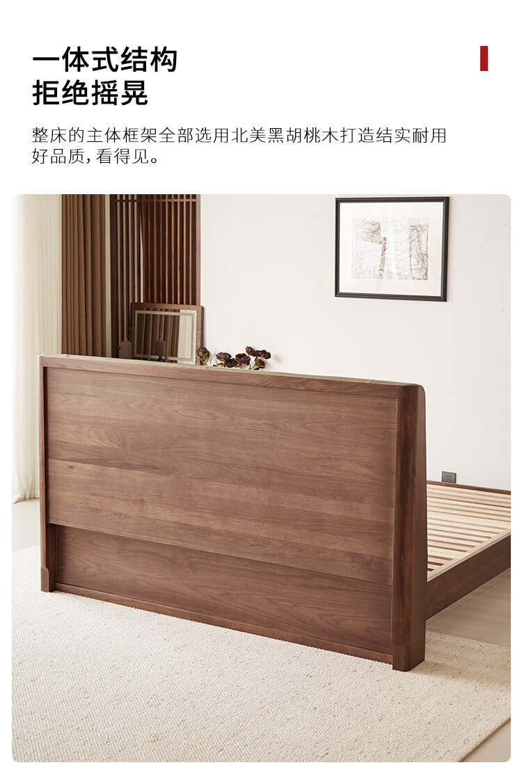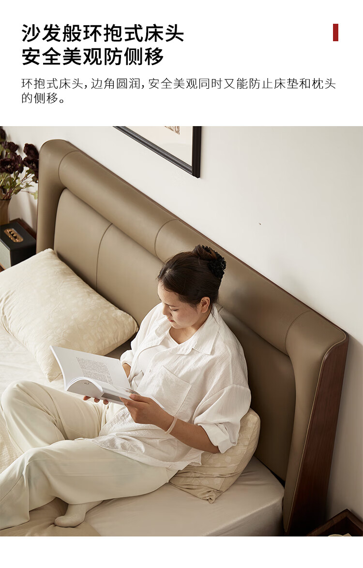 梵而全实木双人床北美黑胡桃家具现代简约真皮软靠主卧大床1.8x2米 高倍双人床【北美黑胡桃-真皮软靠】