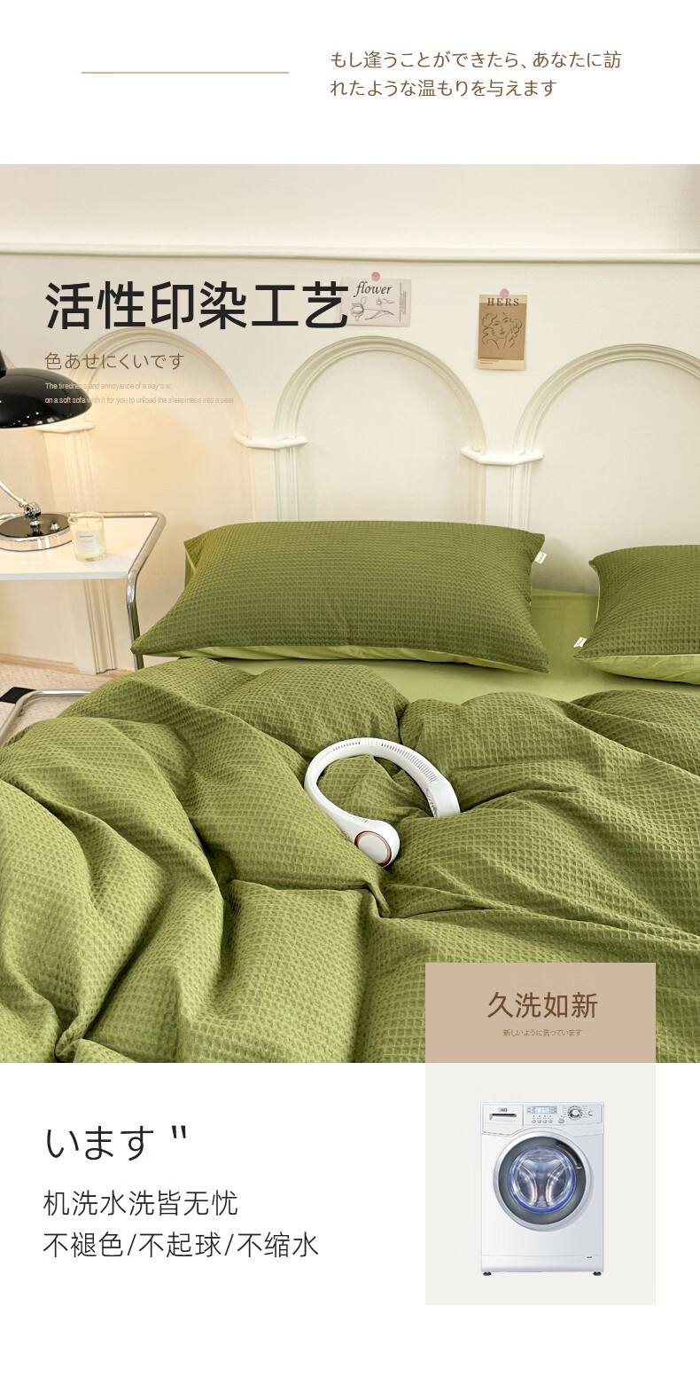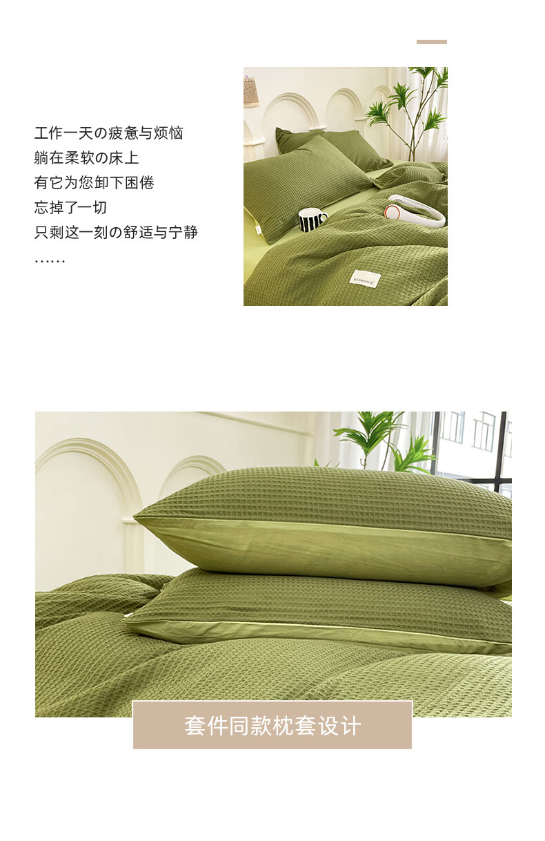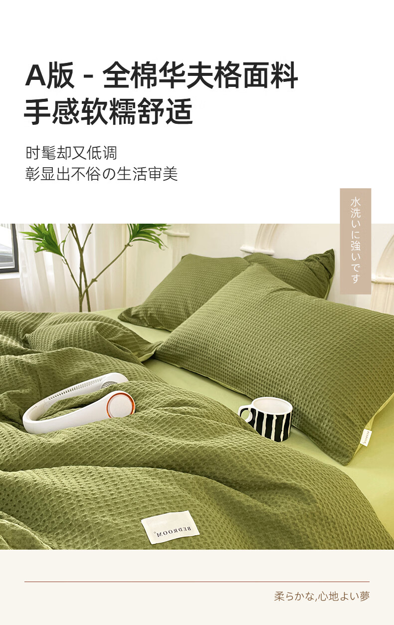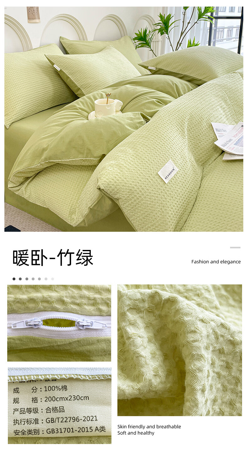 无印良品A类华夫格全棉床上用品四件套纯棉100%亲肤可裸睡床单被套床笠款4 暖卧-果绿【A类全棉 亲肤舒适】 1.2m 床单款 三件套-被套150x200cm