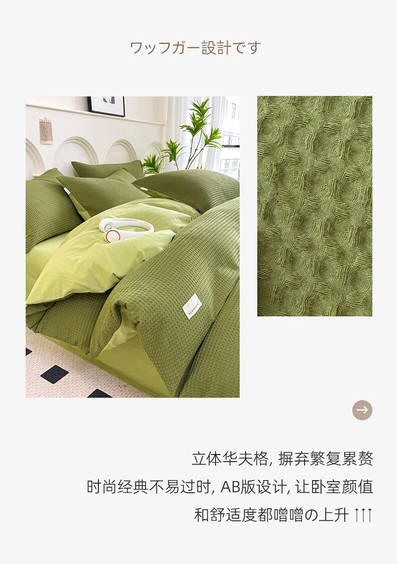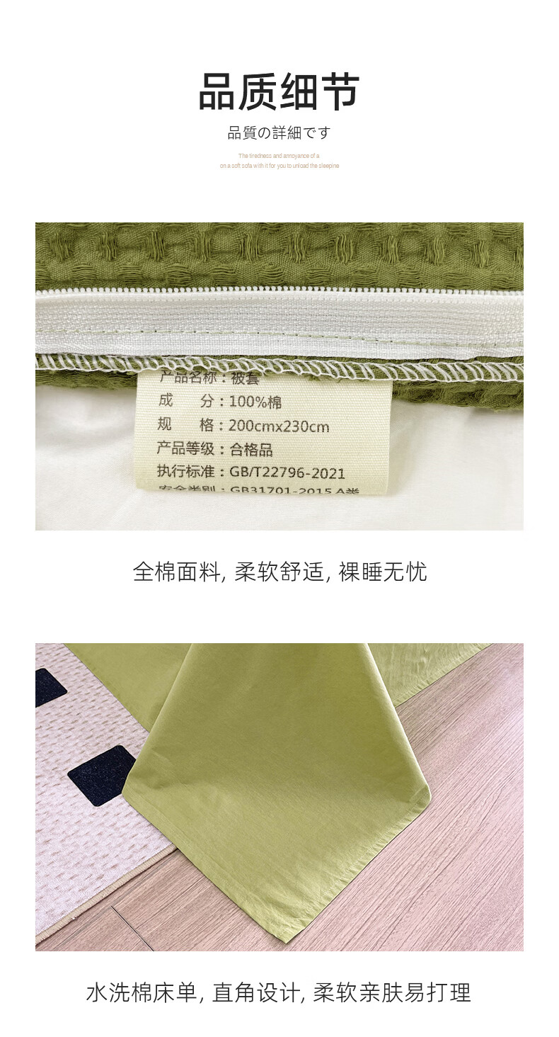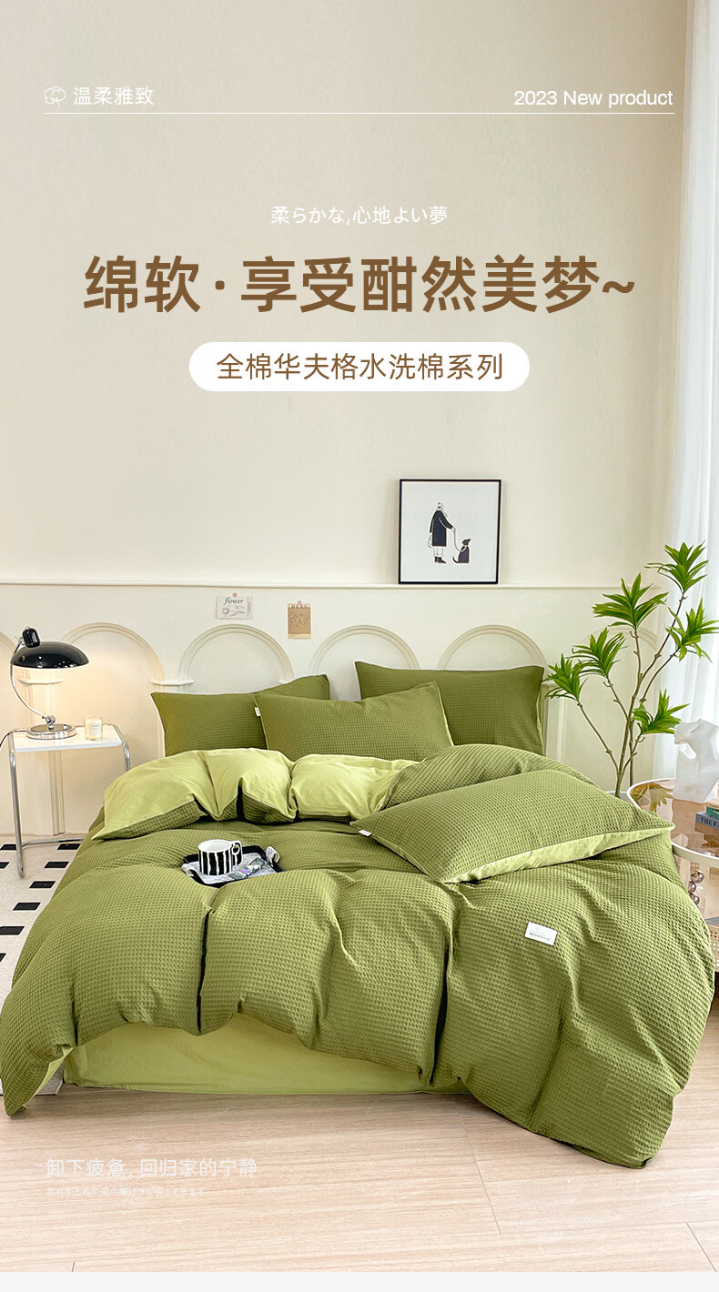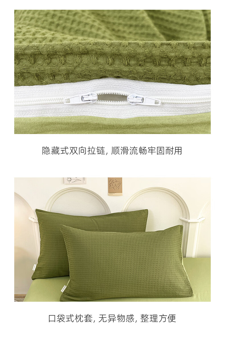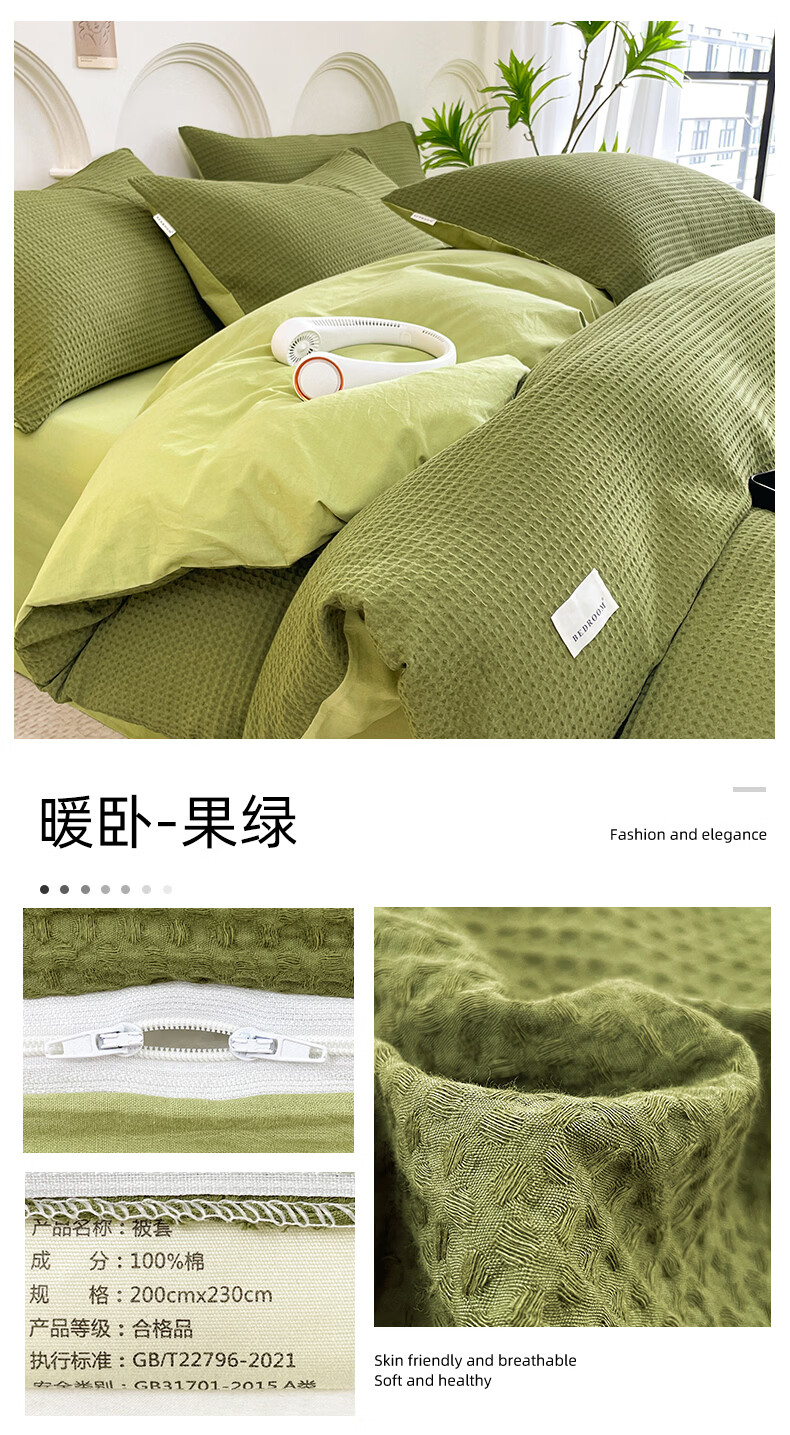 无印良品A类华夫格全棉床上用品四件套纯棉100%亲肤可裸睡床单被套床笠款4 暖卧-果绿【A类全棉 亲肤舒适】 1.2m 床单款 三件套-被套150x200cm