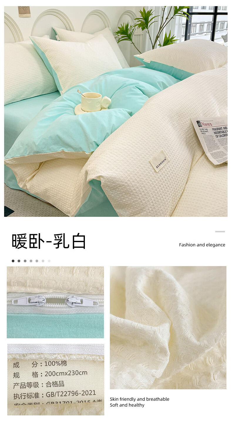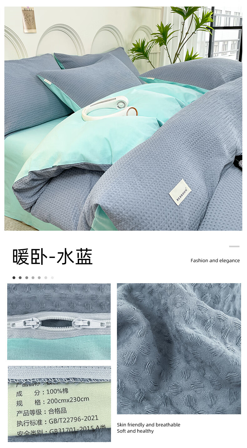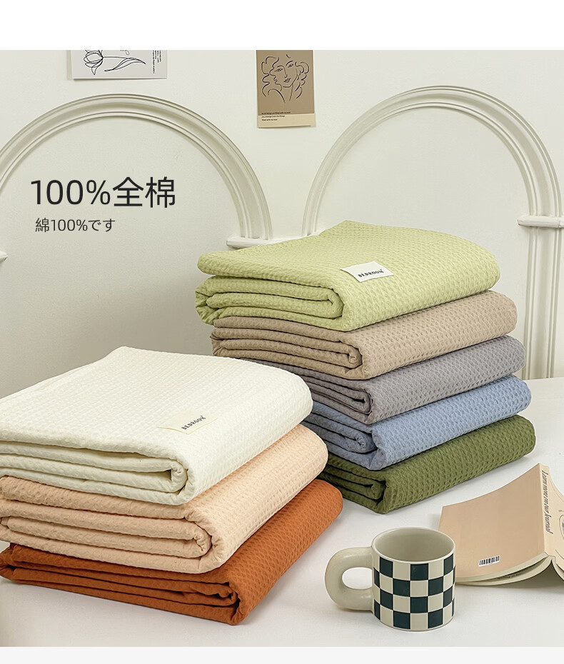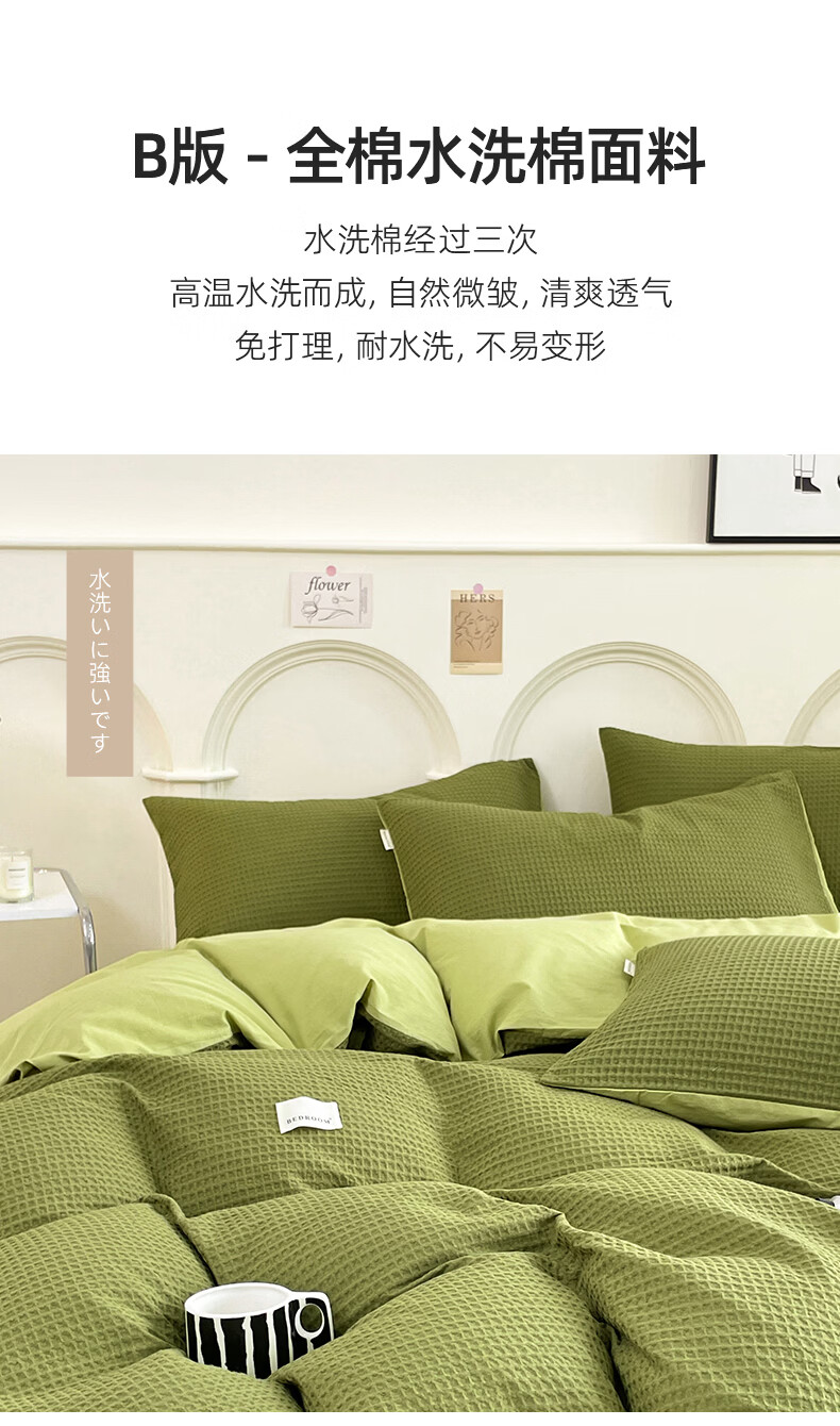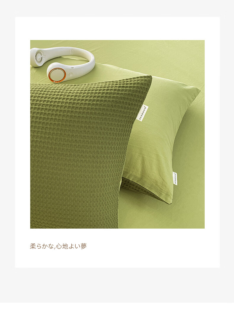 无印良品A类华夫格全棉床上用品四件套纯棉100%亲肤可裸睡床单被套床笠款4 暖卧-果绿【A类全棉 亲肤舒适】 1.2m 床单款 三件套-被套150x200cm