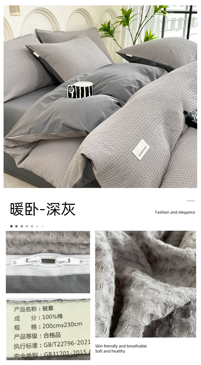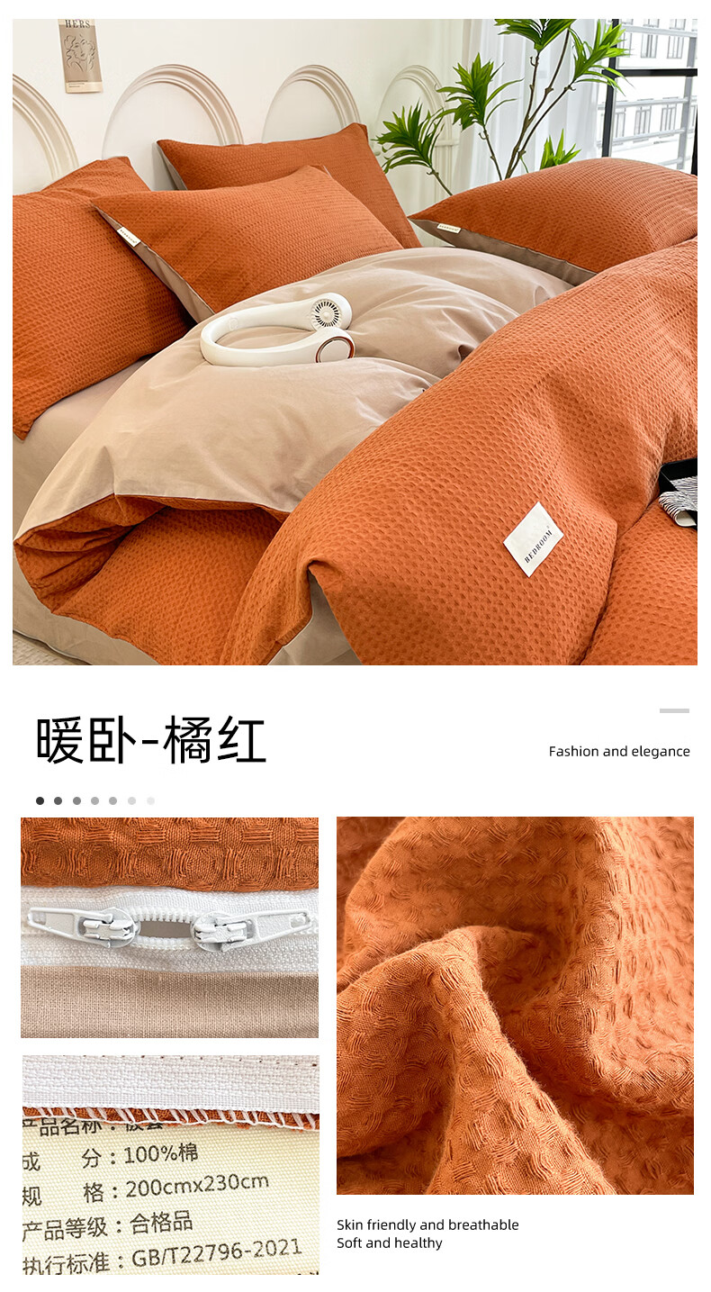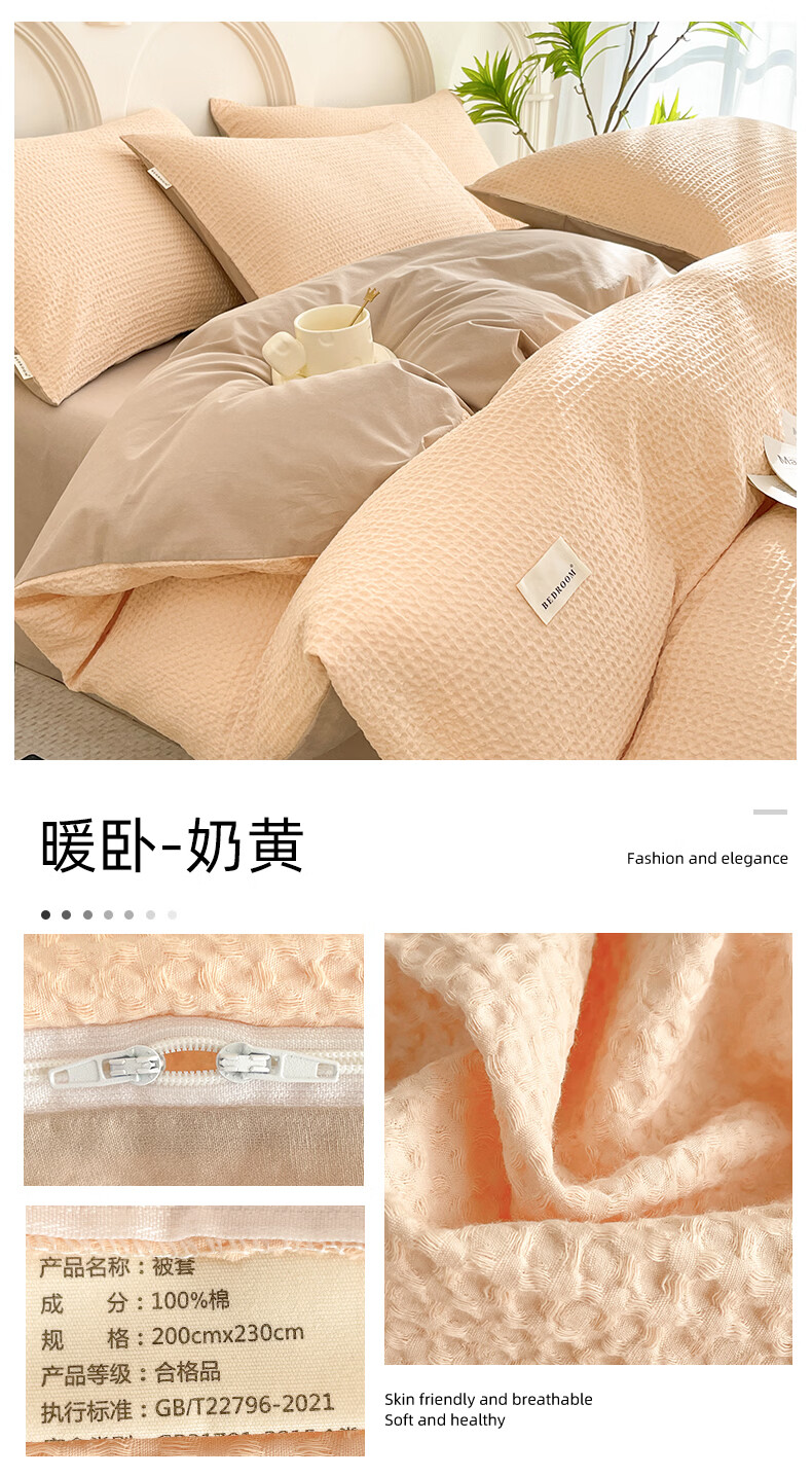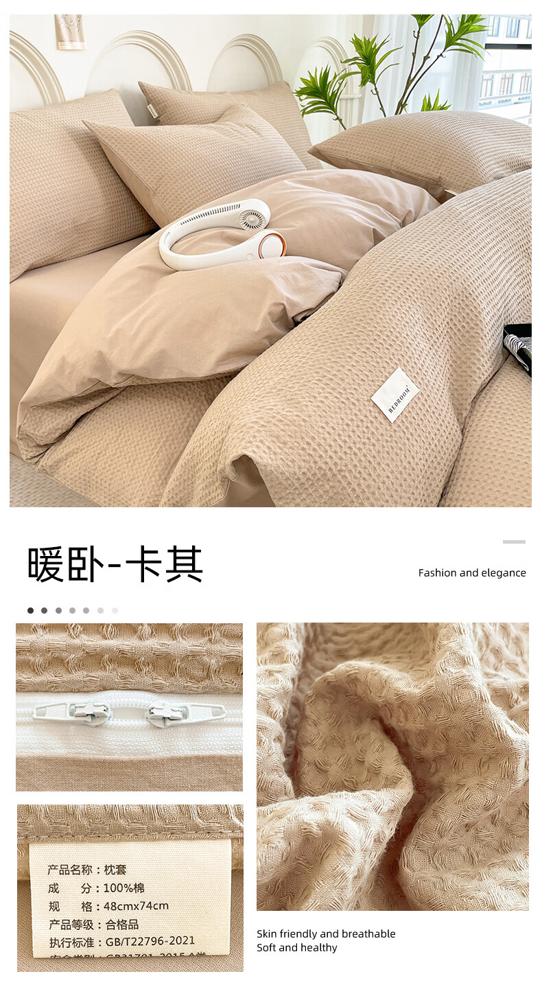 无印良品A类华夫格全棉床上用品四件套纯棉100%亲肤可裸睡床单被套床笠款4 暖卧-果绿【A类全棉 亲肤舒适】 1.2m 床单款 三件套-被套150x200cm