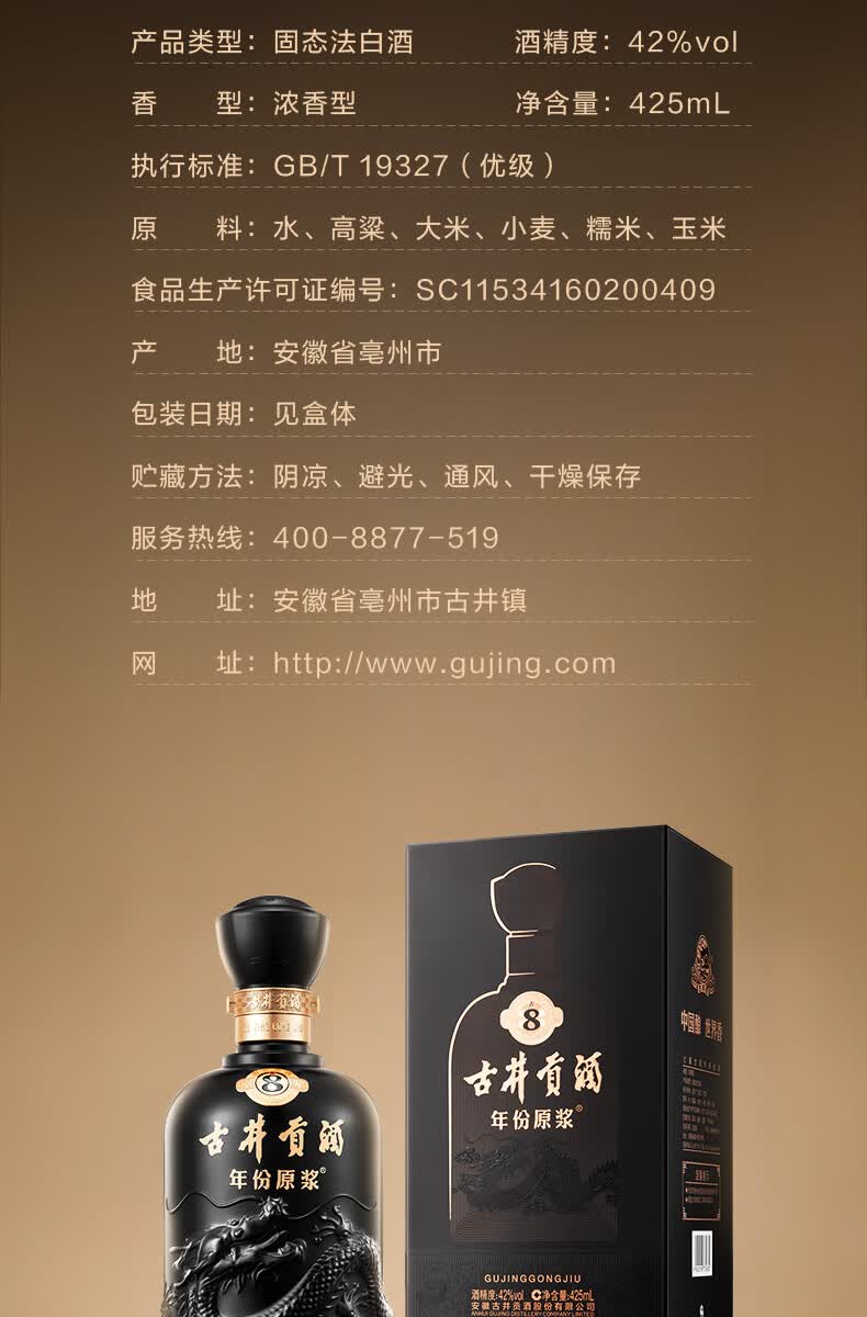 古井贡酒 年份原浆古8 浓香型白酒 42度 425mL*1瓶 单瓶装