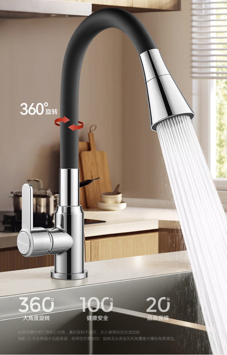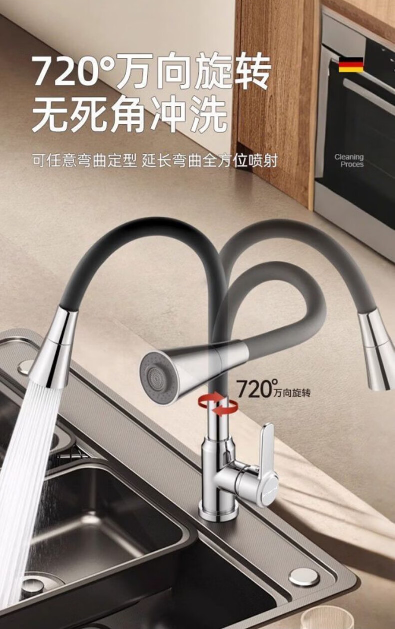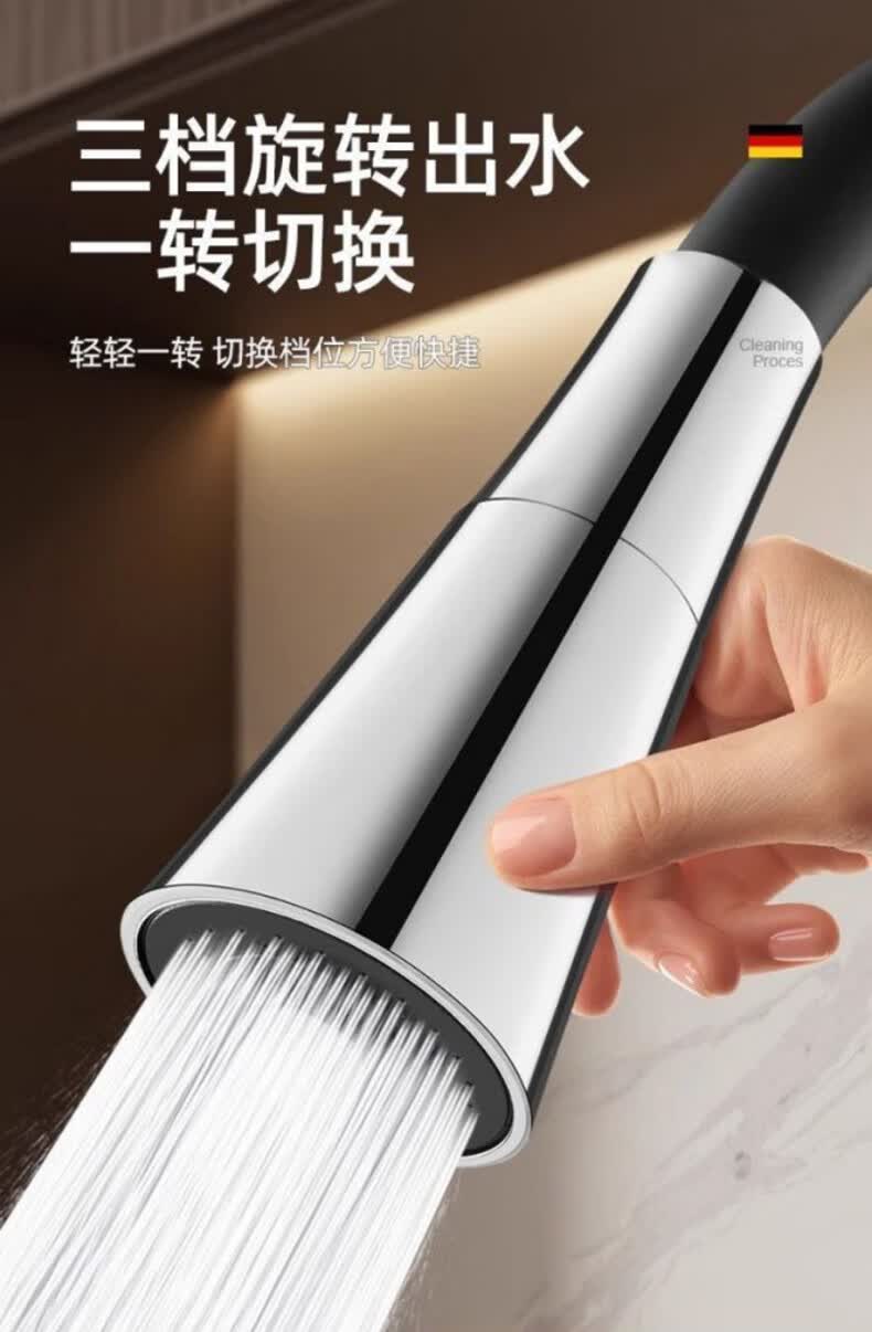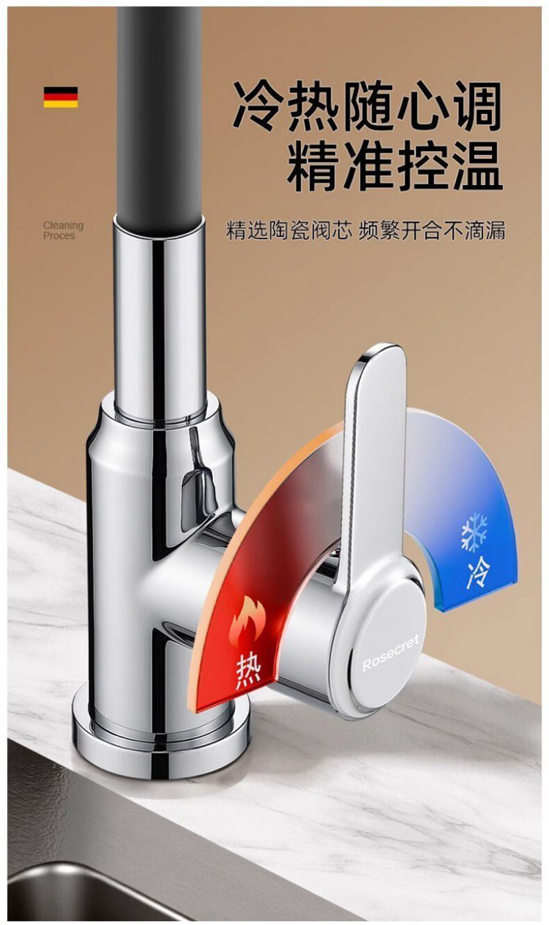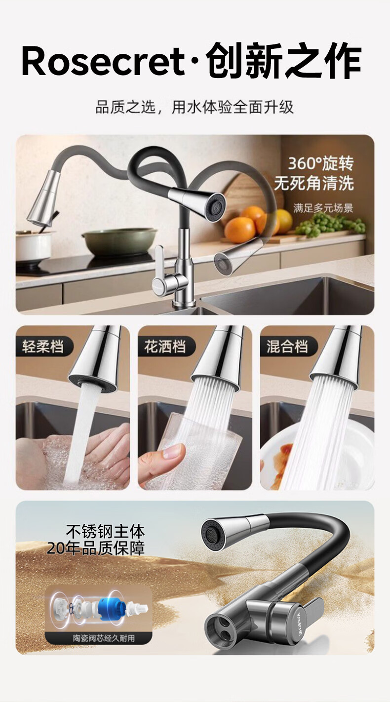 Rosecret【德国】厨房水龙头高抛冷热水器二合一万向旋转不锈钢洗菜盆龙头 三档双温出水厨房龙头【银黑色】 增压防溅丨配80cm冷热进水管*2