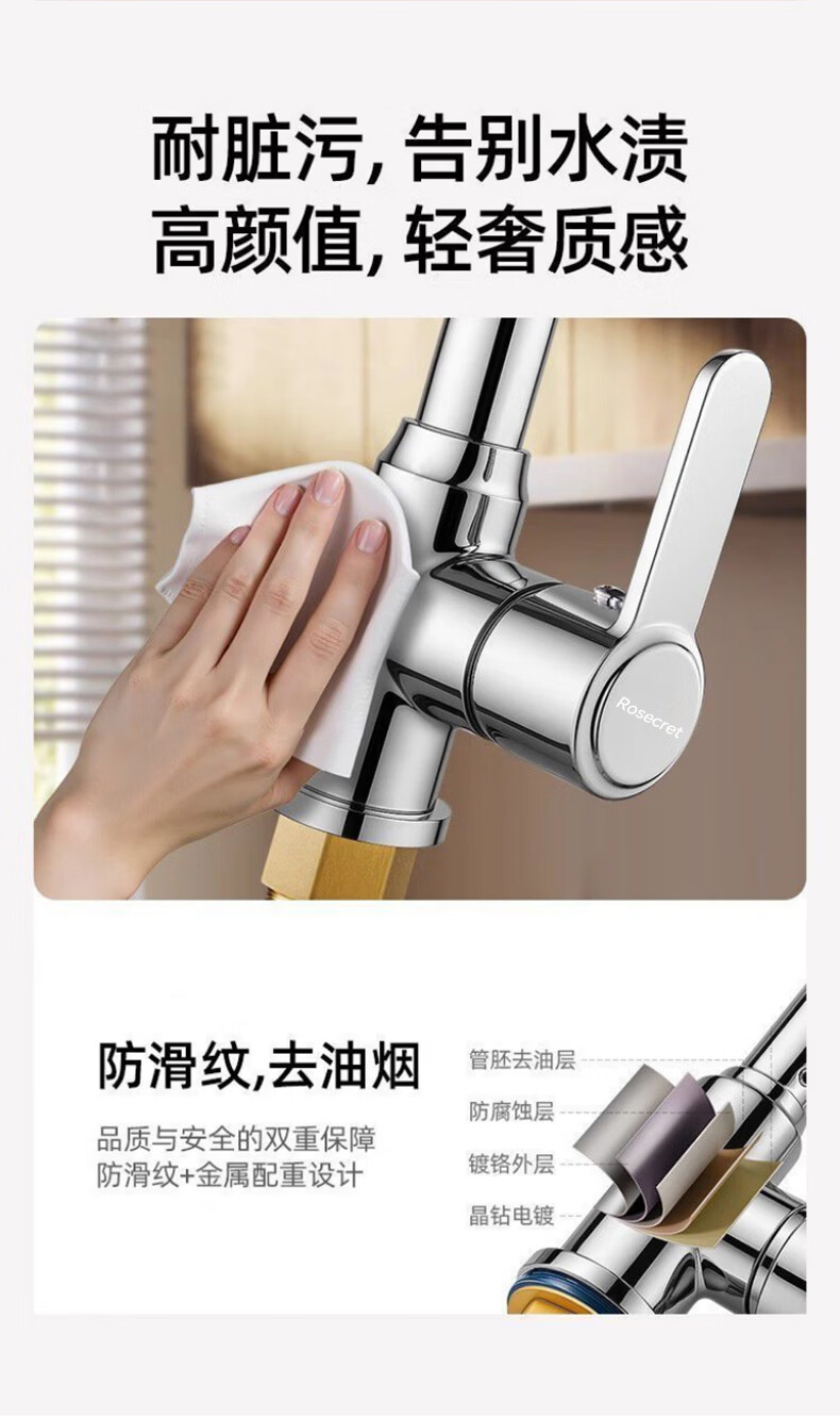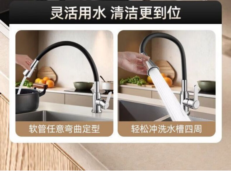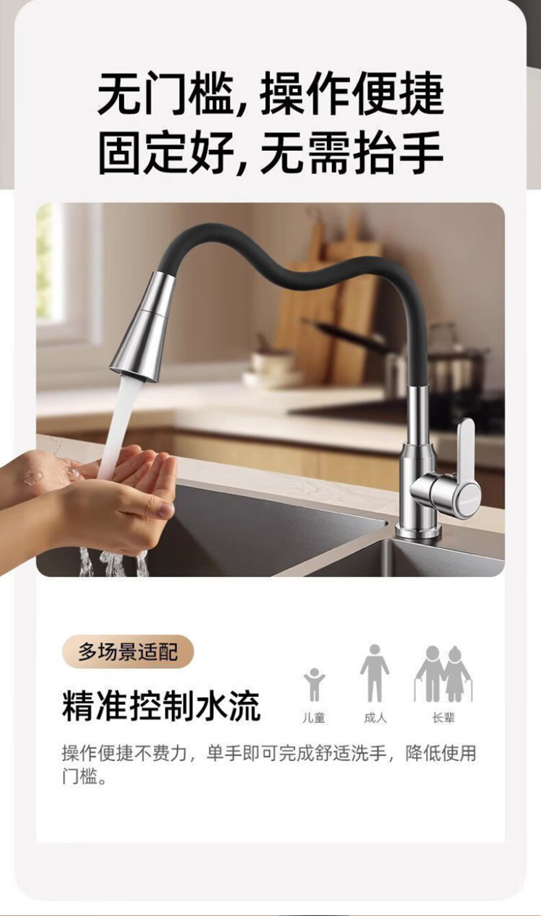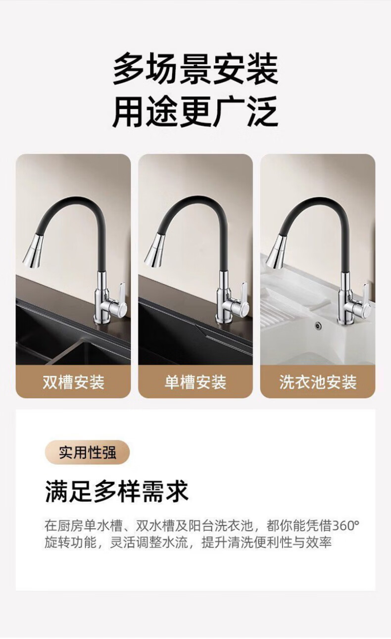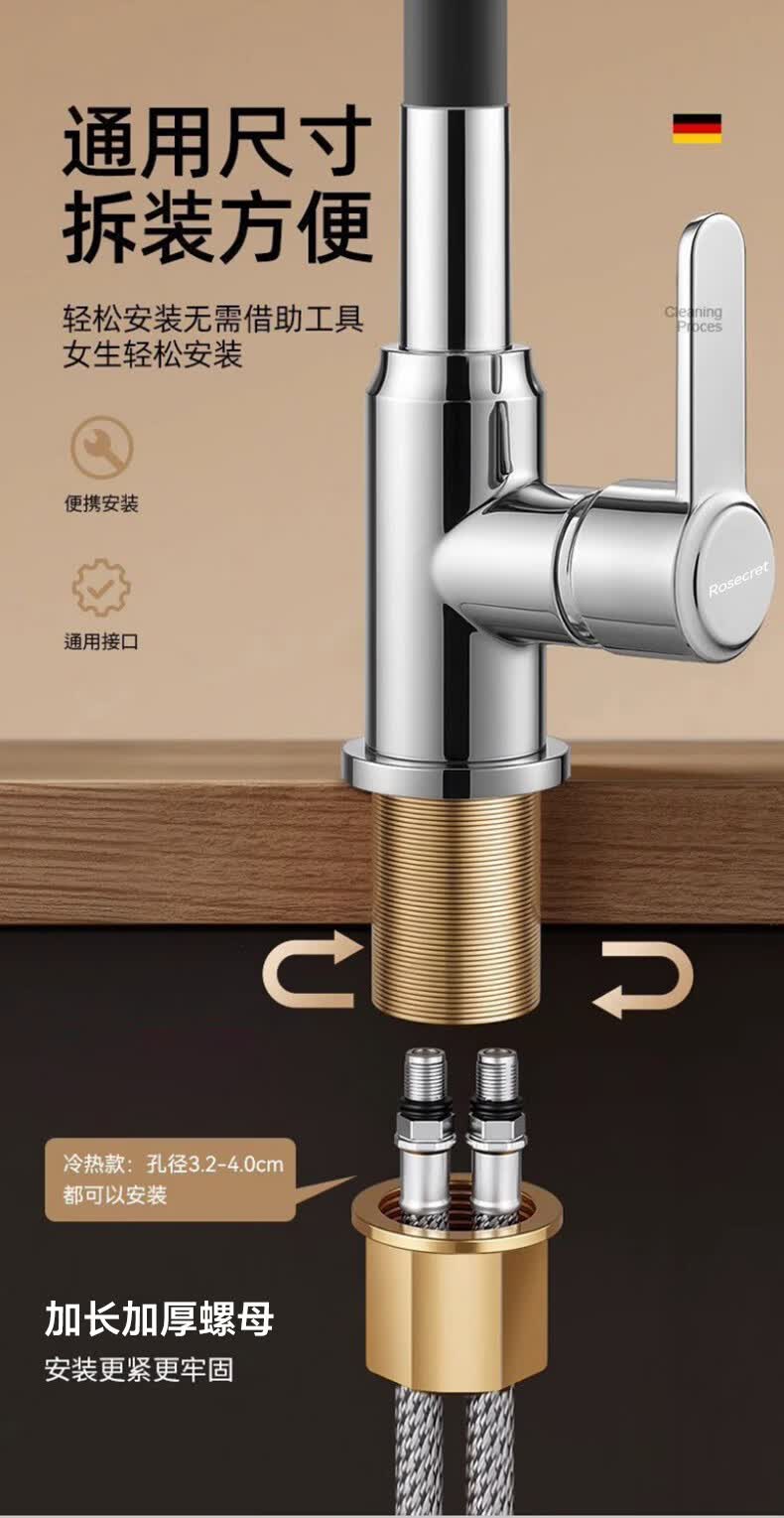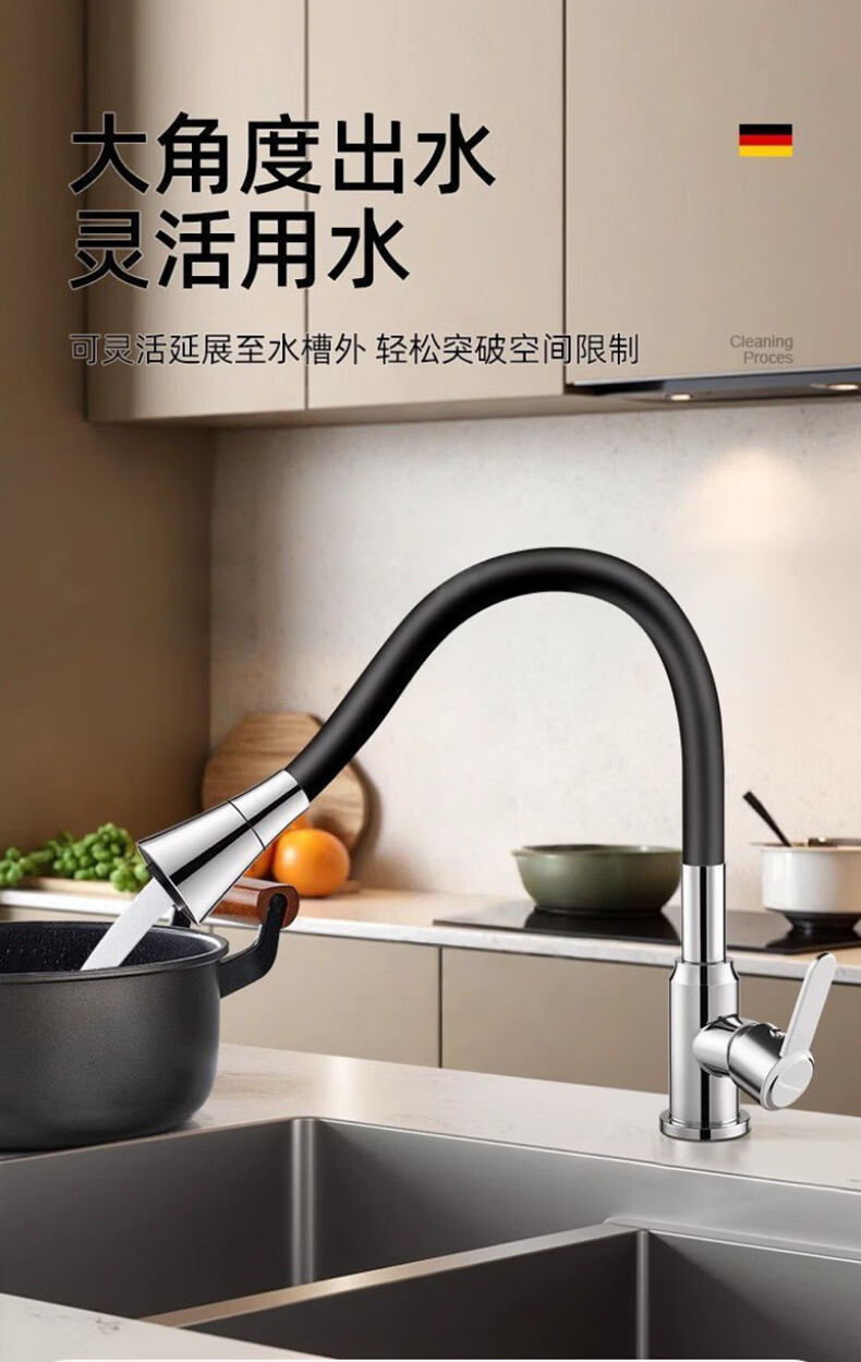 Rosecret【德国】厨房水龙头高抛冷热水器二合一万向旋转不锈钢洗菜盆龙头 三档双温出水厨房龙头【银黑色】 增压防溅丨配80cm冷热进水管*2