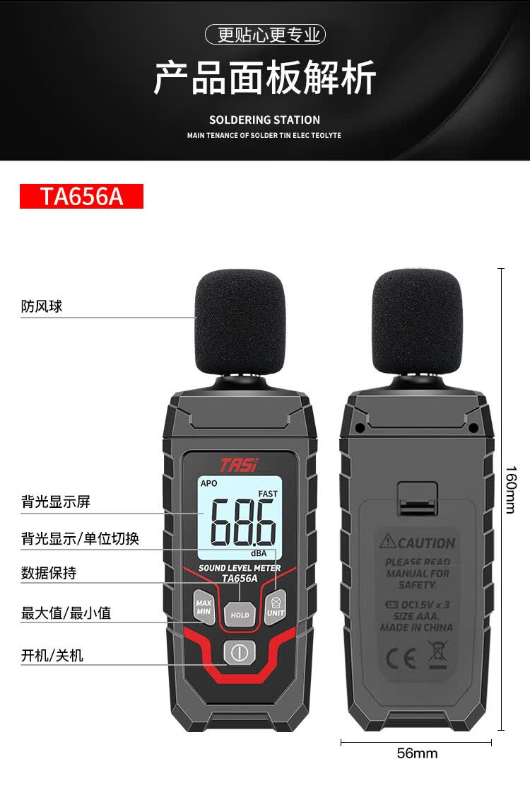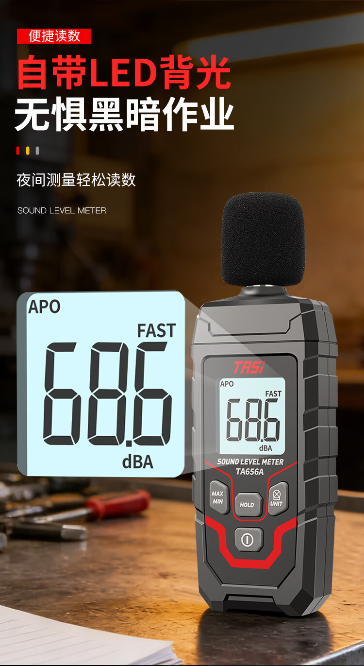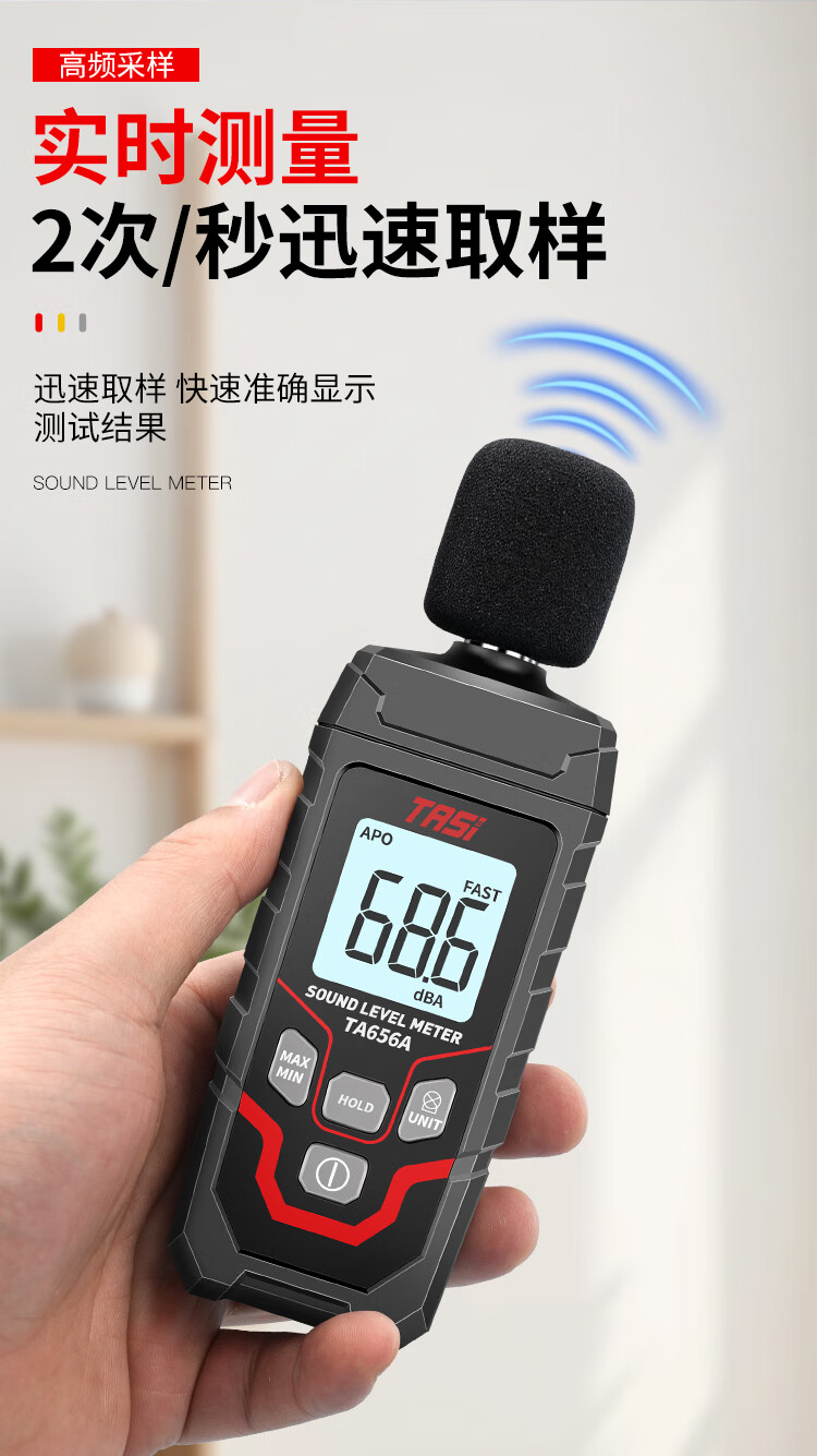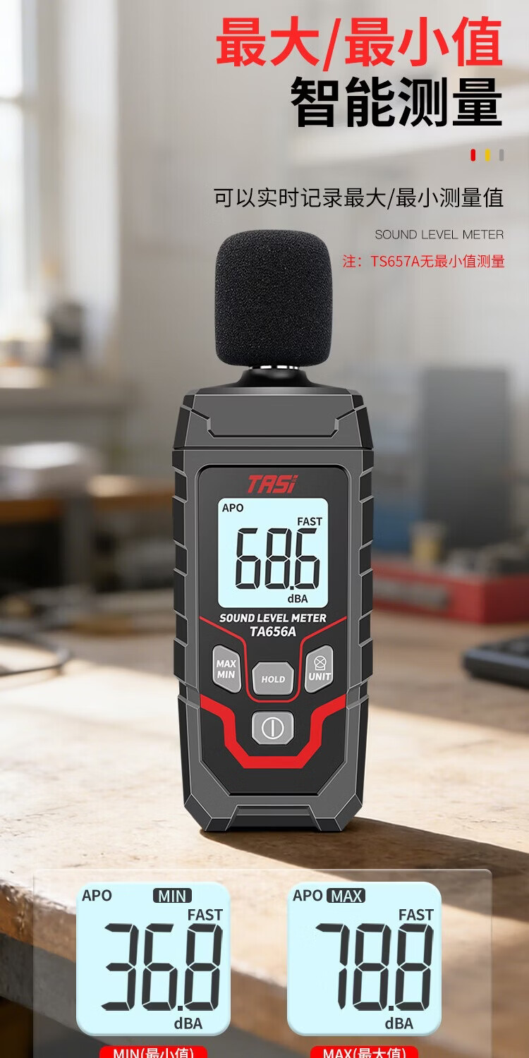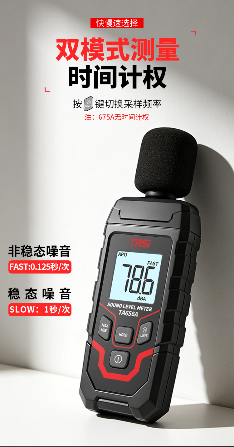 TASI高精度分贝仪工业环境专业级噪音计家用音量声级检测仪噪声测试仪 电池款TA656A【A计权/快慢计权】
