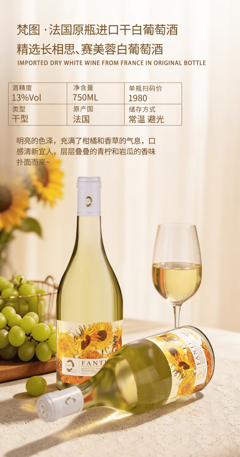 梵图【法国FANTU】原瓶进口白葡萄酒13度干白葡萄酒750mlX6支礼盒装