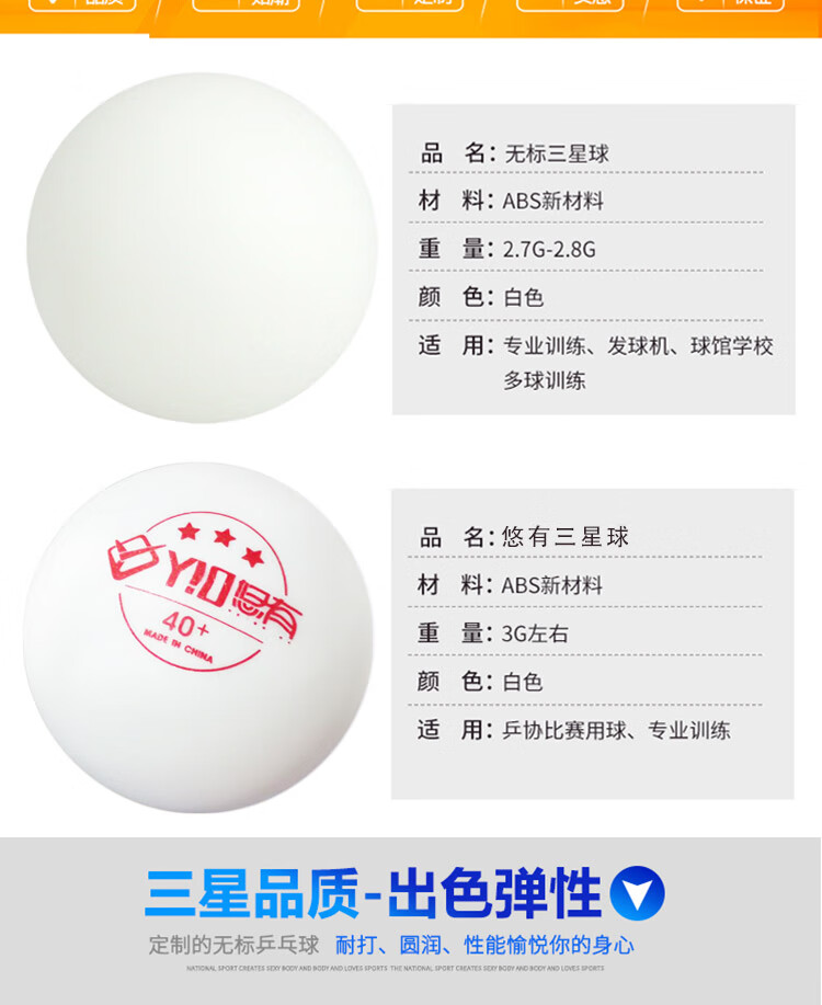 悠有 乒乓球 新材料三星乒乓球 发球机多球训练40+3星乒乓球塑料球 100个装