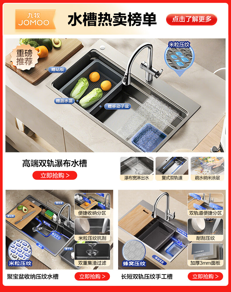 九牧(JOMOO)九牧瀑布厨房水槽单槽洗菜盆一体盆304不锈钢多功能洗碗槽06352 78*48【半岛收纳侧排瀑布槽06352】