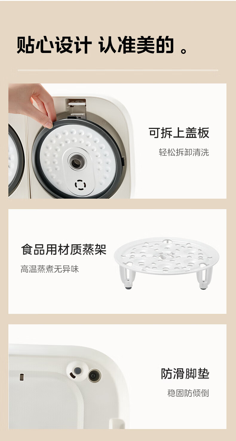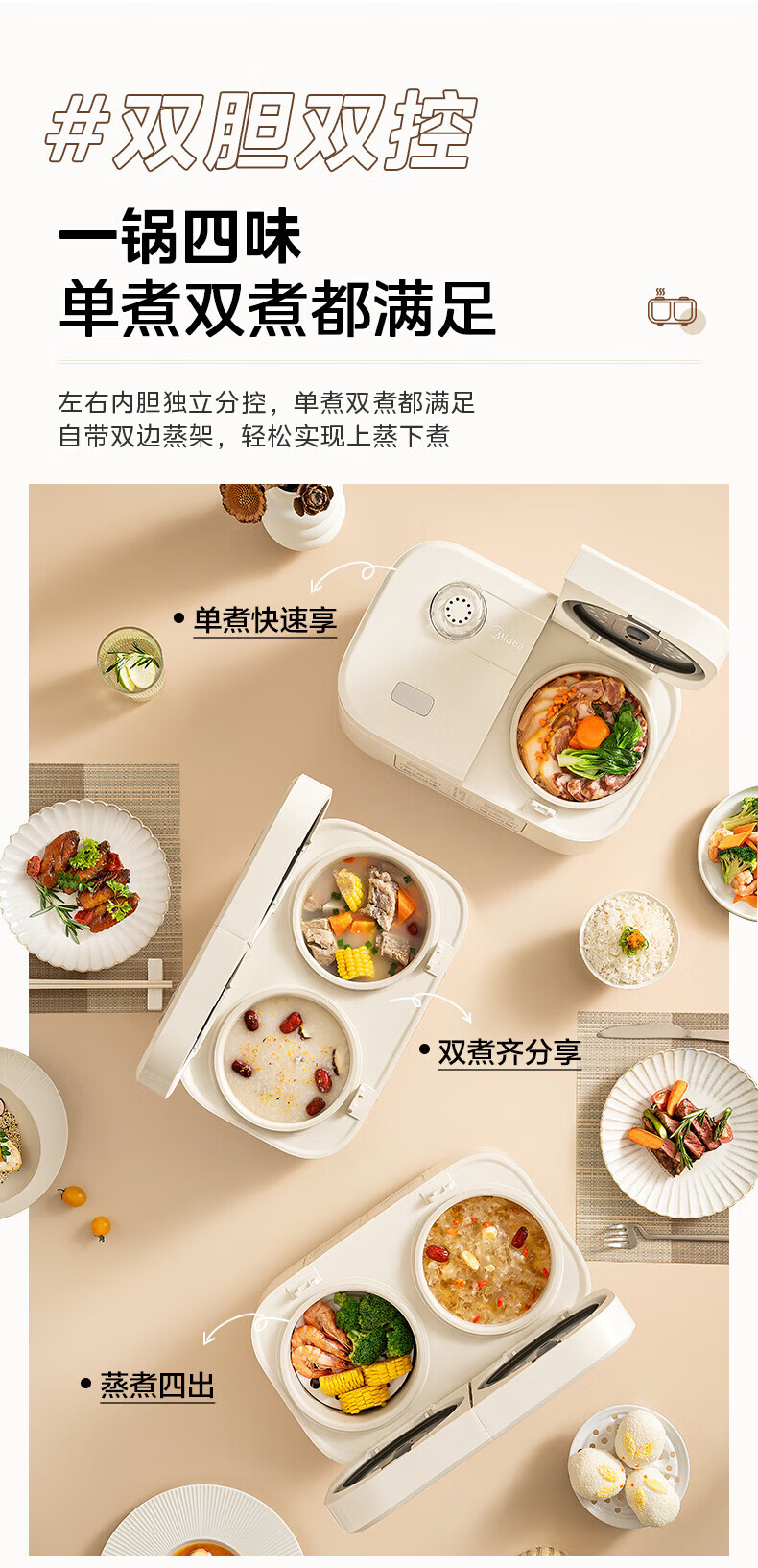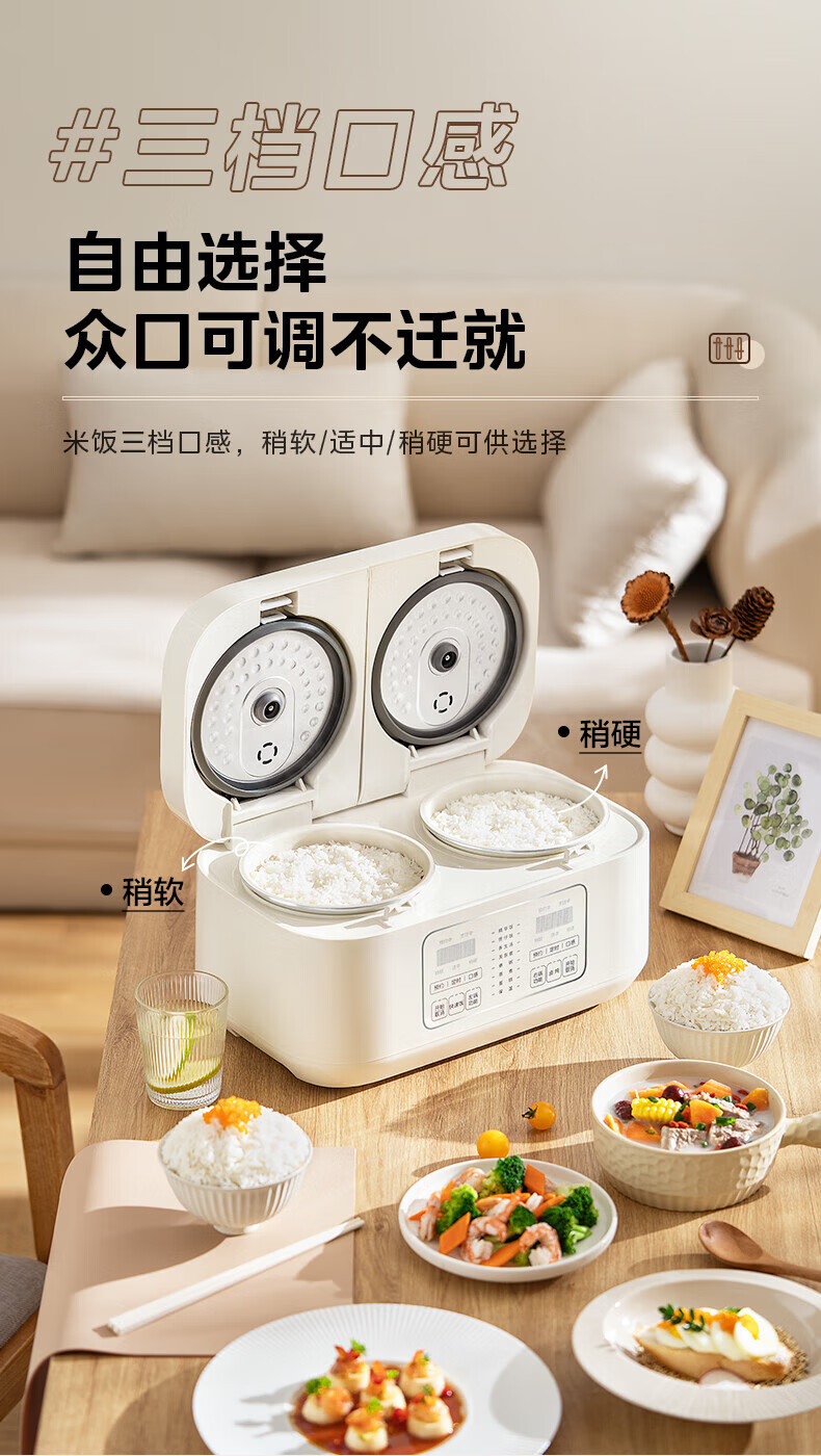 美的(Midea)双胆电饭煲3.2L 家用小型白玉晶釜内胆不粘锅双控双锅独立控温智能可预约多功能电饭锅煲汤锅 【双锅分区独立蒸煮】 3.2L 单锅1.6L