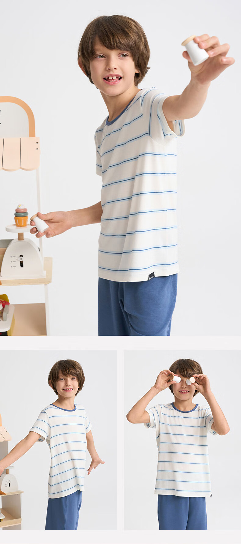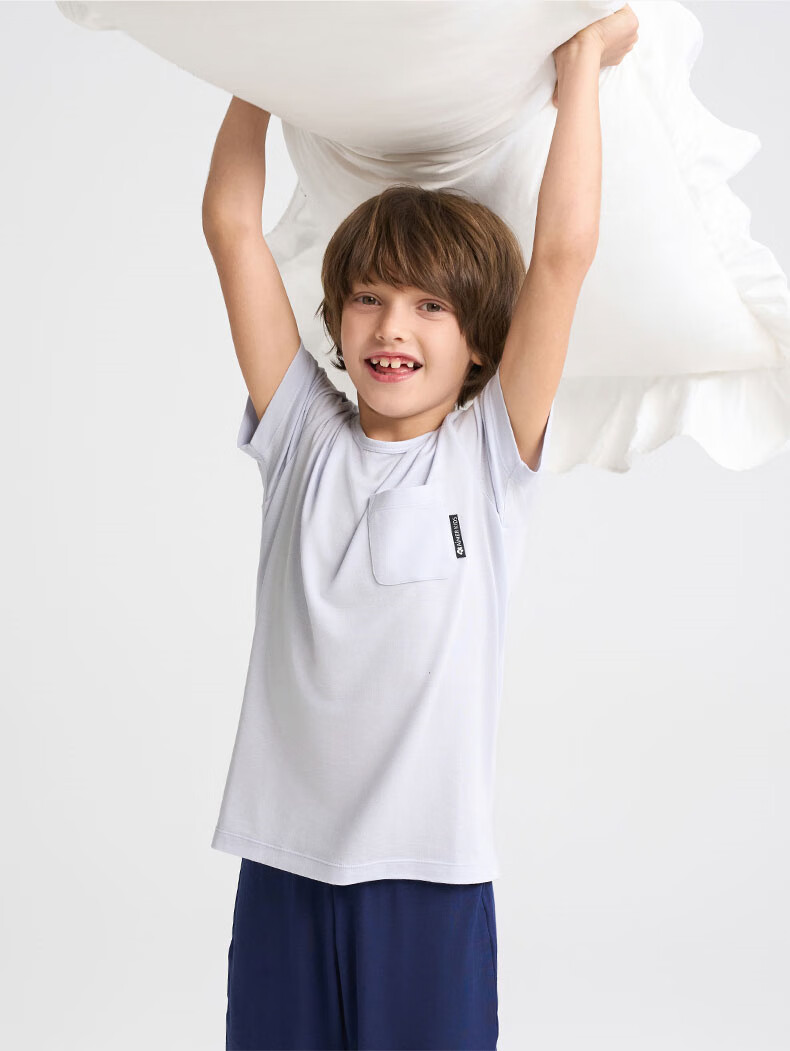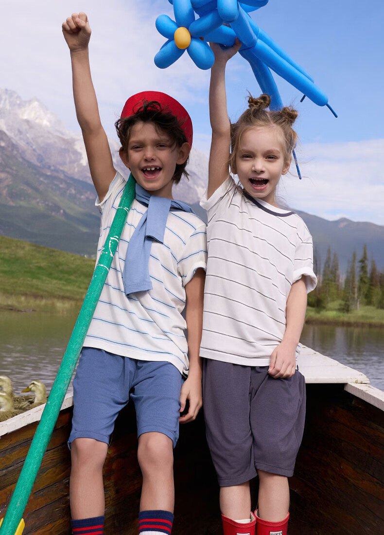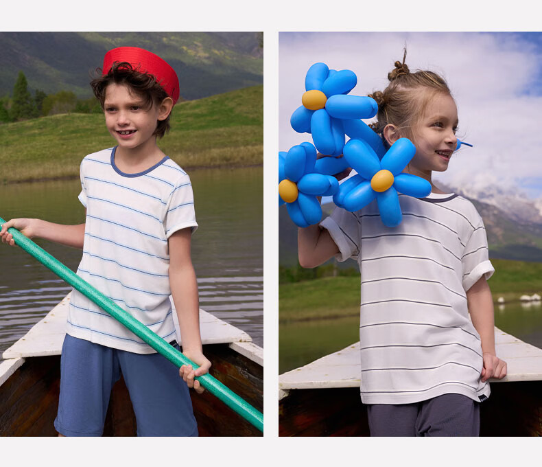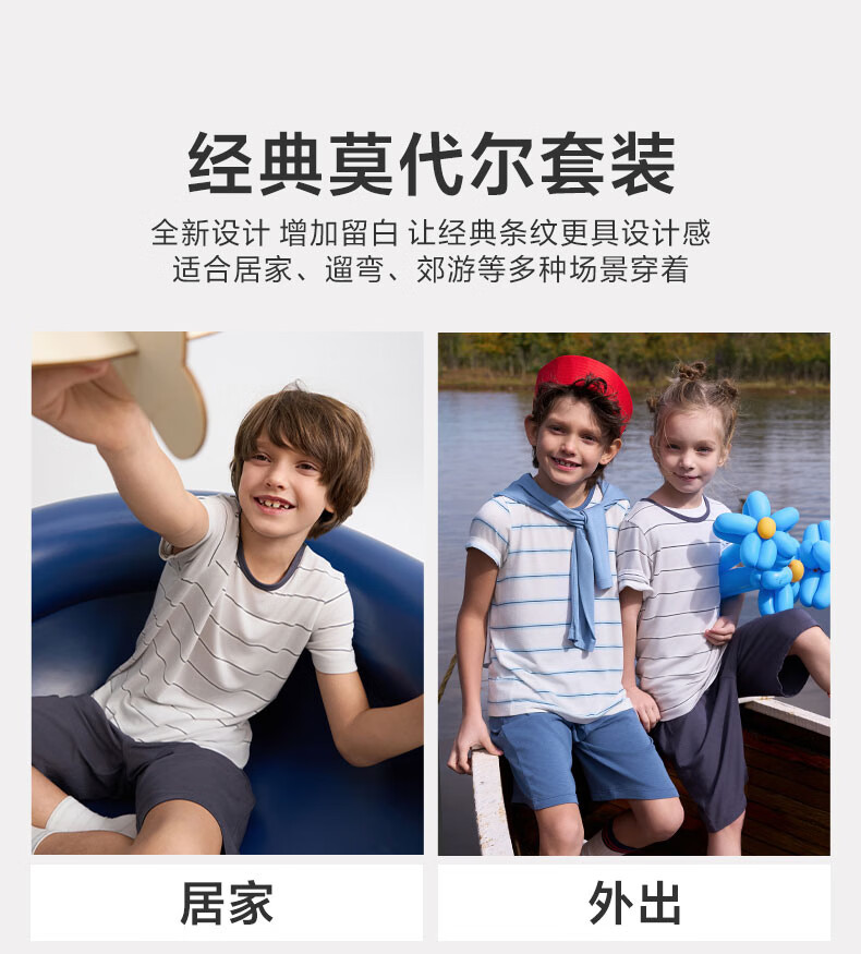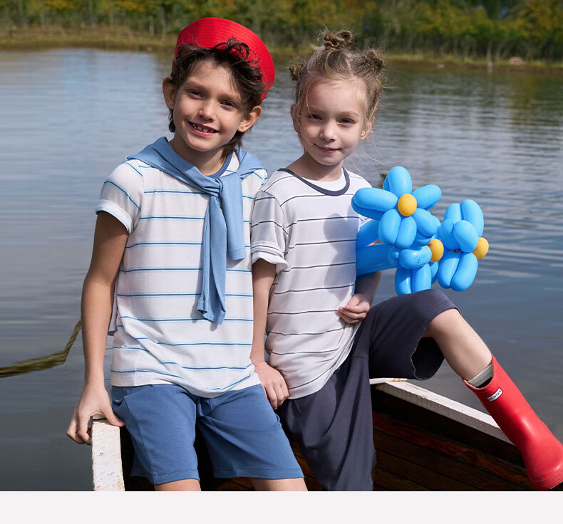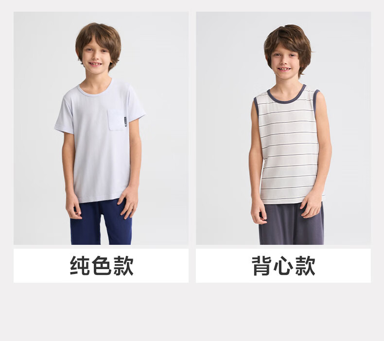 爱慕儿童春新品儿童家居服套装莫代尔男女童短袖上衣/背心五分裤睡衣t恤套 短袖套装-青蓝纹 150 (65-85斤)