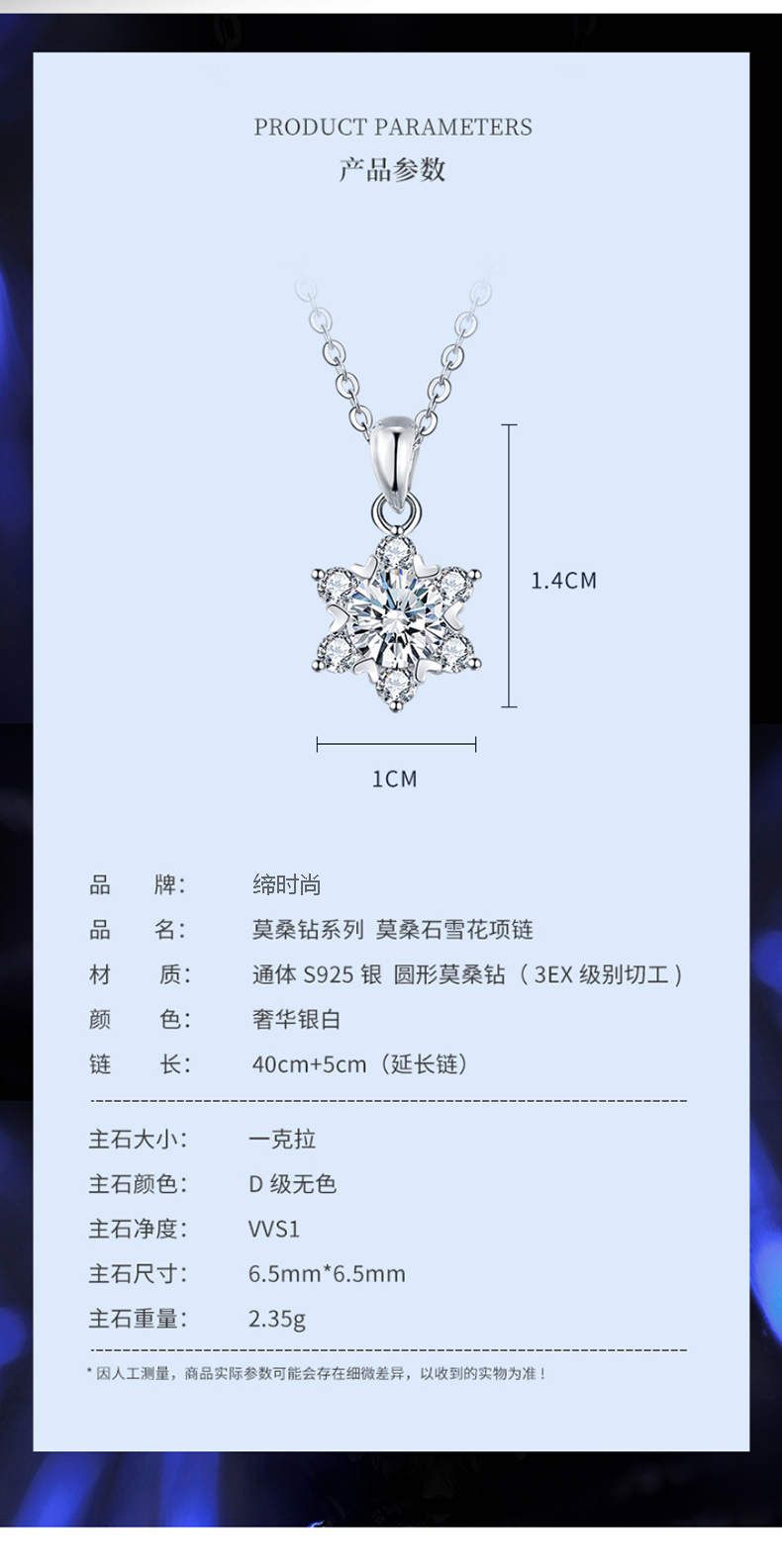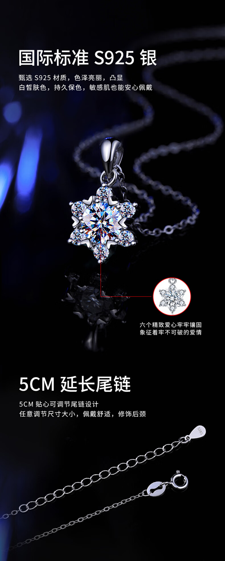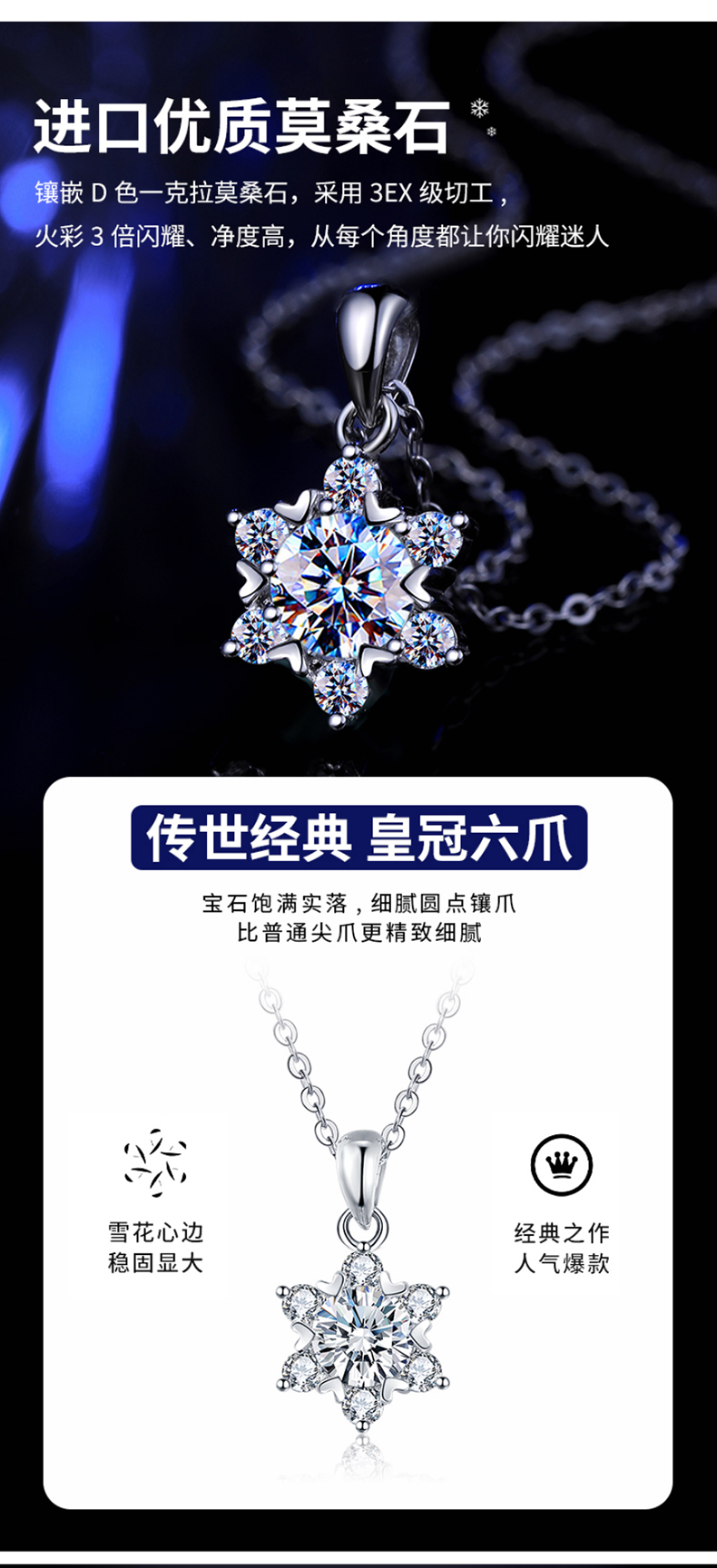 缔时尚六芒星银项链女士莫桑钻石雪花吊坠38妇女女神节礼物送女友老婆 XL010 雪花莫桑钻项链 1克拉