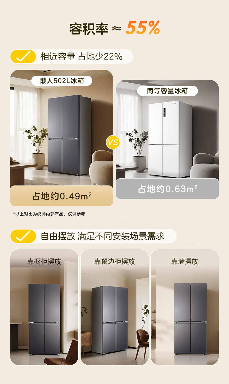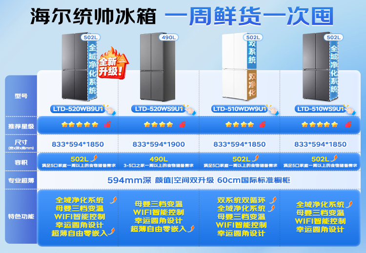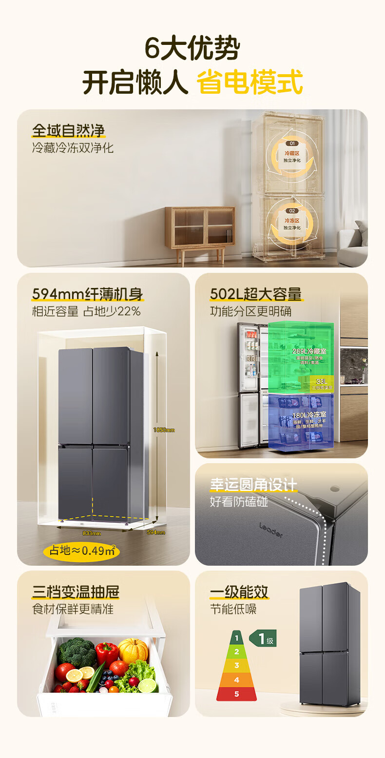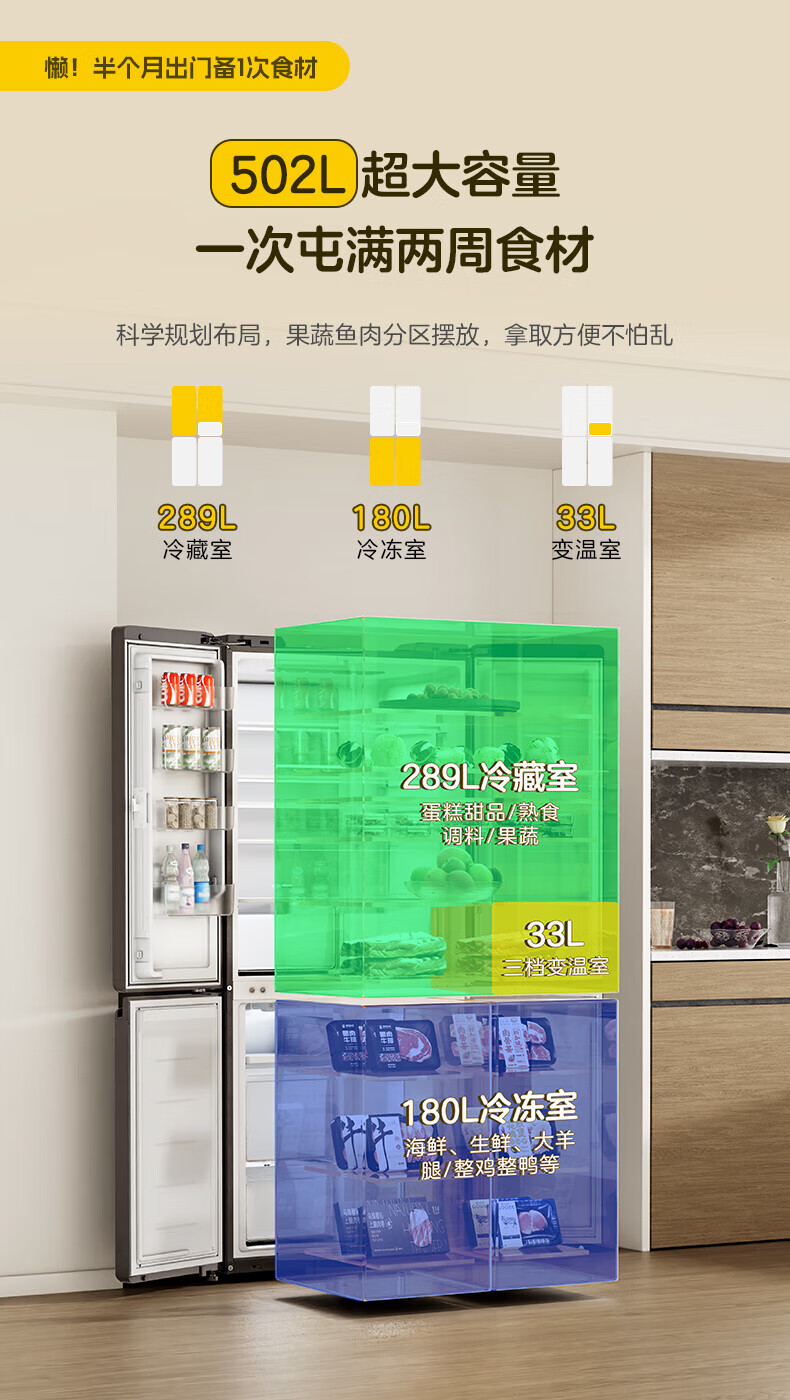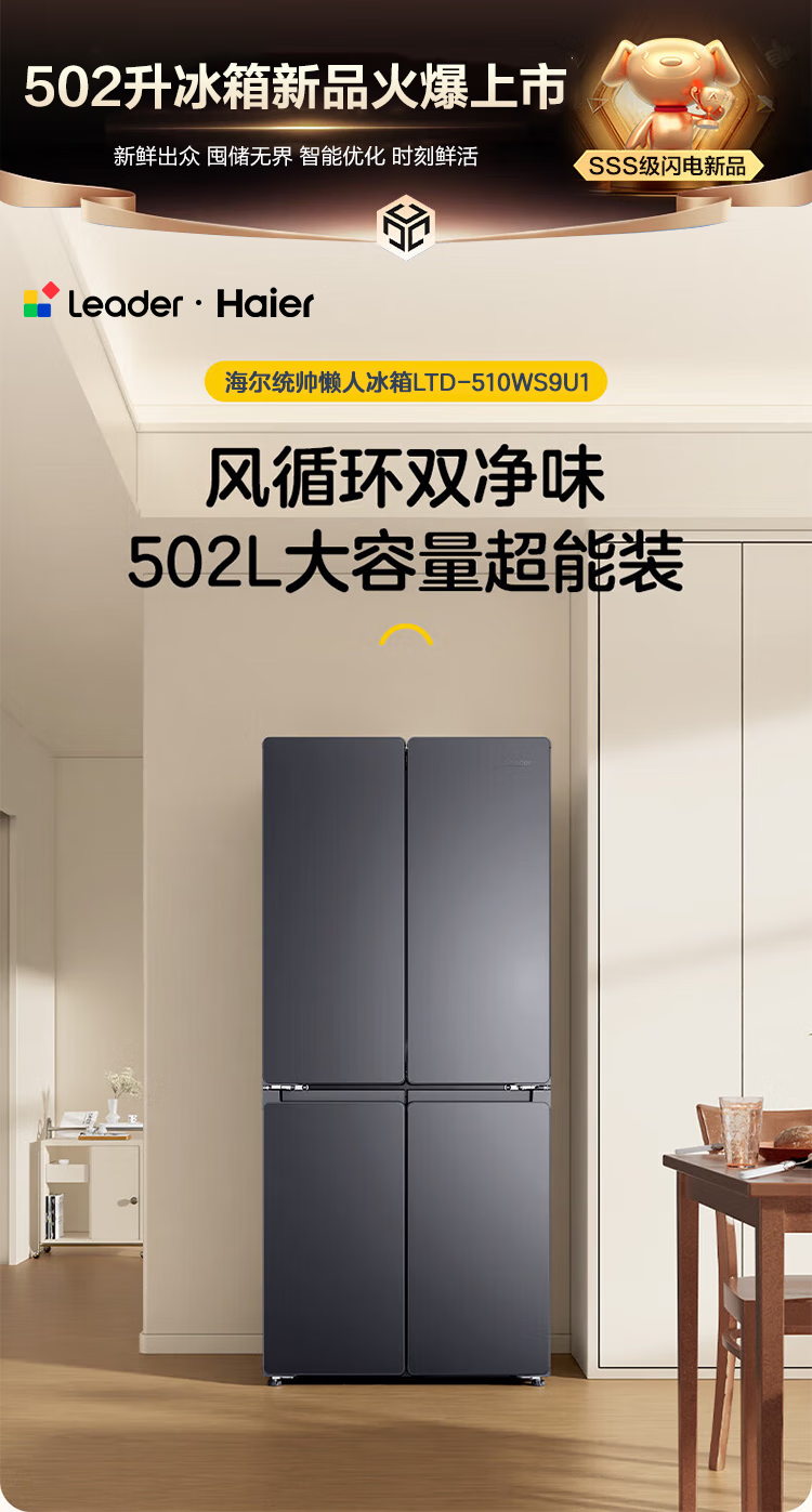 海尔(Haier)冰箱502升十字对开四开门家用大容量双循环超薄可嵌入一级节能双变频家电国家补贴统帅510懒人系列 502L星蕴银+全空间净味+双循环+变温储鲜