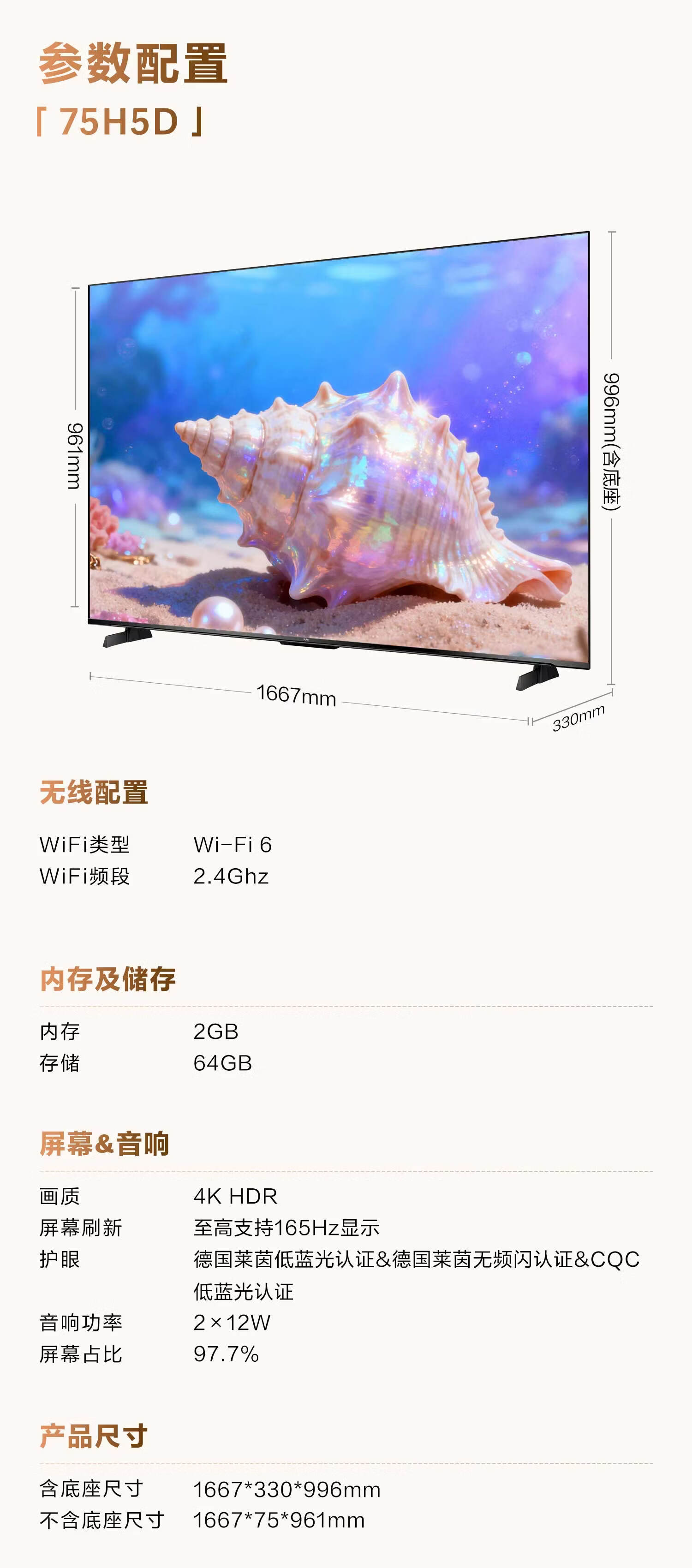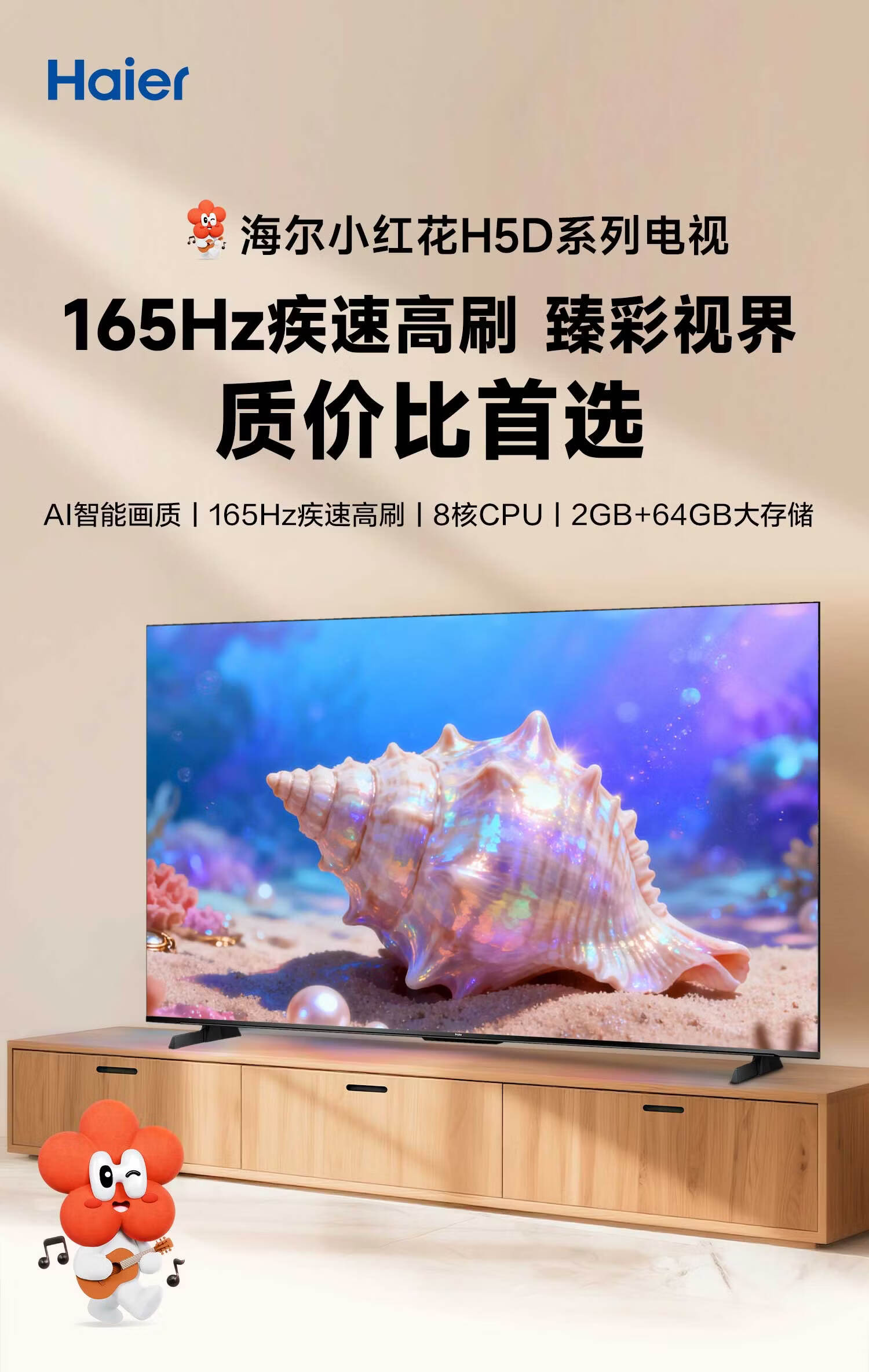 海尔【小红花电视-绽放版】品质款电视75H5D 75英寸165Hz 110%高色域64GB 4K游戏护眼1级能效H5C升级版