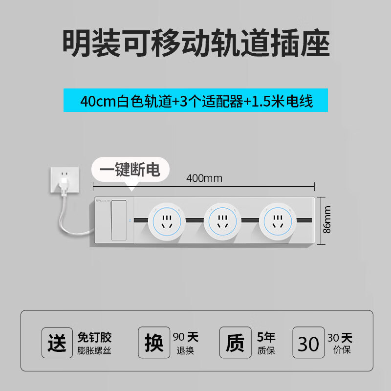 小米有品带线插头轨道插座一键断电开关智能控制双断开关滑轨电力明装插座 白色40公分轨道3个五孔送1.5米电