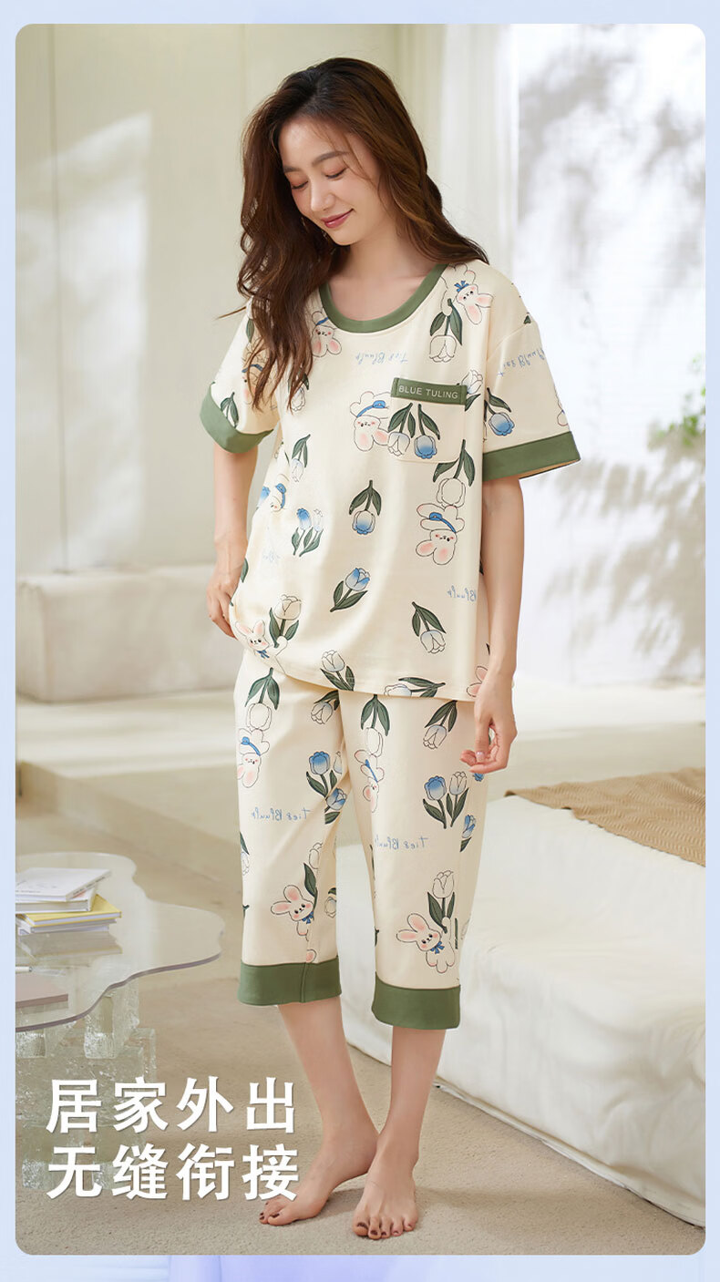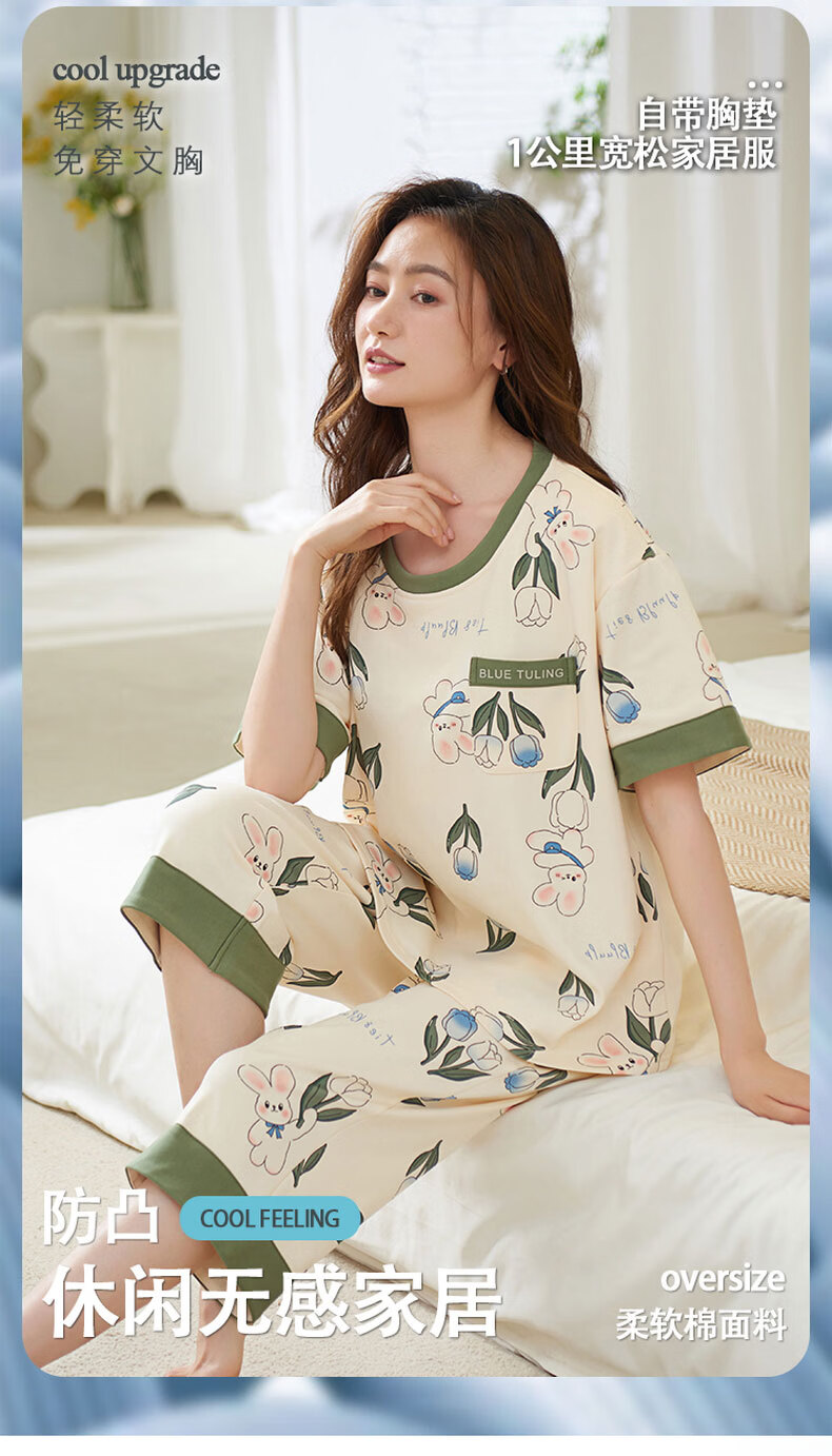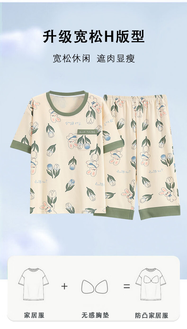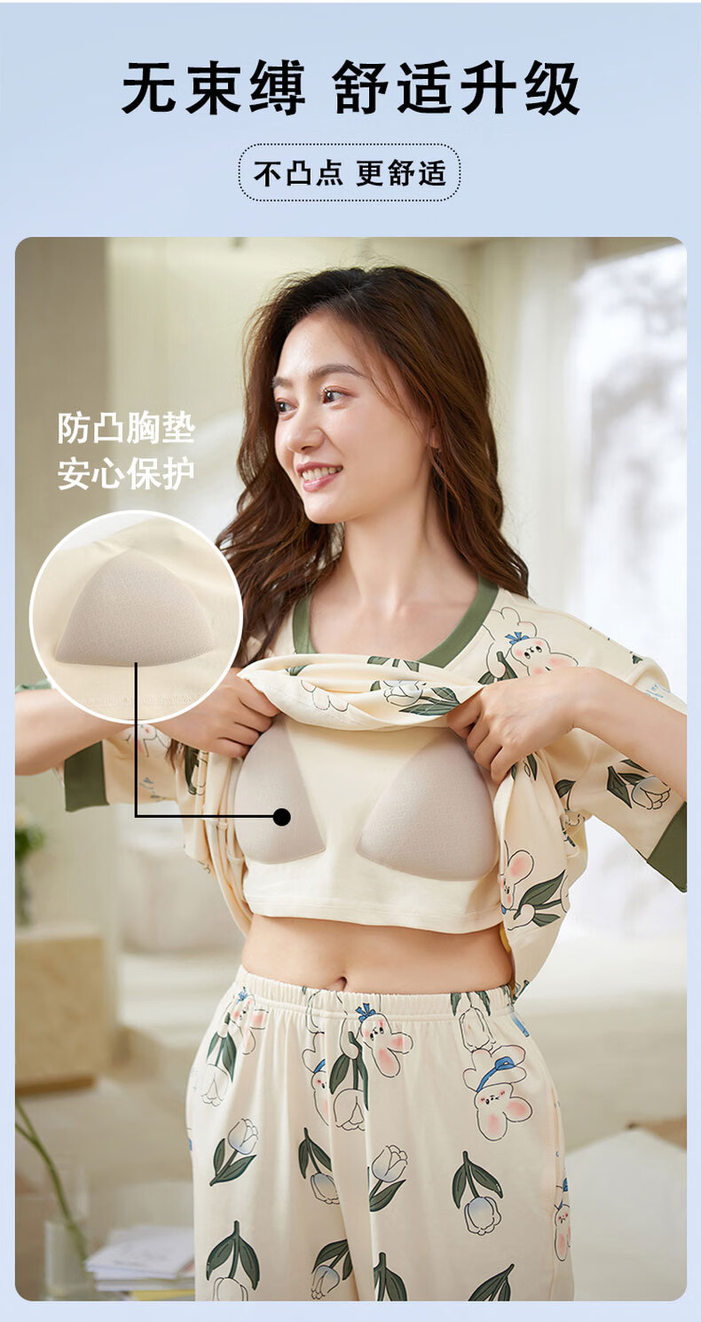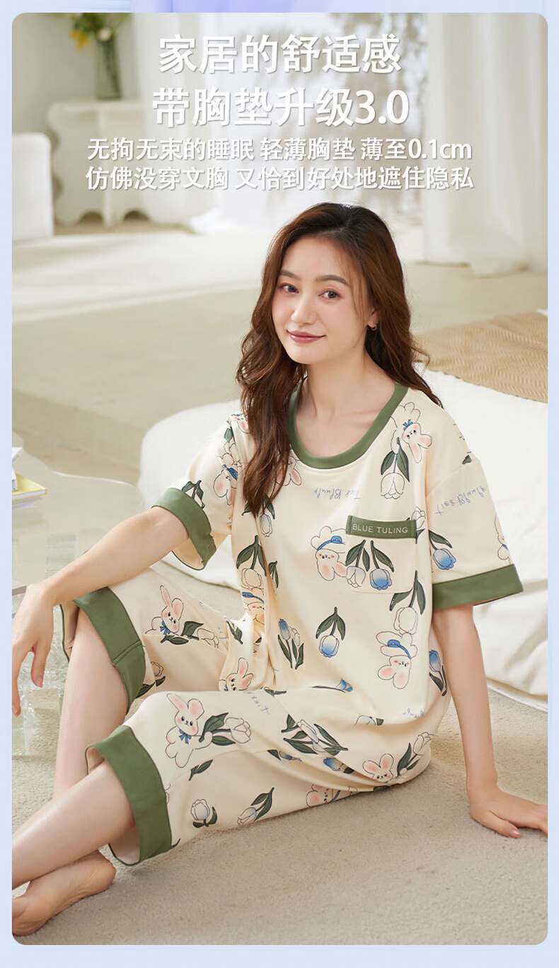 芬腾可安(FENTENGCARE)自带胸垫睡衣女士夏天短袖七分裤套装两件套休闲薄款可外穿家居服 M41042 L