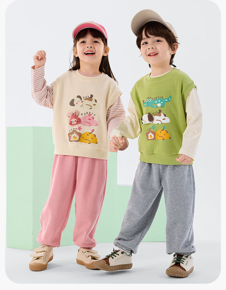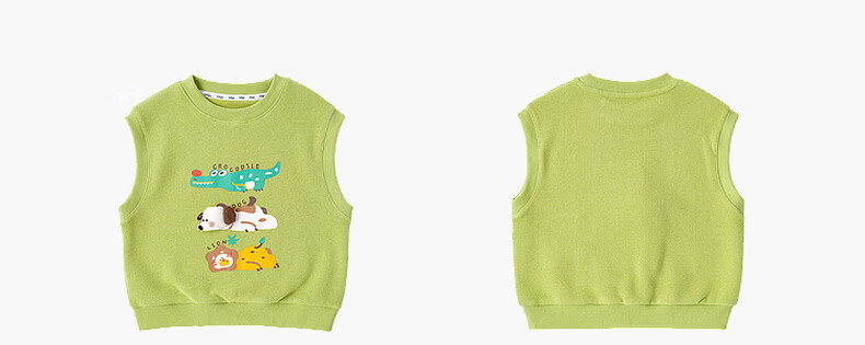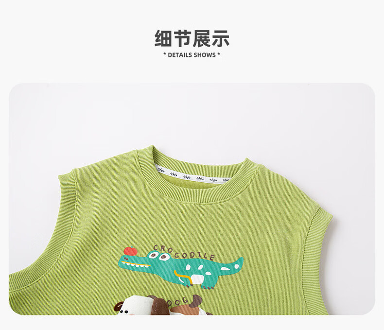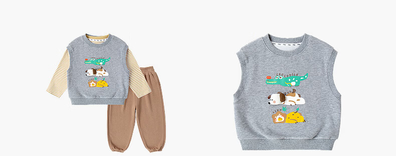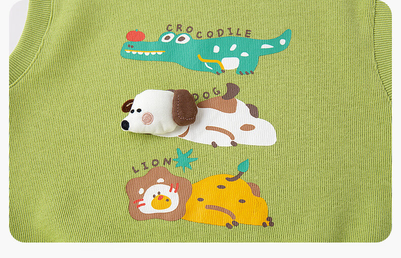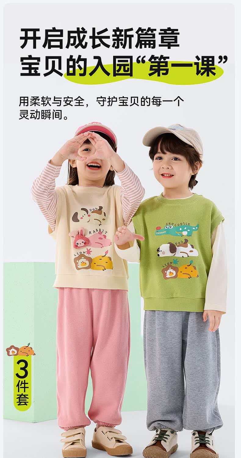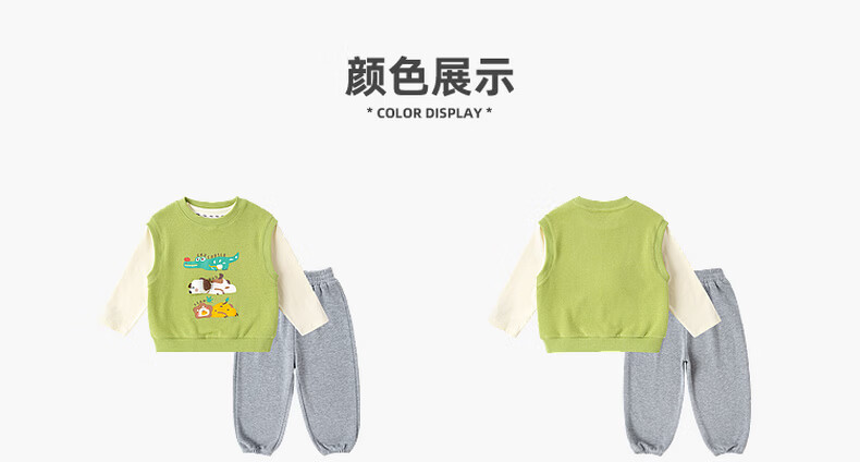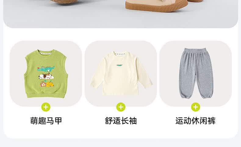 嘟嘟家儿童春季长袖套装男童百搭三件套春装女童透气打底衫休闲卡通马甲 牛油果绿 100