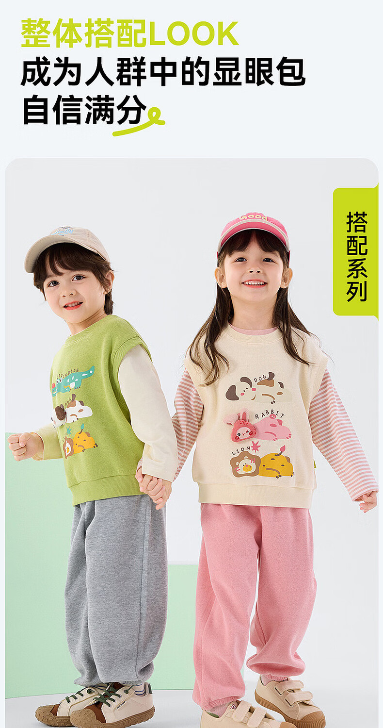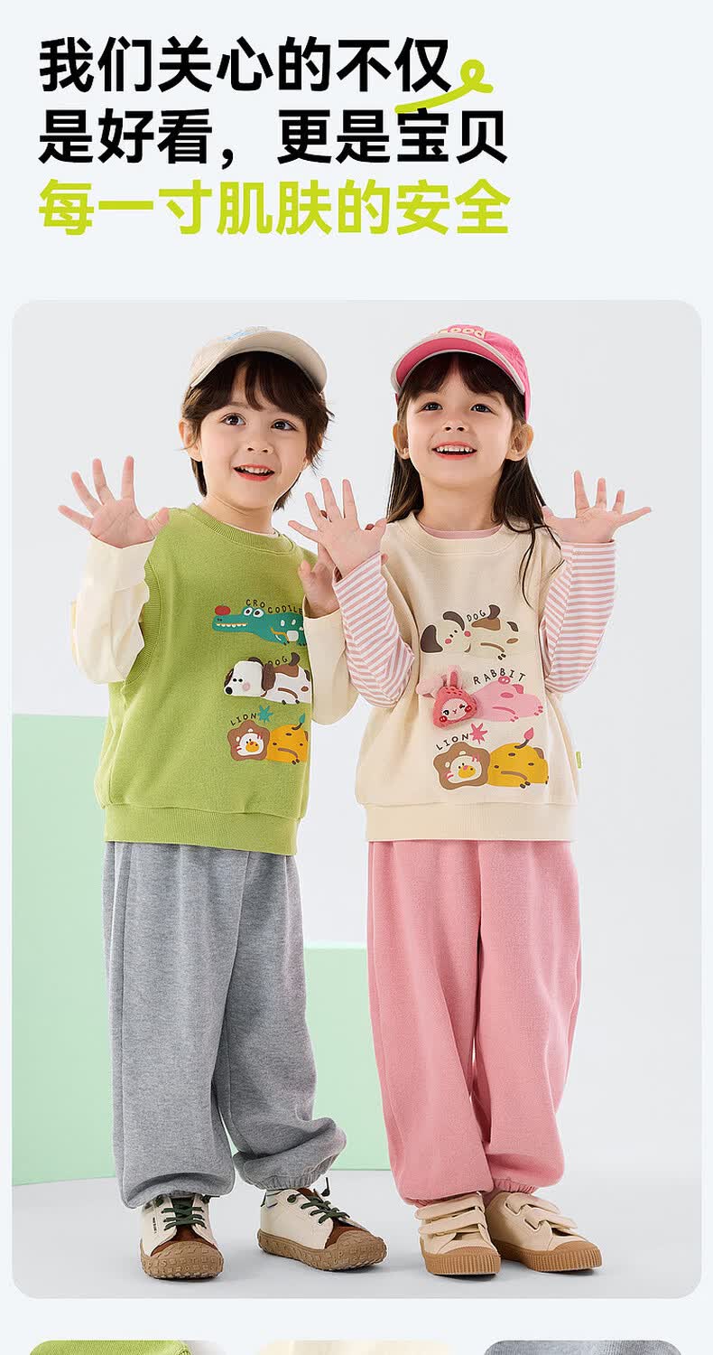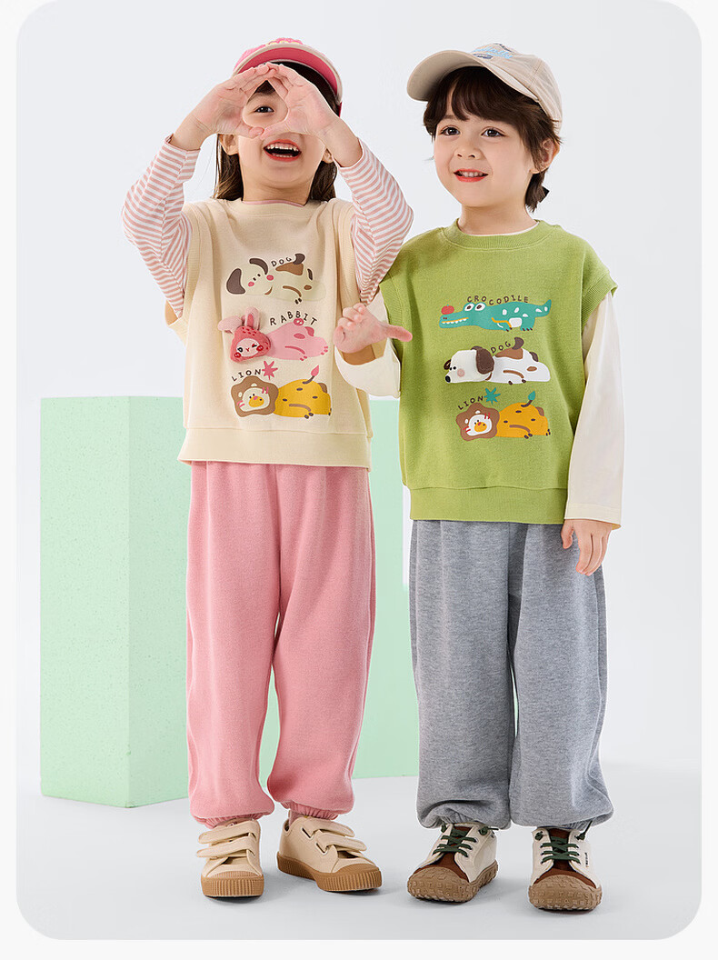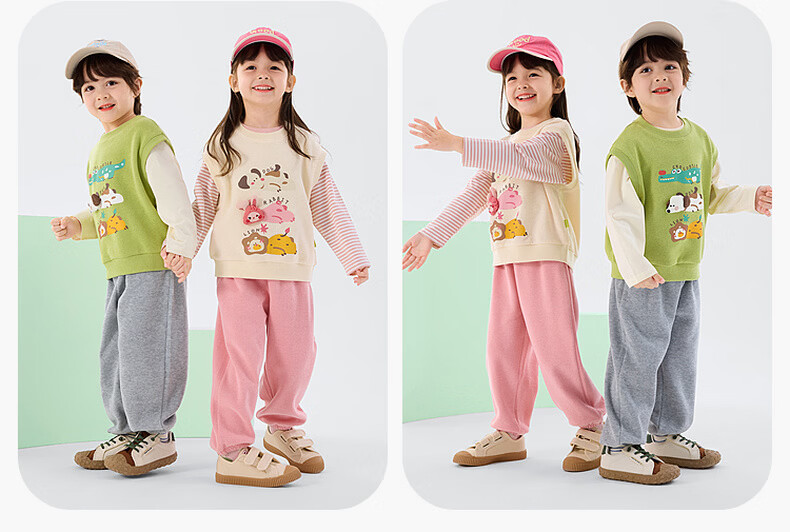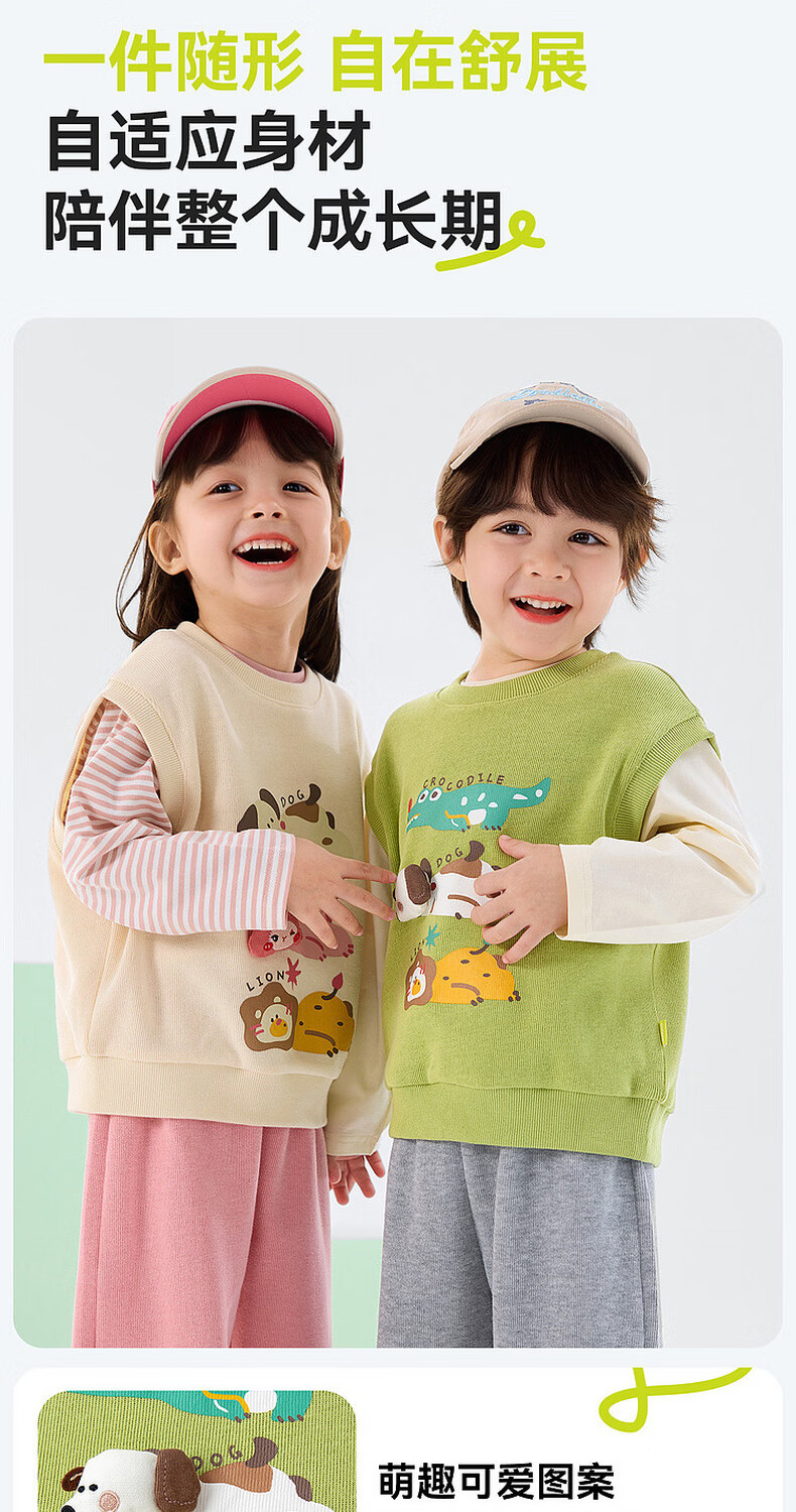 嘟嘟家儿童春季长袖套装男童百搭三件套春装女童透气打底衫休闲卡通马甲 牛油果绿 100