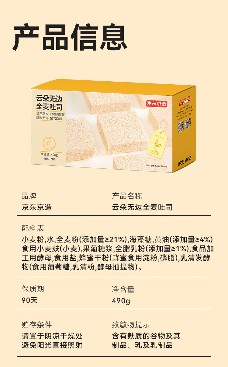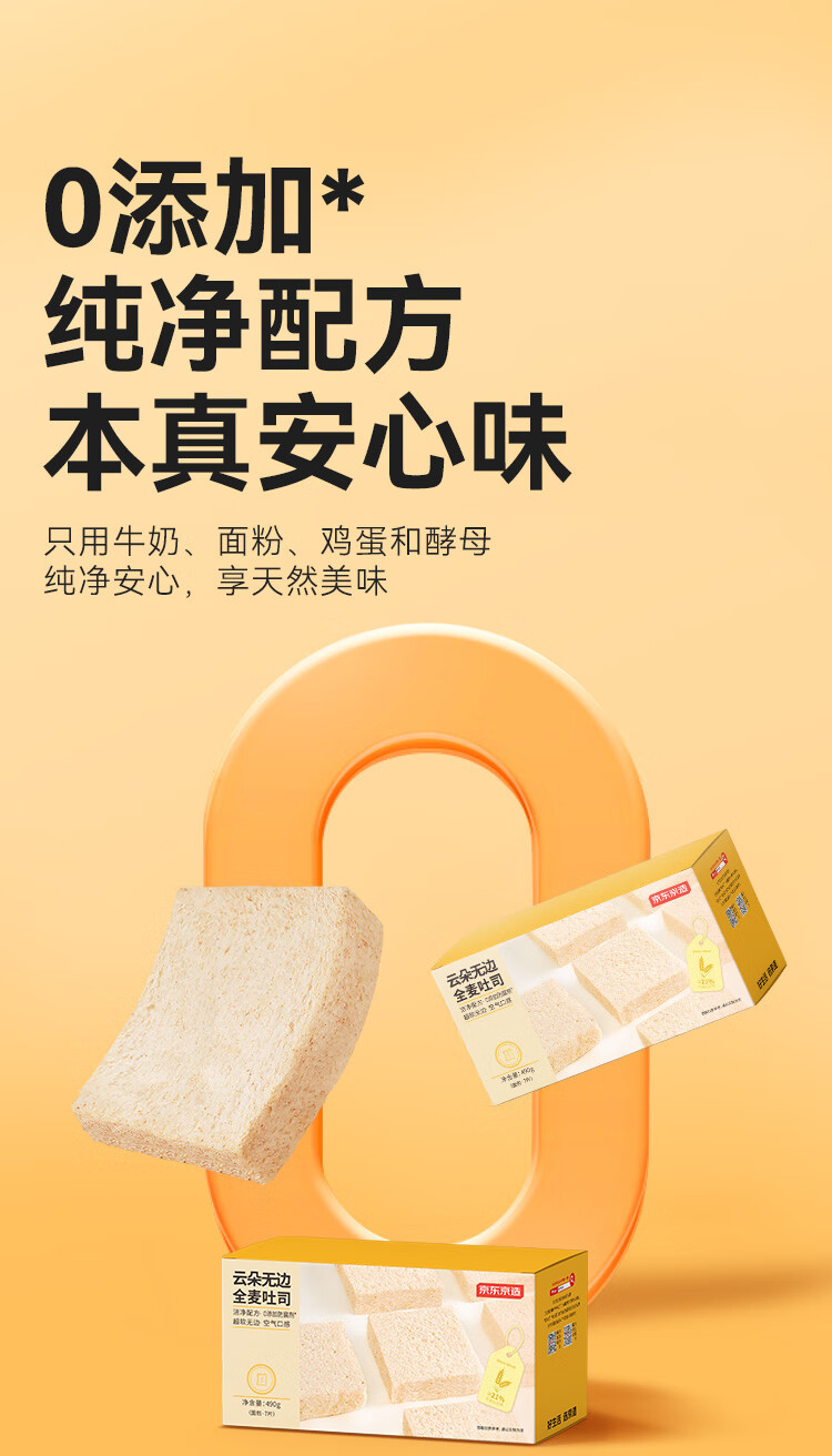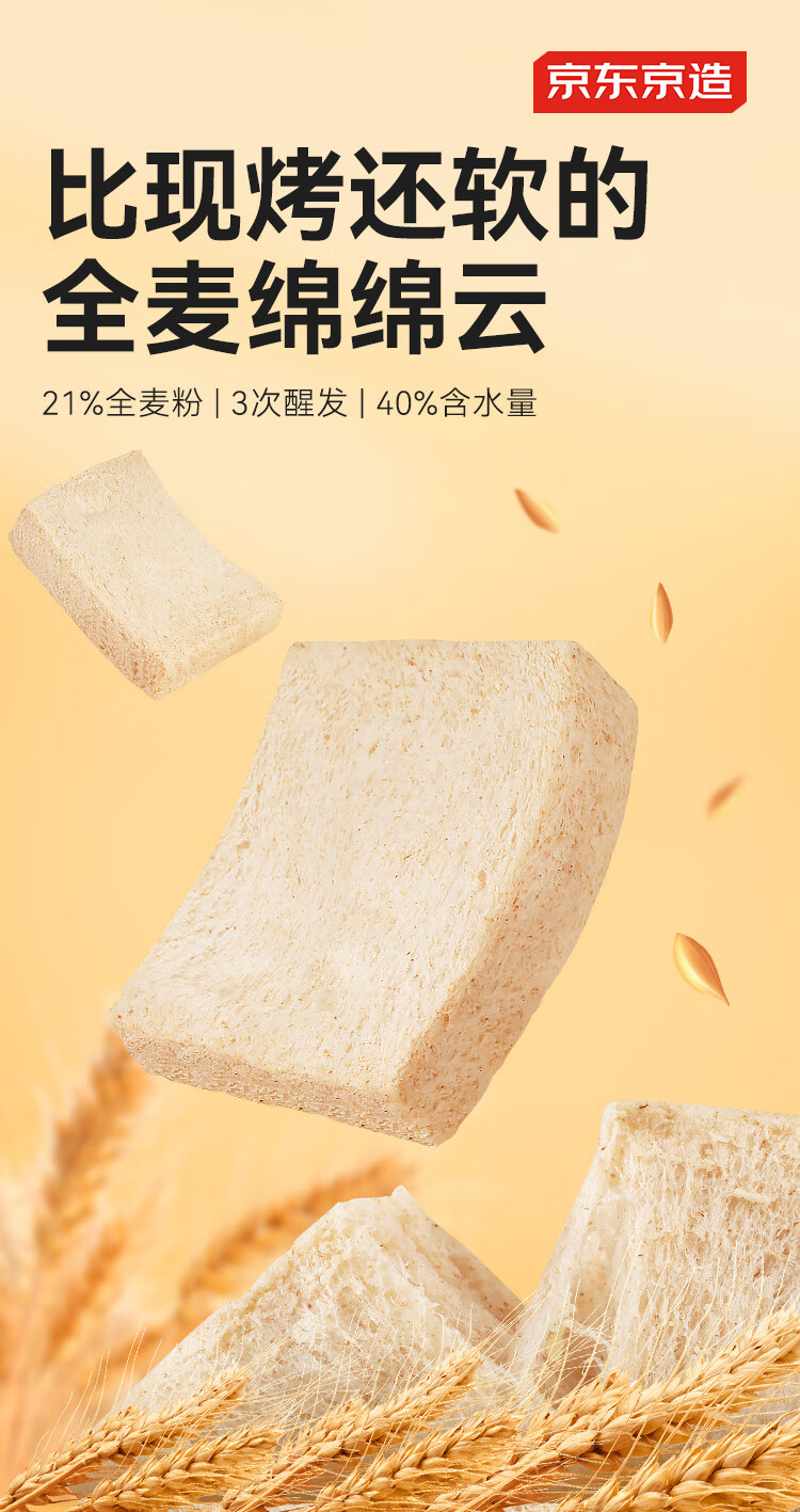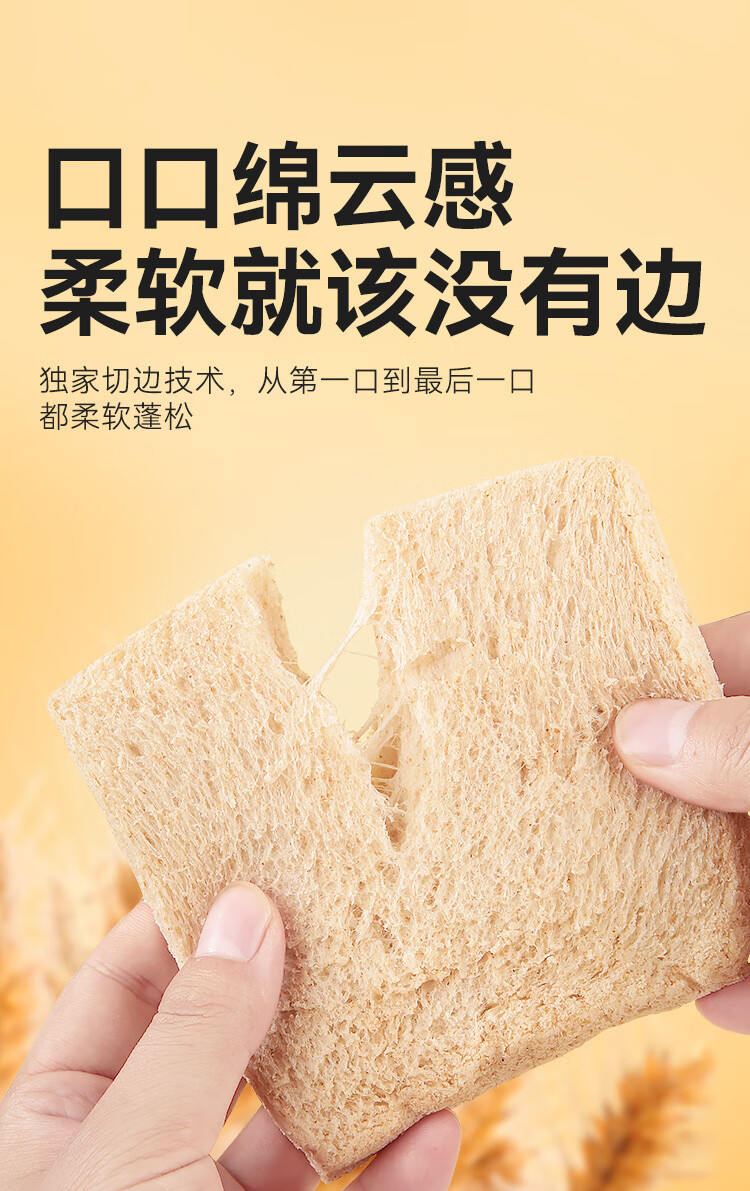 京东京造云朵无边厚切全麦吐司490g面包早餐糕点充饥代餐零食0添加防腐剂
