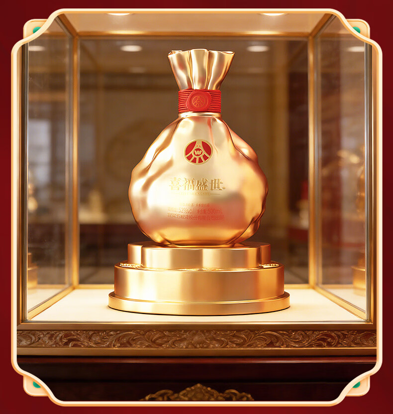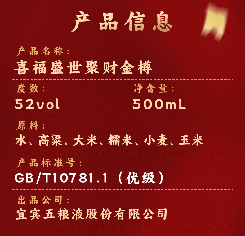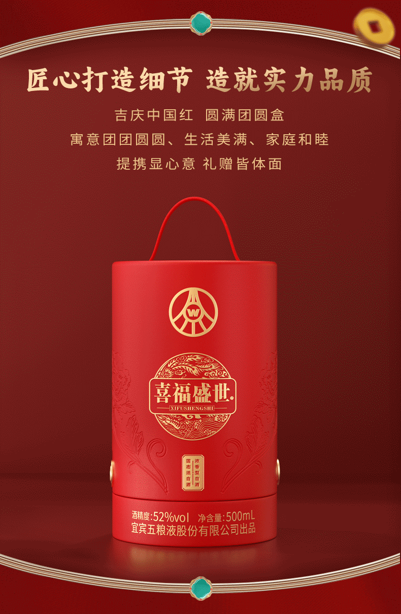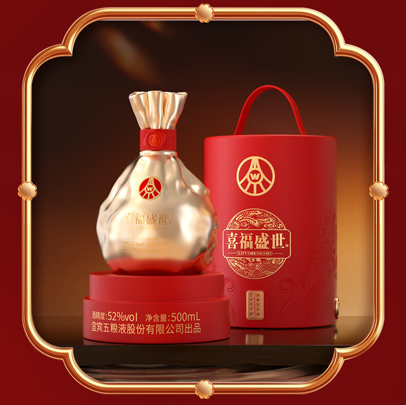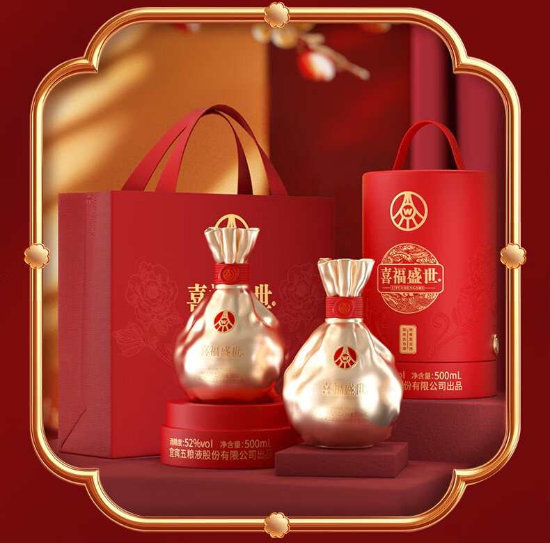五粮浓香五粮液股份出品 官方授权 浓香型优级白酒 喜福盛世 52度 500mL 2瓶 聚财金樽双支装