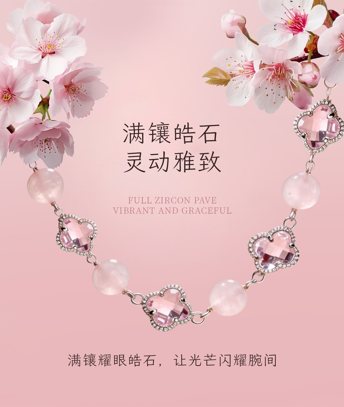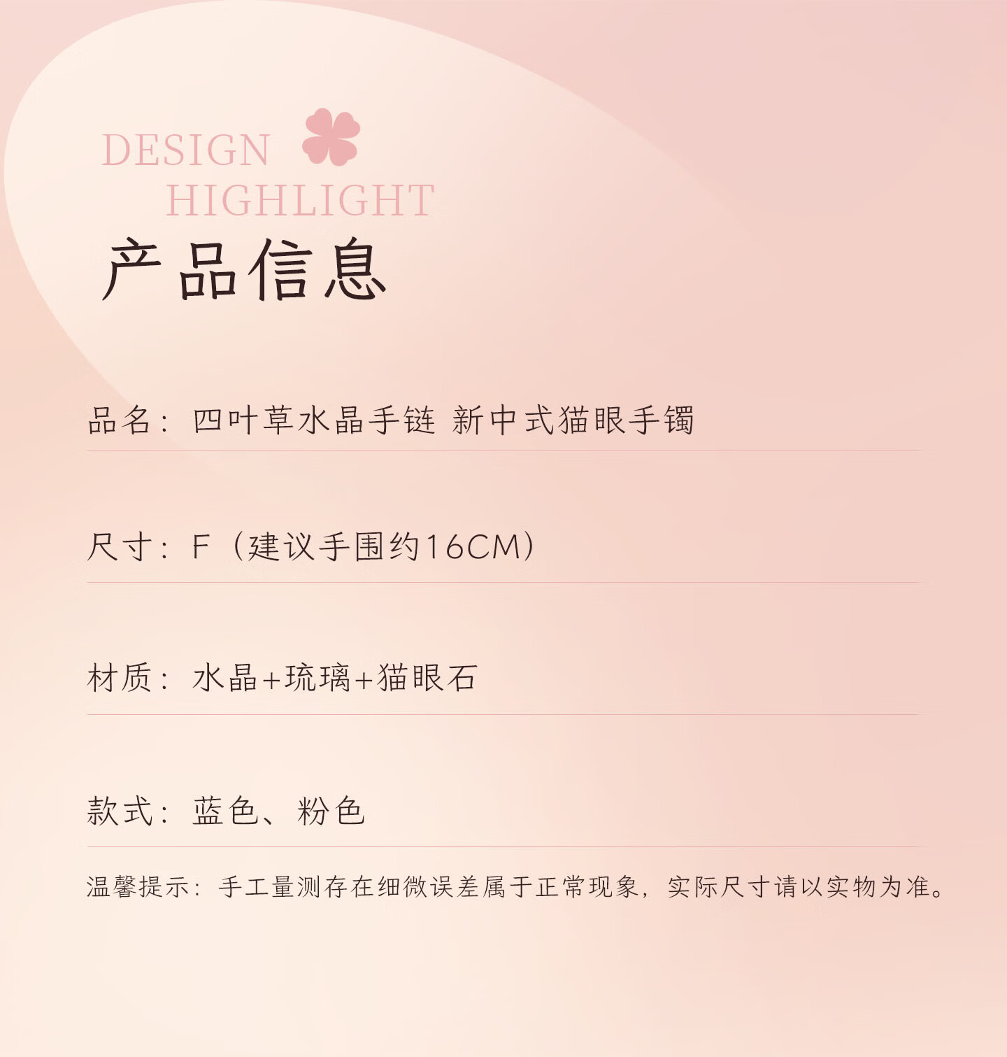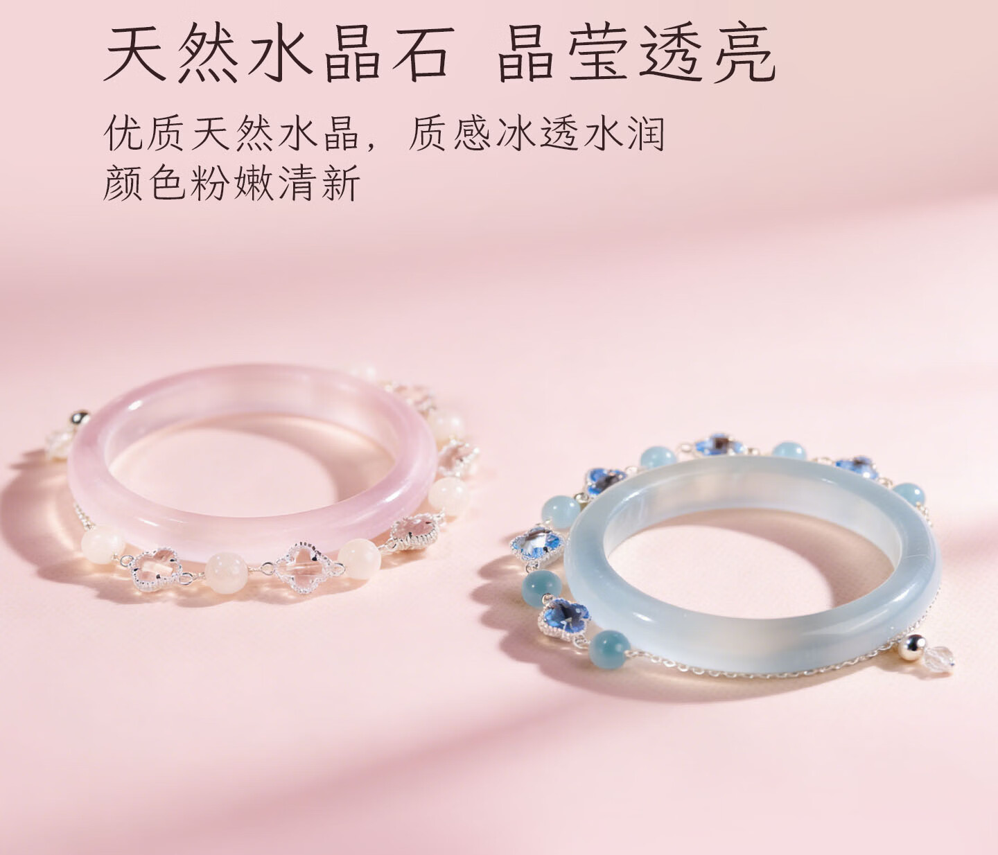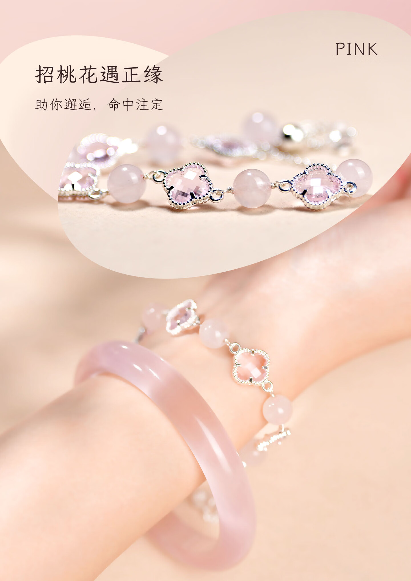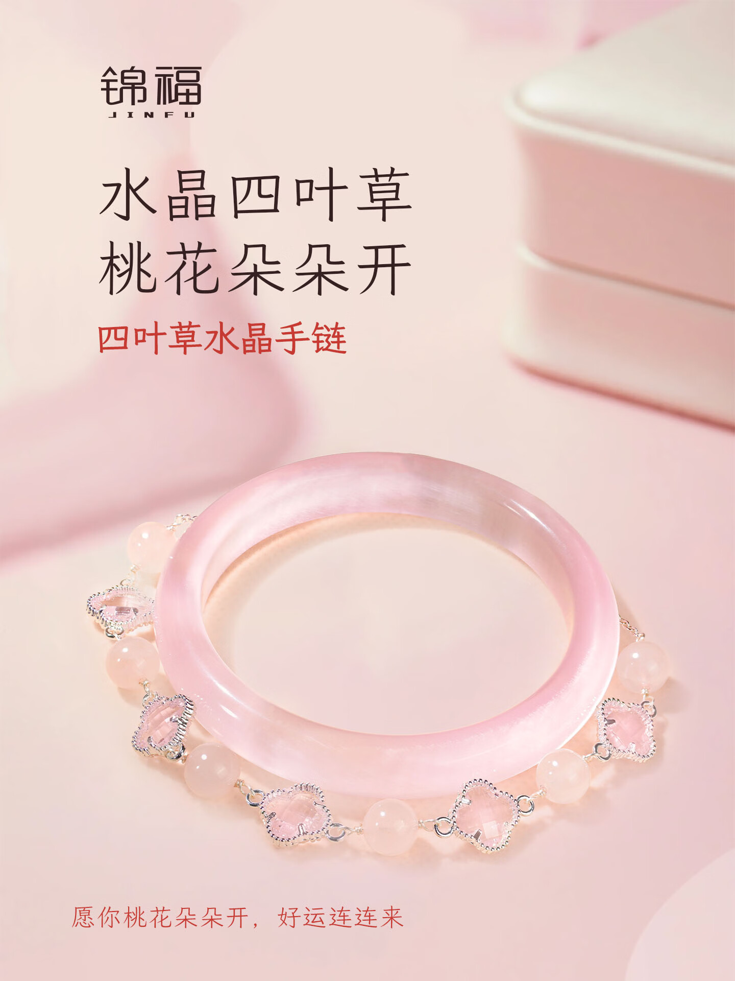 锦福峨眉山粉色水晶四叶草手链手镯可爱款闺蜜同款送女友必备 桃缘双萦镯链组合+鸿运礼盒 54(适合75-85斤)
