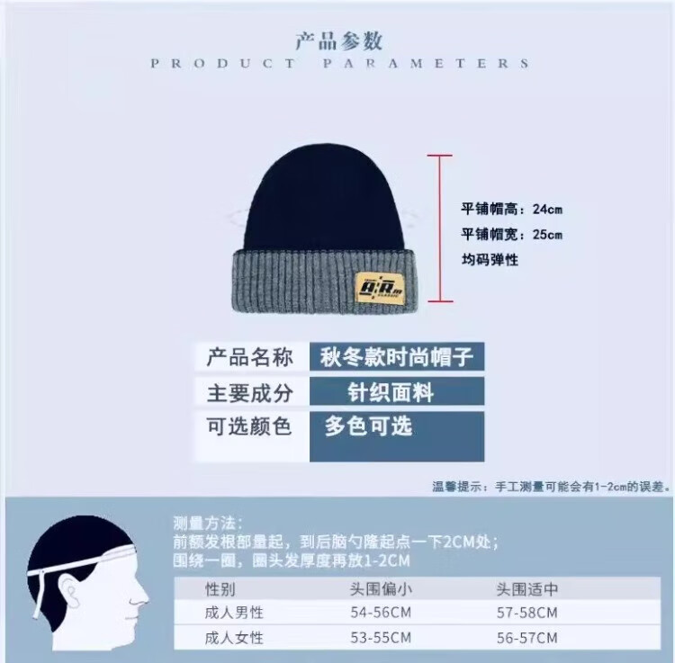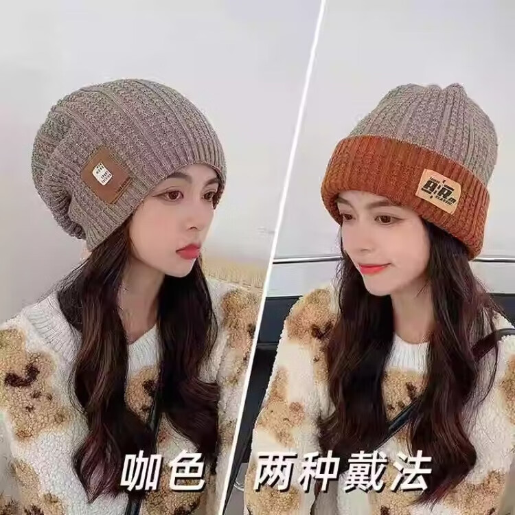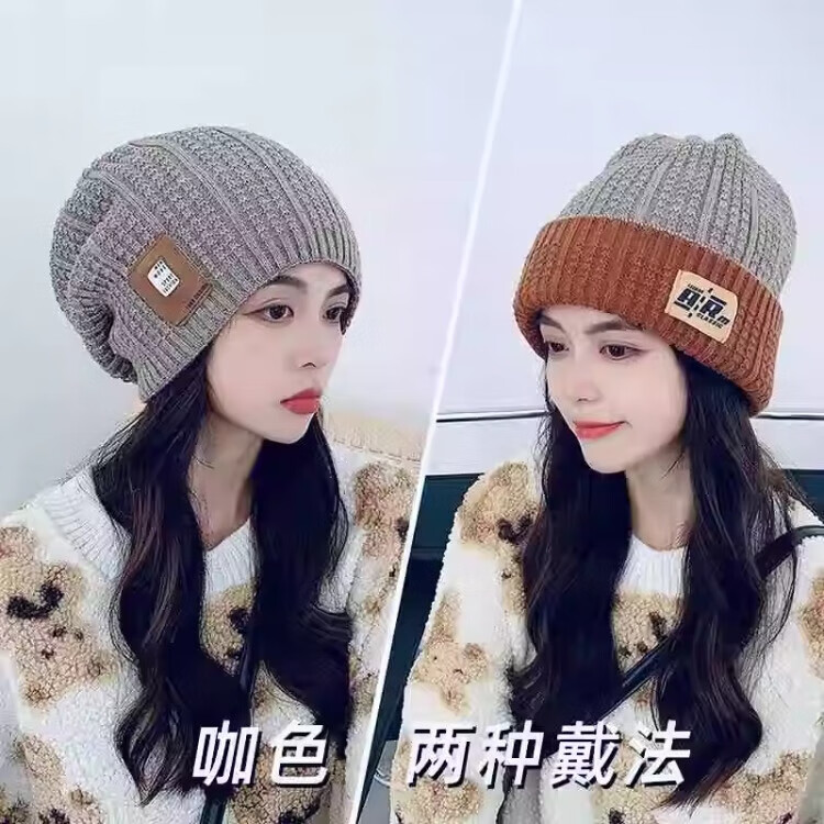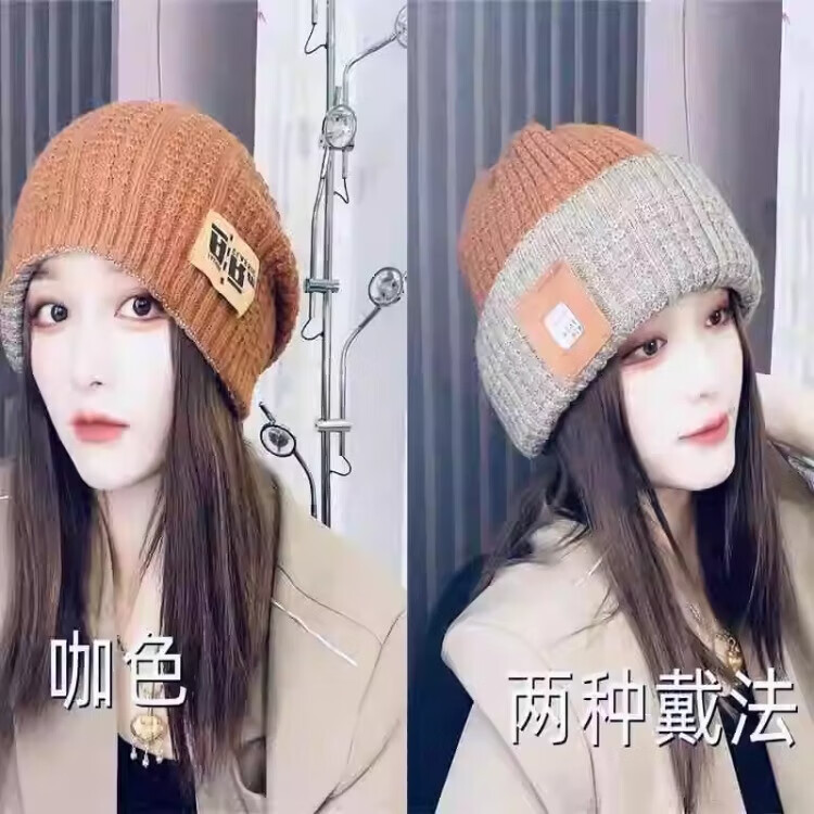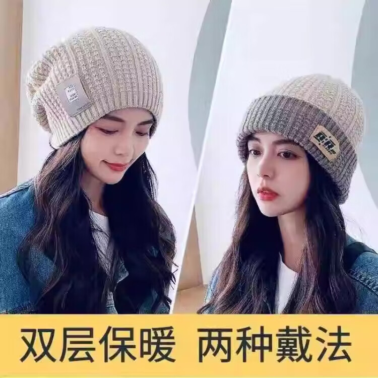 朋意冬季时尚针织女帽保暖护耳双面大头围针织月子帽毛线冷帽堆堆帽子 双面针织帽-灰色-1个(袋装) 无规格