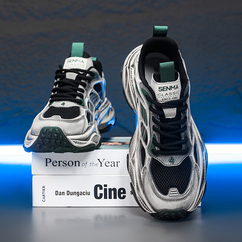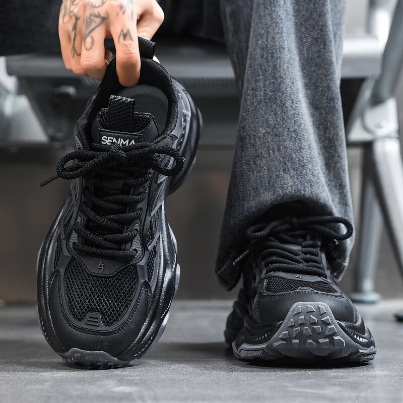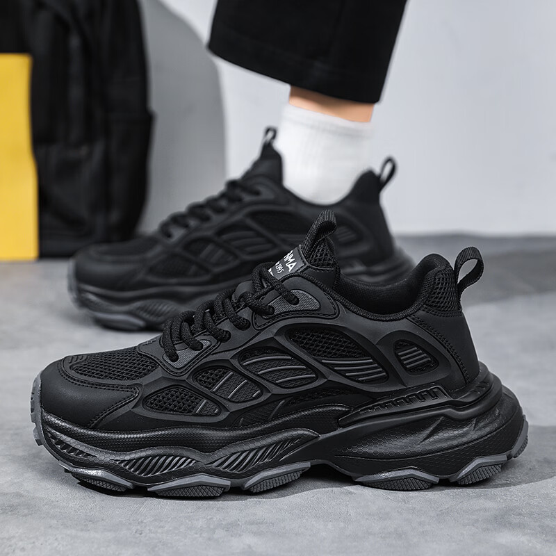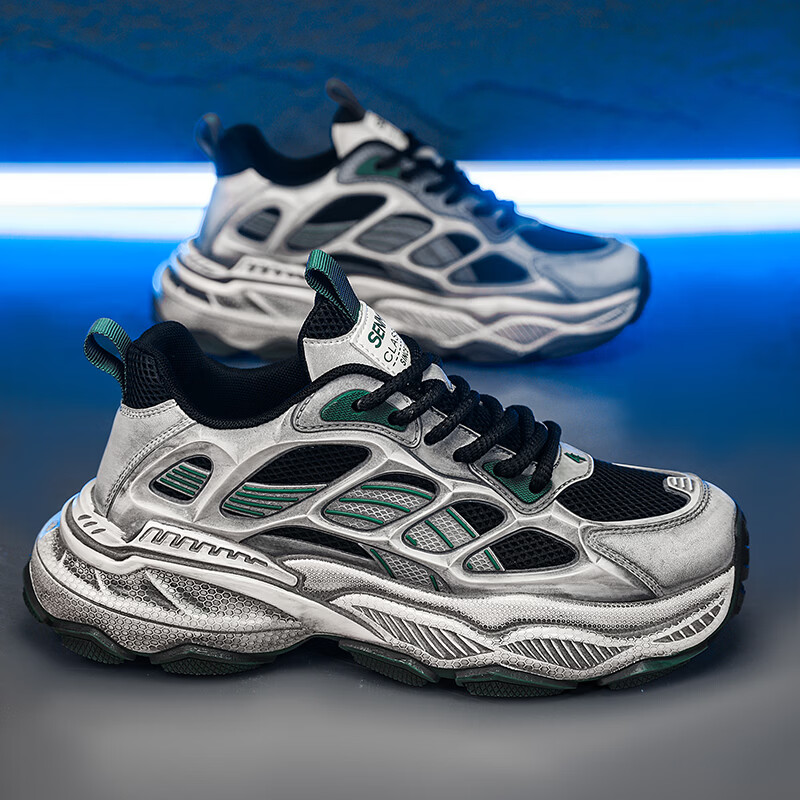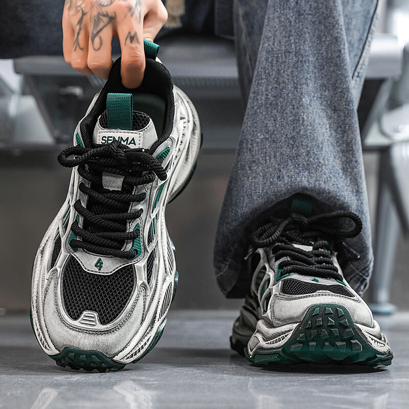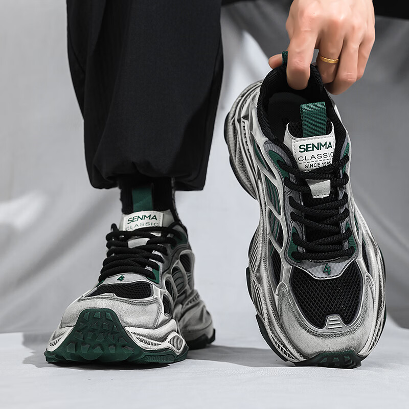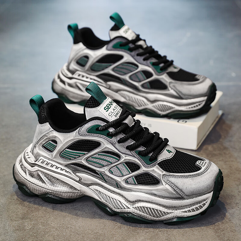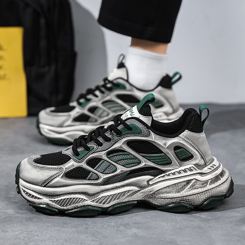 森馬男鞋2026新款春季潮流百搭休闲运动跑步鞋青少年厚底防滑老爹潮鞋 黑绿【基础款】 39 标准码数/现货秒发