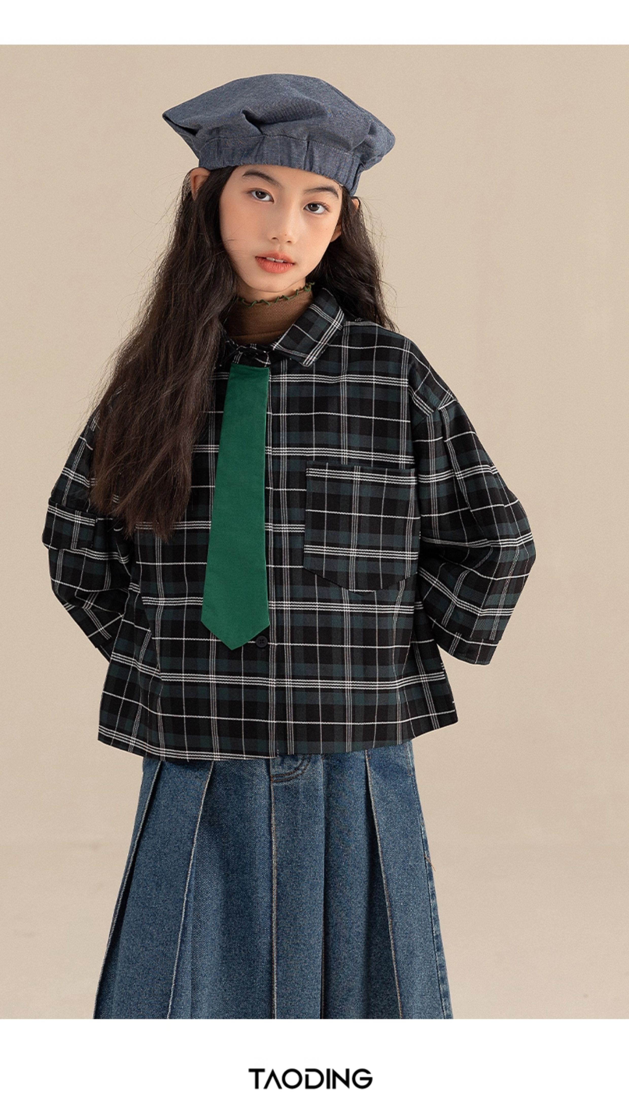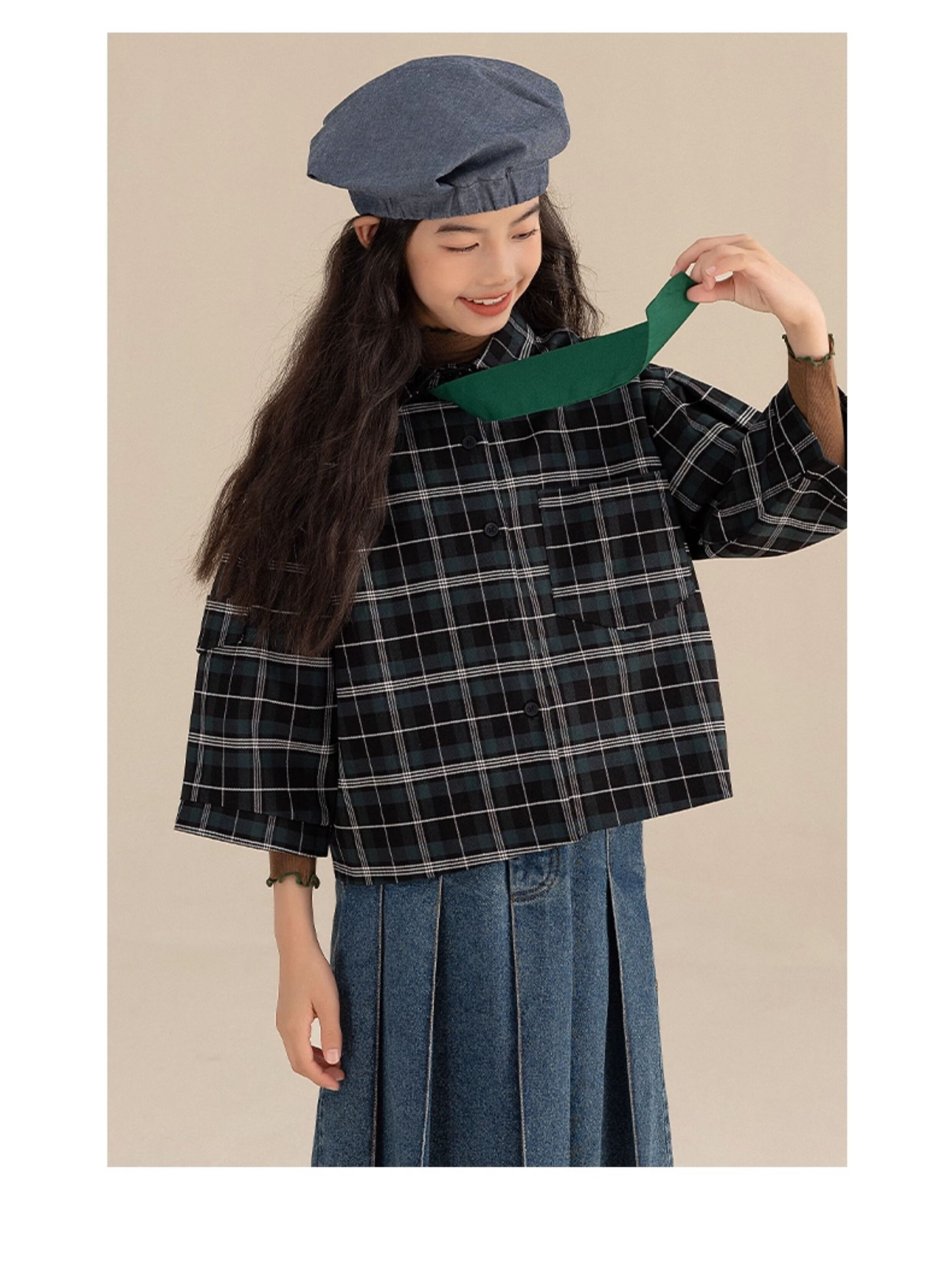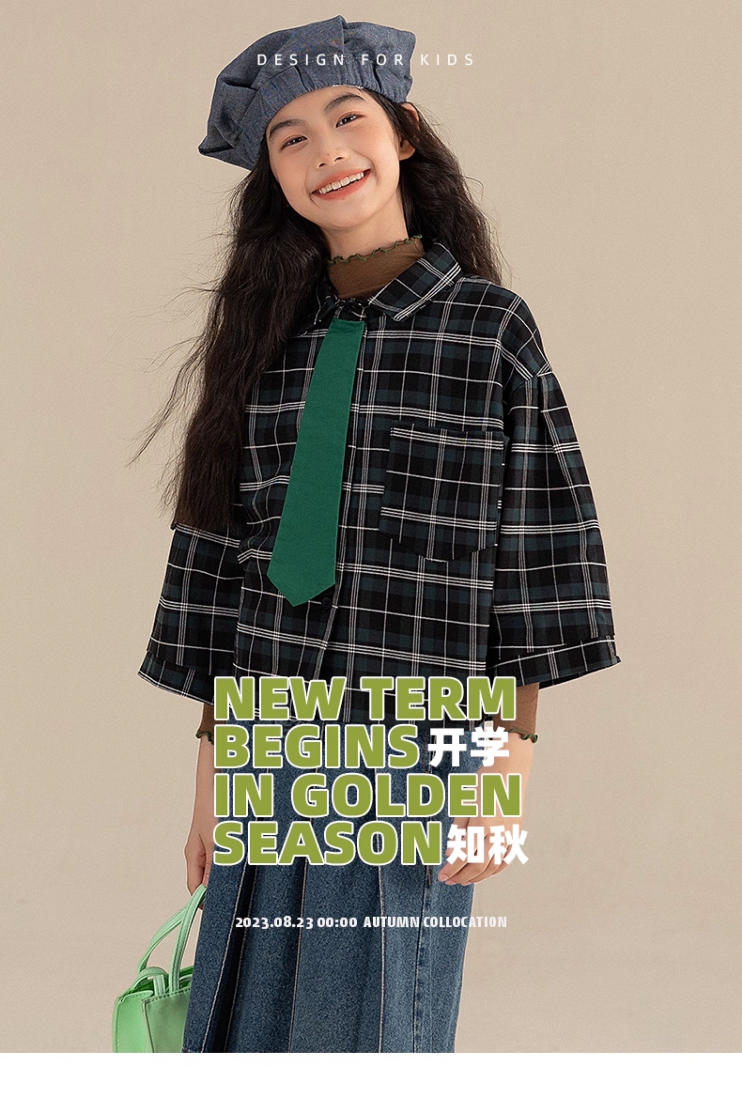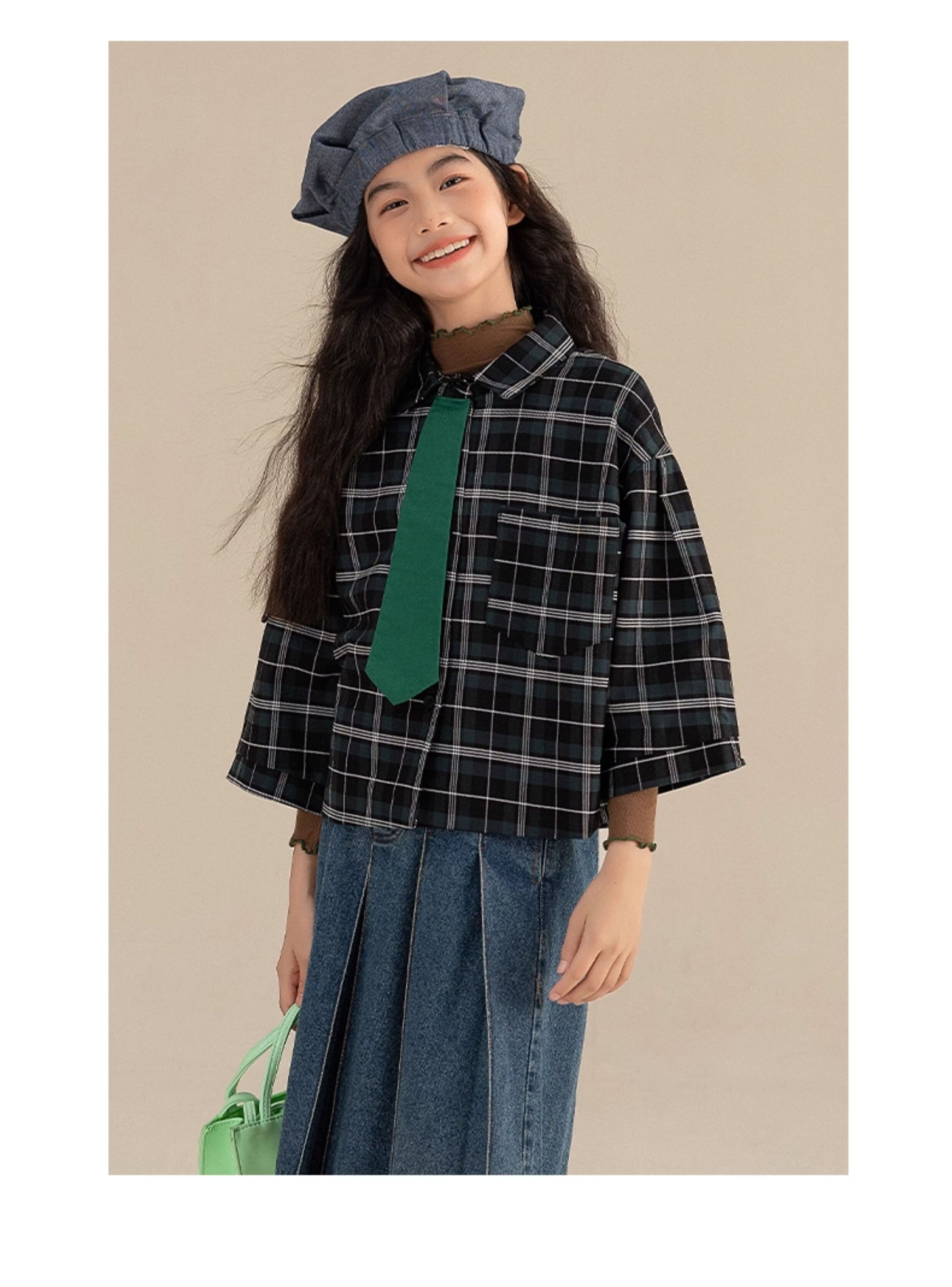 淘町女童衬衫七分袖春秋新款中大童百搭墨绿格子韩版宽松学院衬衣 墨绿 160