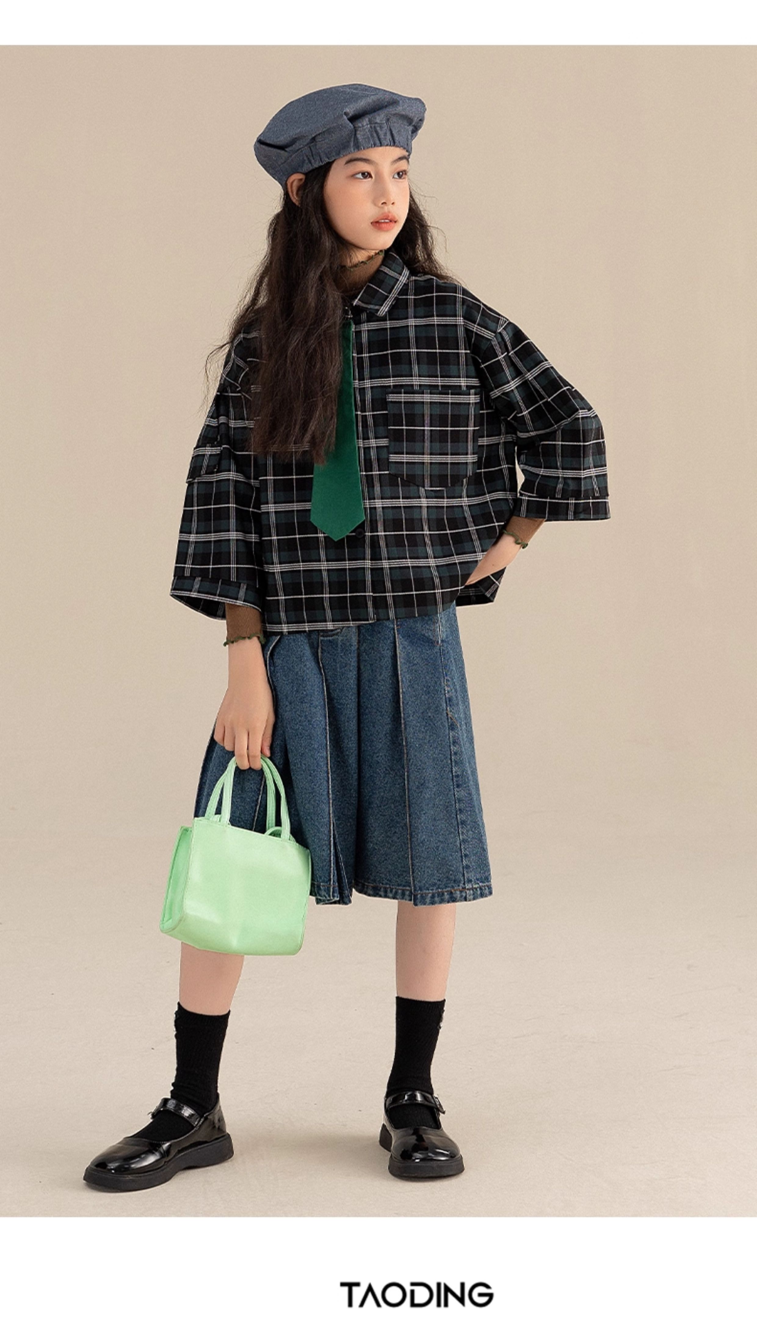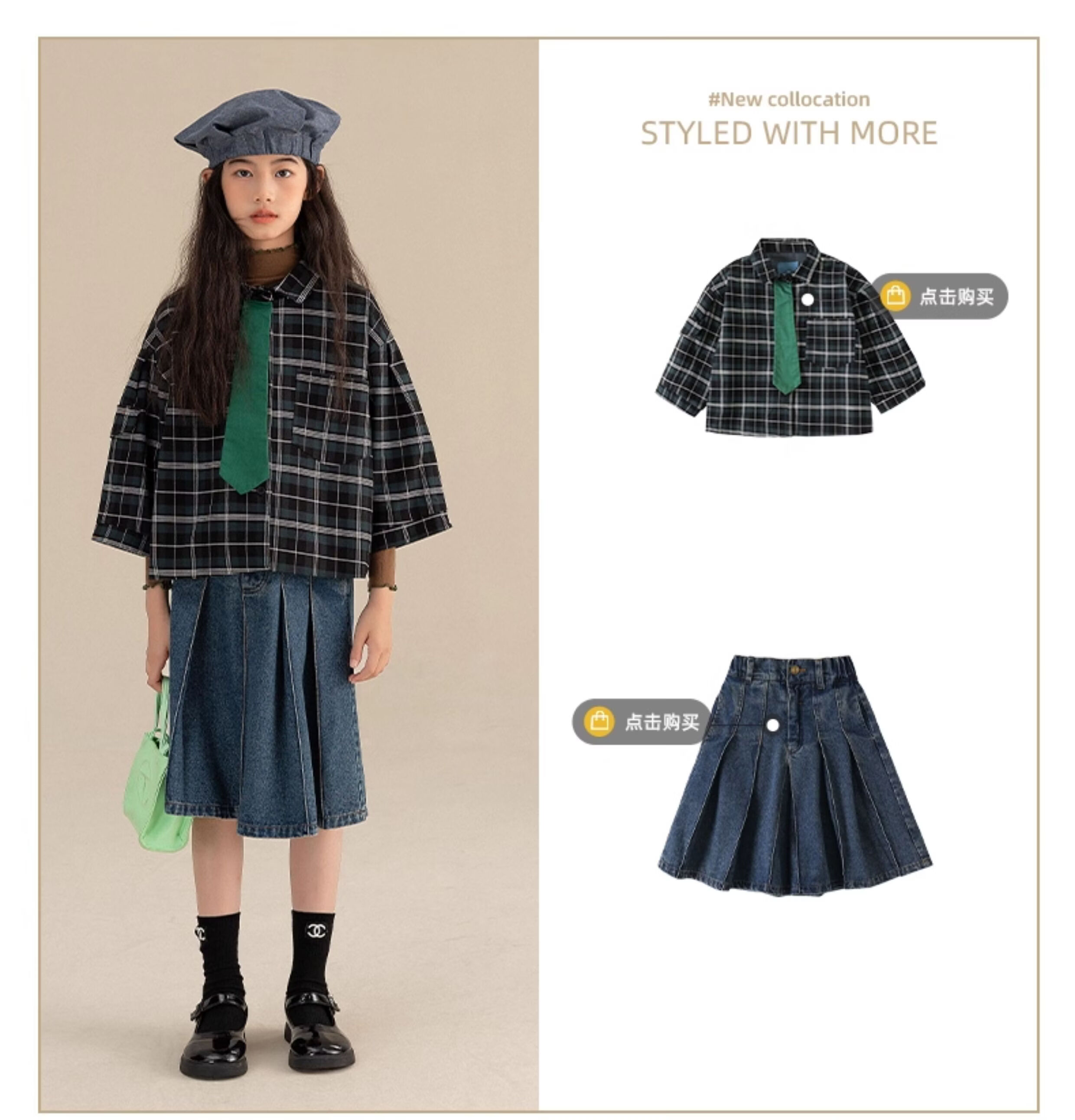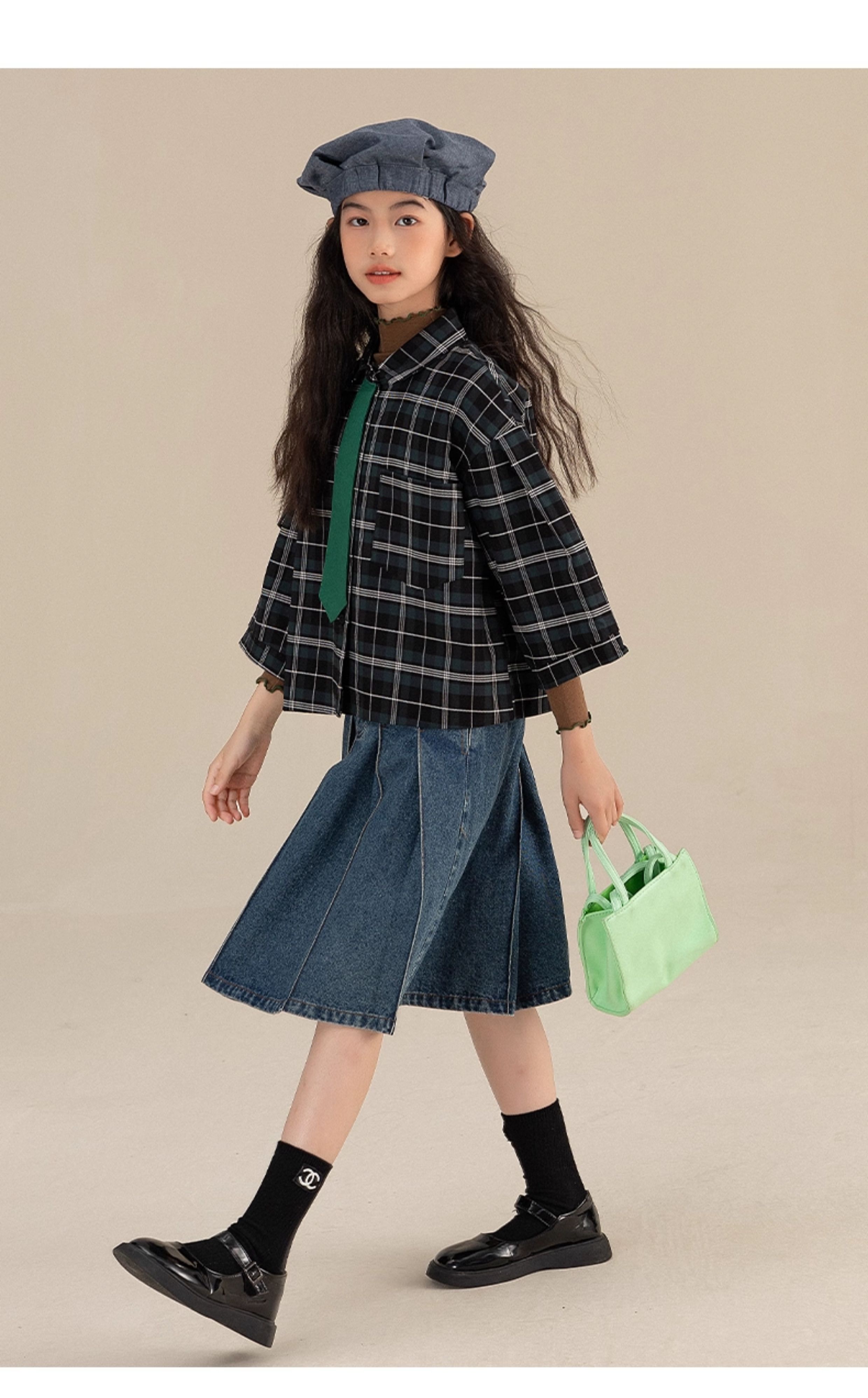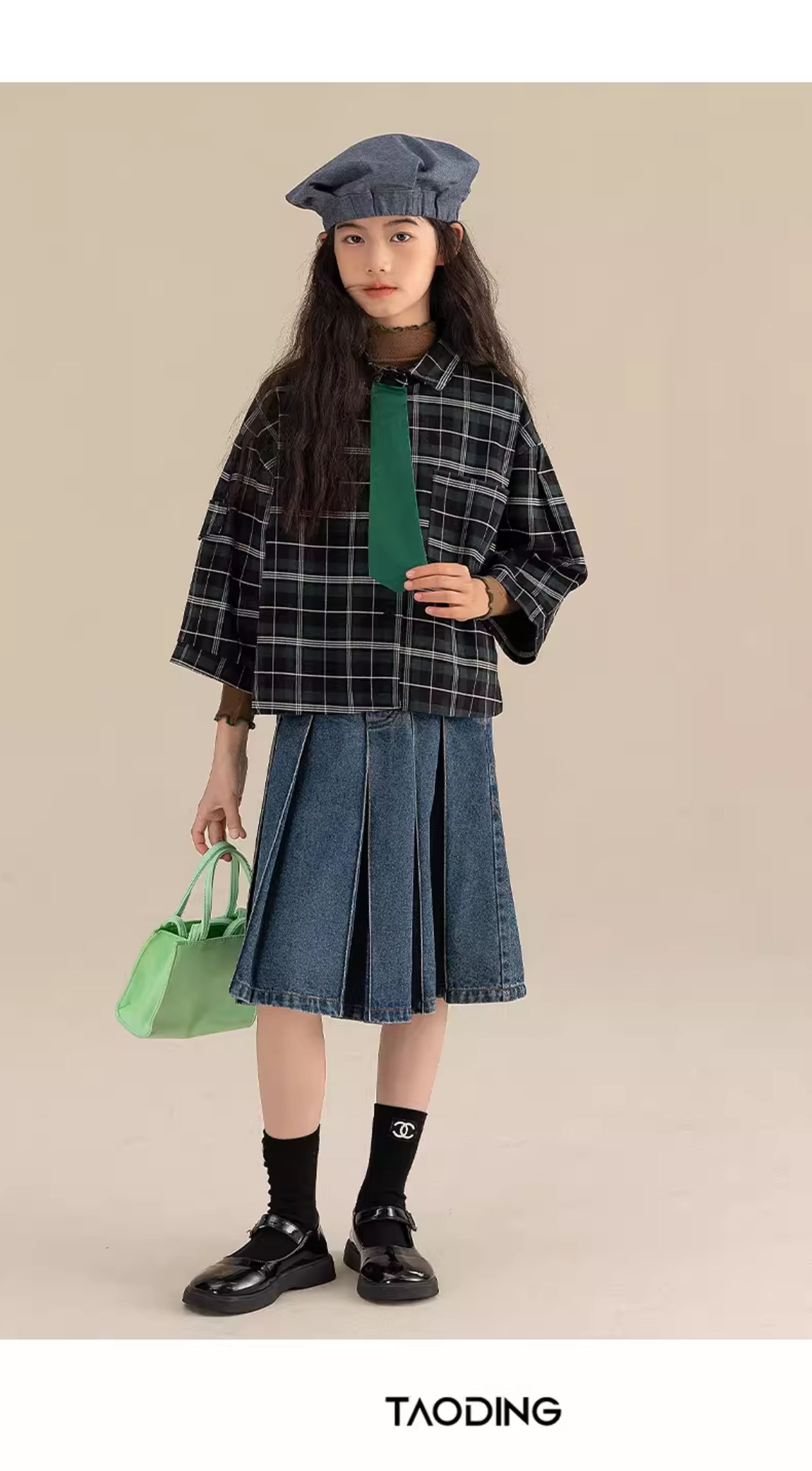 淘町女童衬衫七分袖春秋新款中大童百搭墨绿格子韩版宽松学院衬衣 墨绿 160