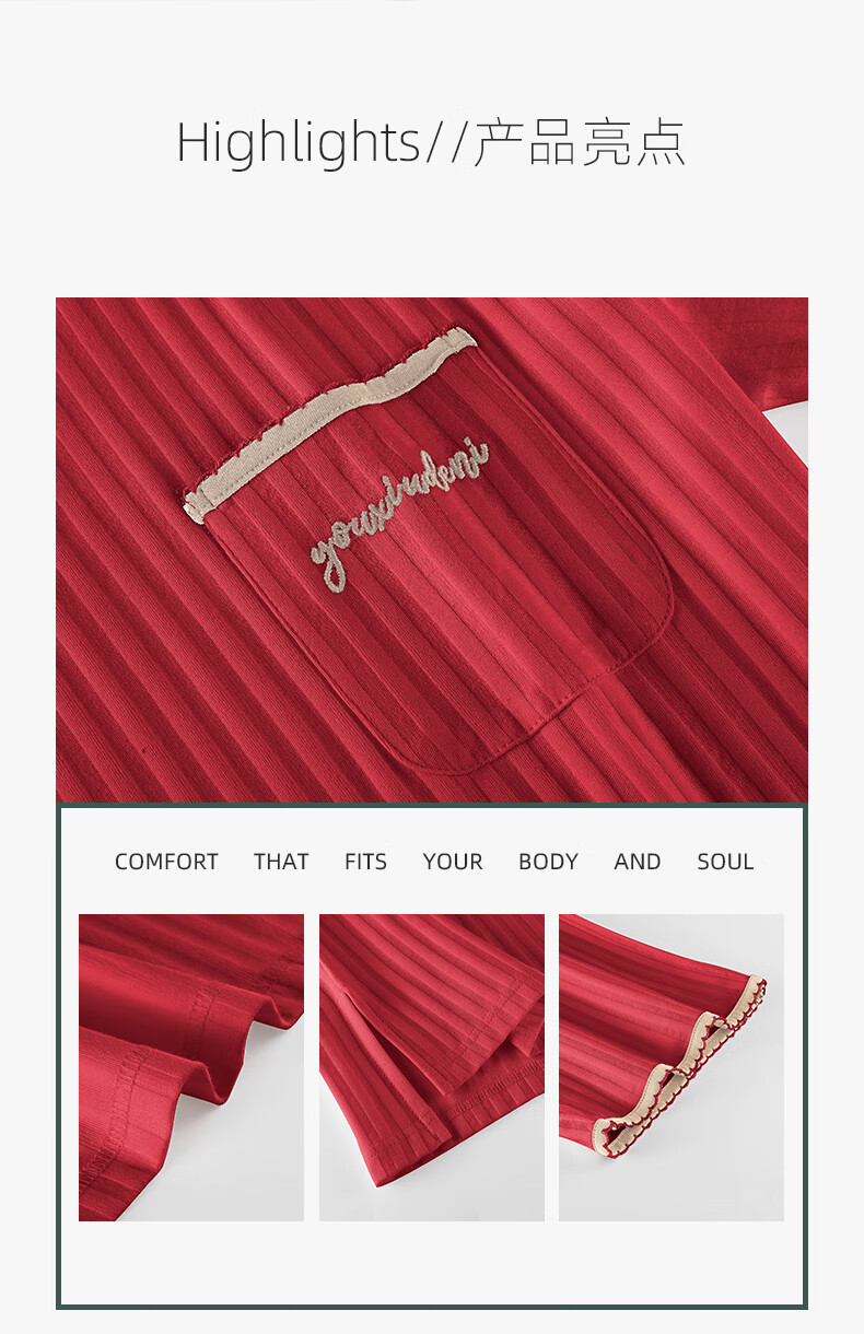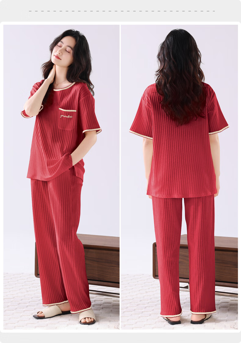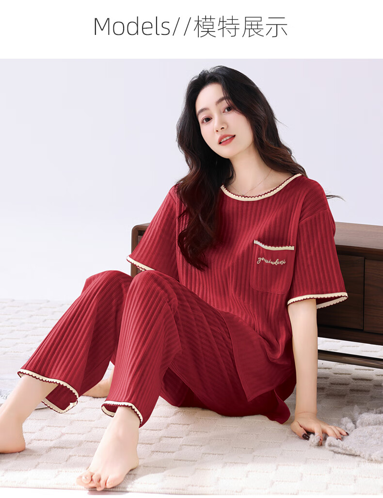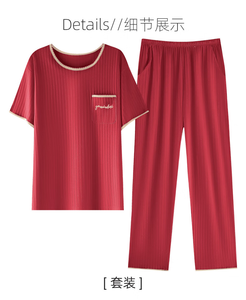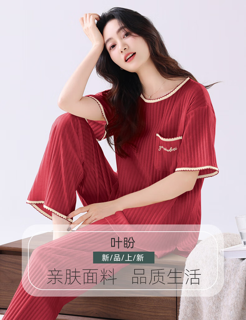 叶盼(yepan)【带胸垫】纯棉睡衣女夏季短袖长裤喜庆红宽松大码女士家居服套装 98153-宝石红【带胸垫】 M (160) :建议80-100斤穿着