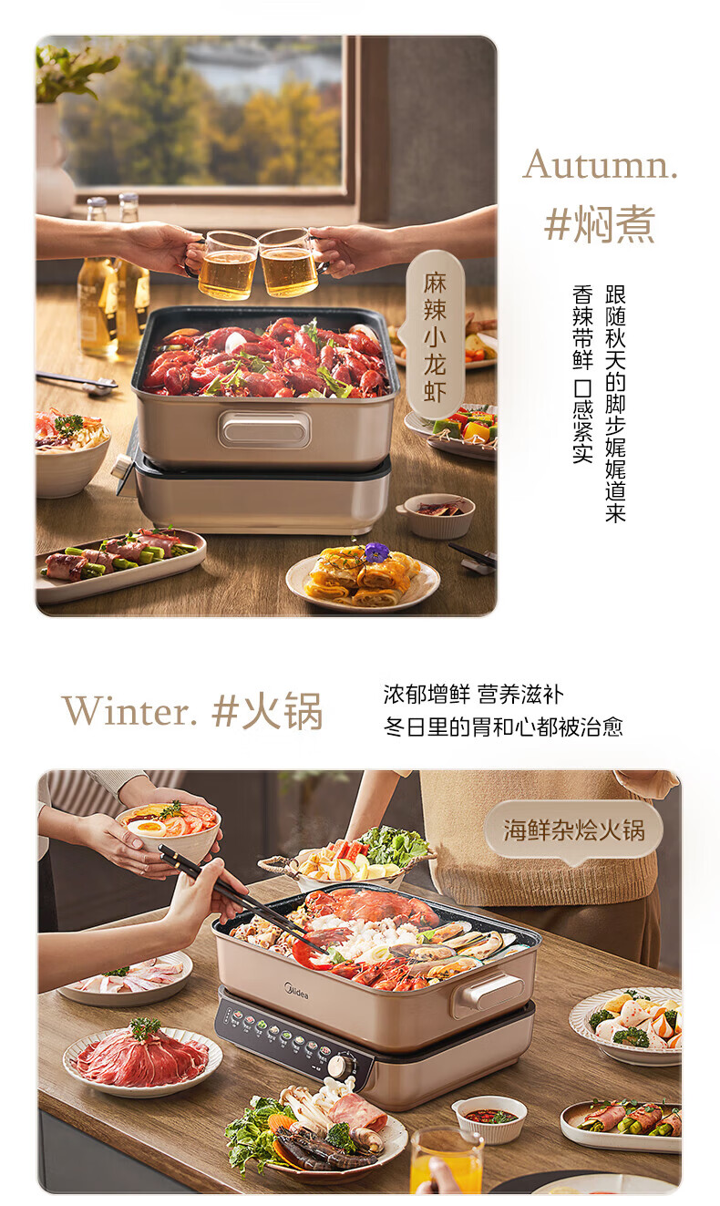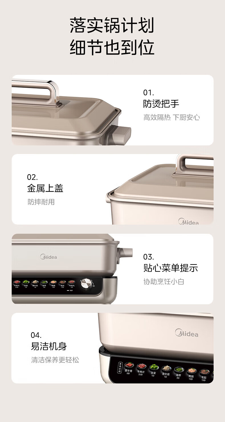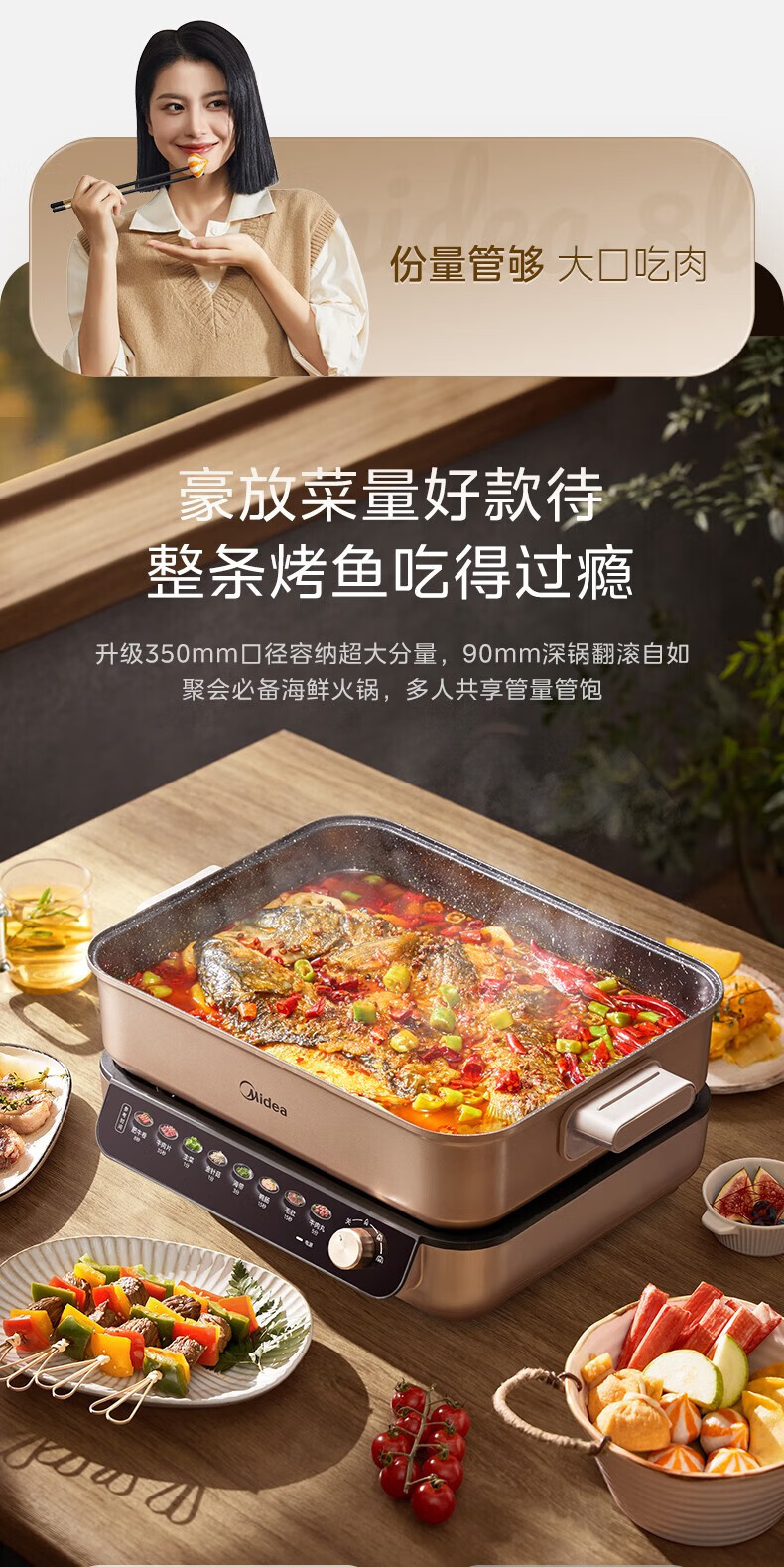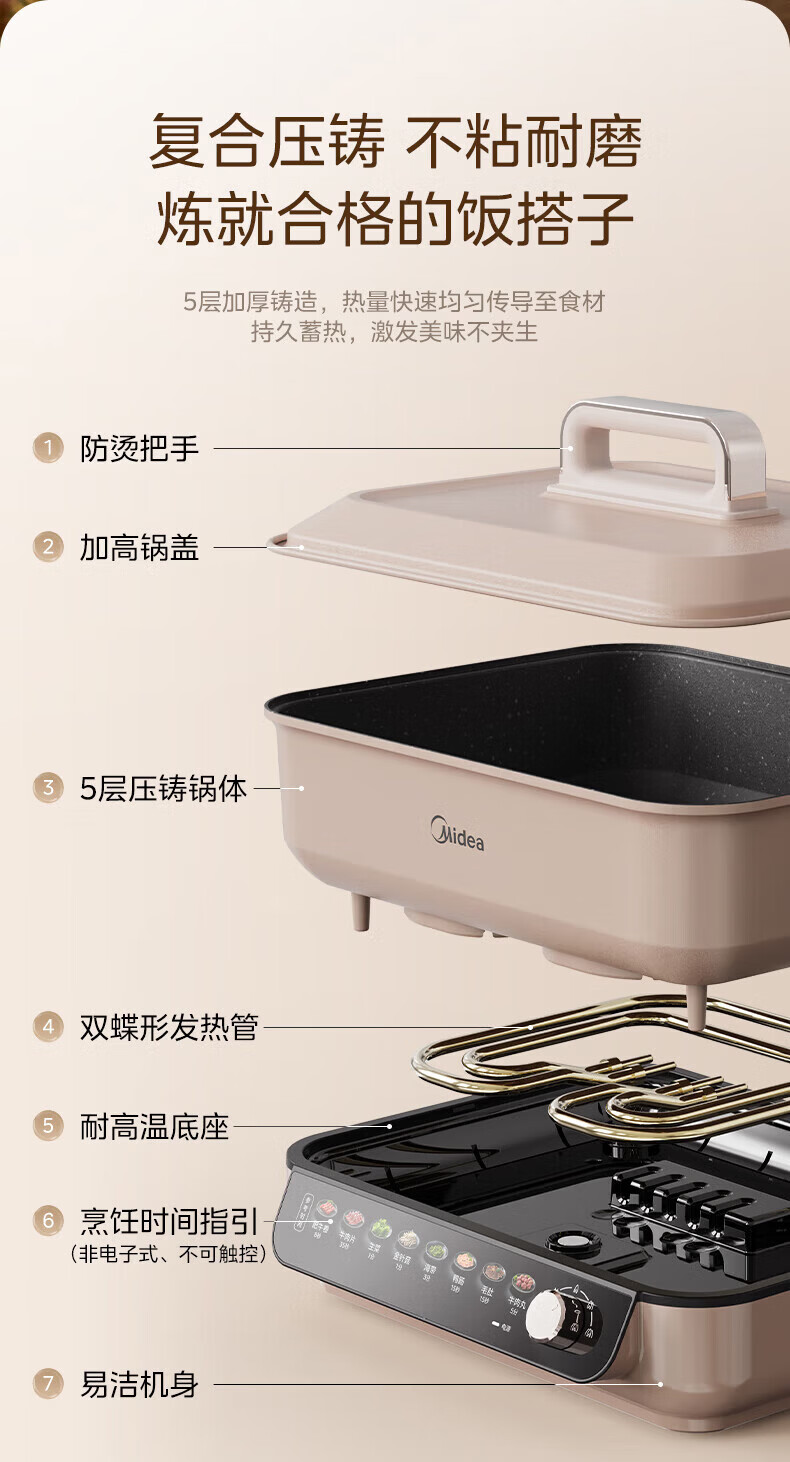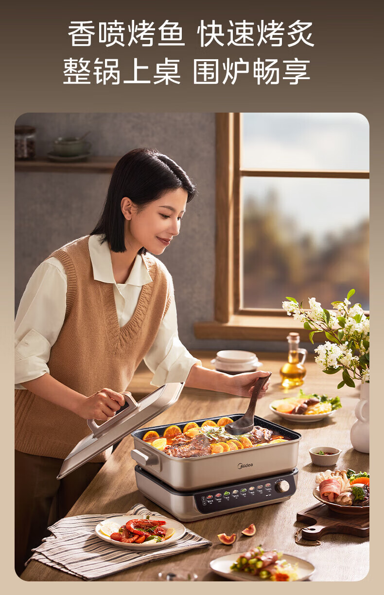 美的(Midea)电火锅8L大容量 5-10人家用大火力速沸火锅专用锅分体式多功能电煮锅涮肉烤肉锅多用途料理锅 8L 优钛抗菌涂层不粘锅