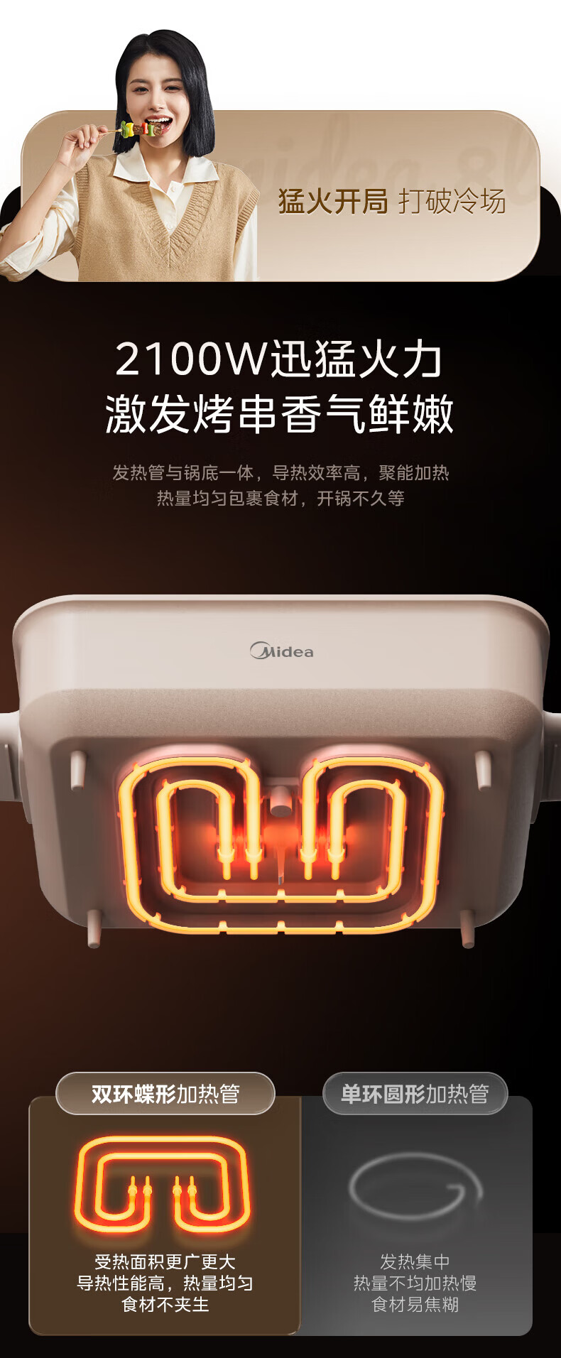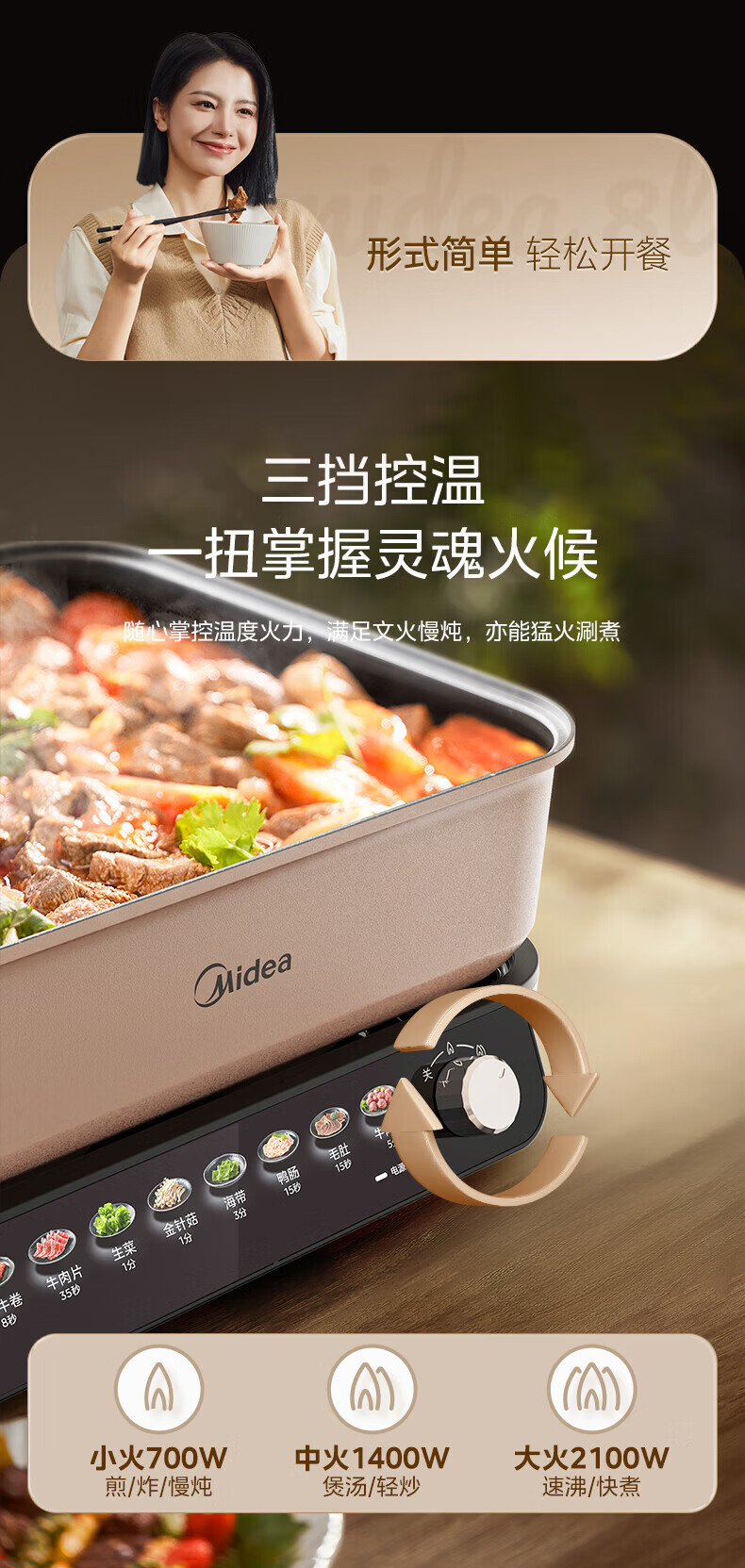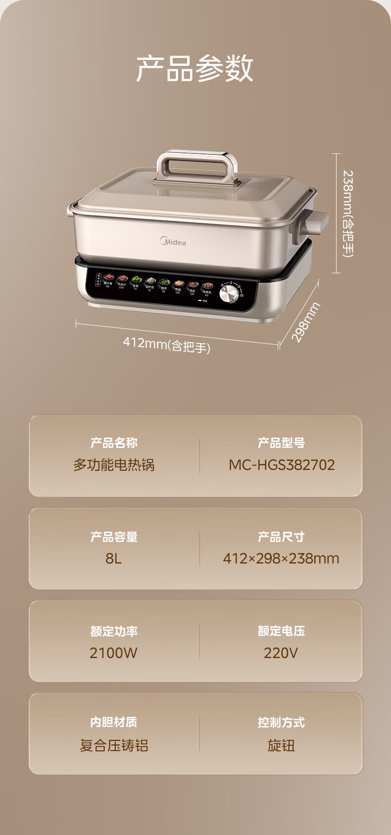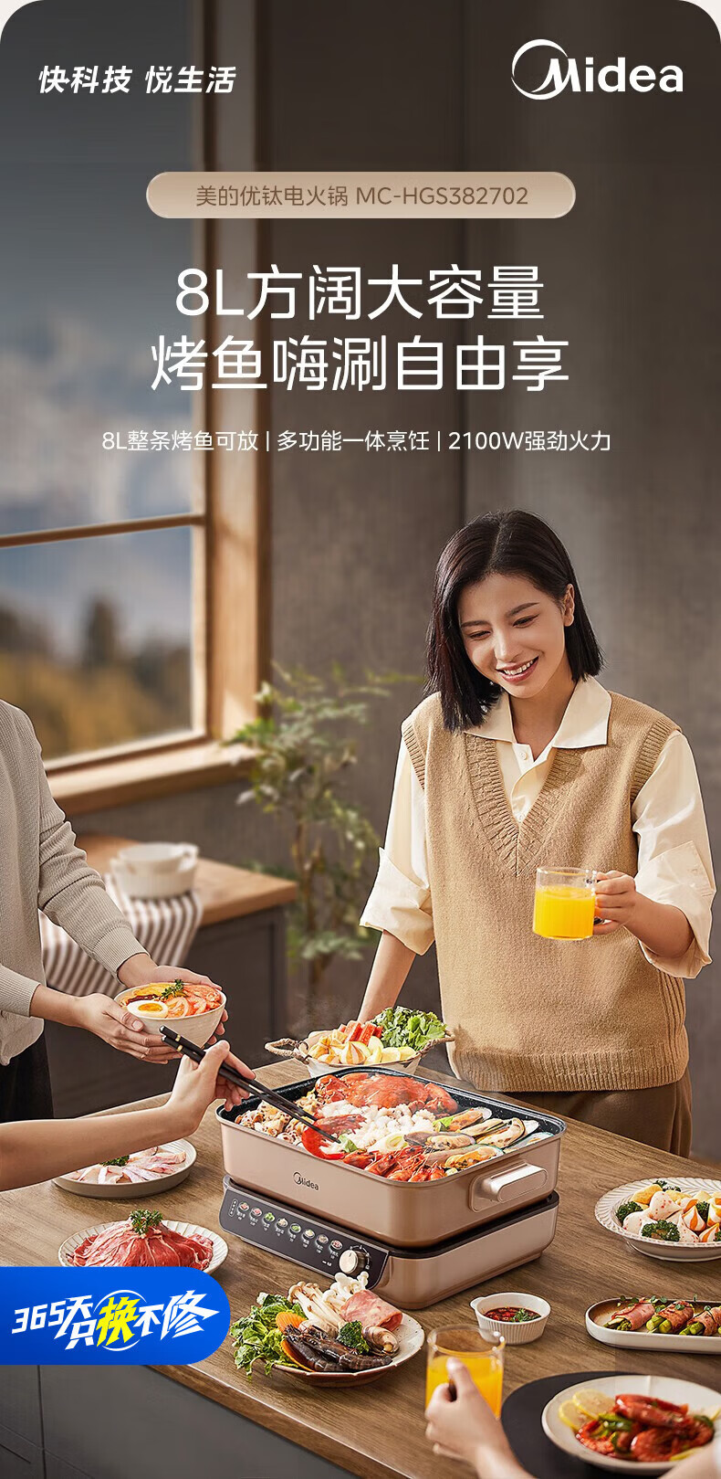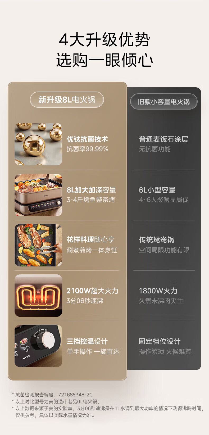 美的(Midea)电火锅8L大容量 5-10人家用大火力速沸火锅专用锅分体式多功能电煮锅涮肉烤肉锅多用途料理锅 8L 优钛抗菌涂层不粘锅