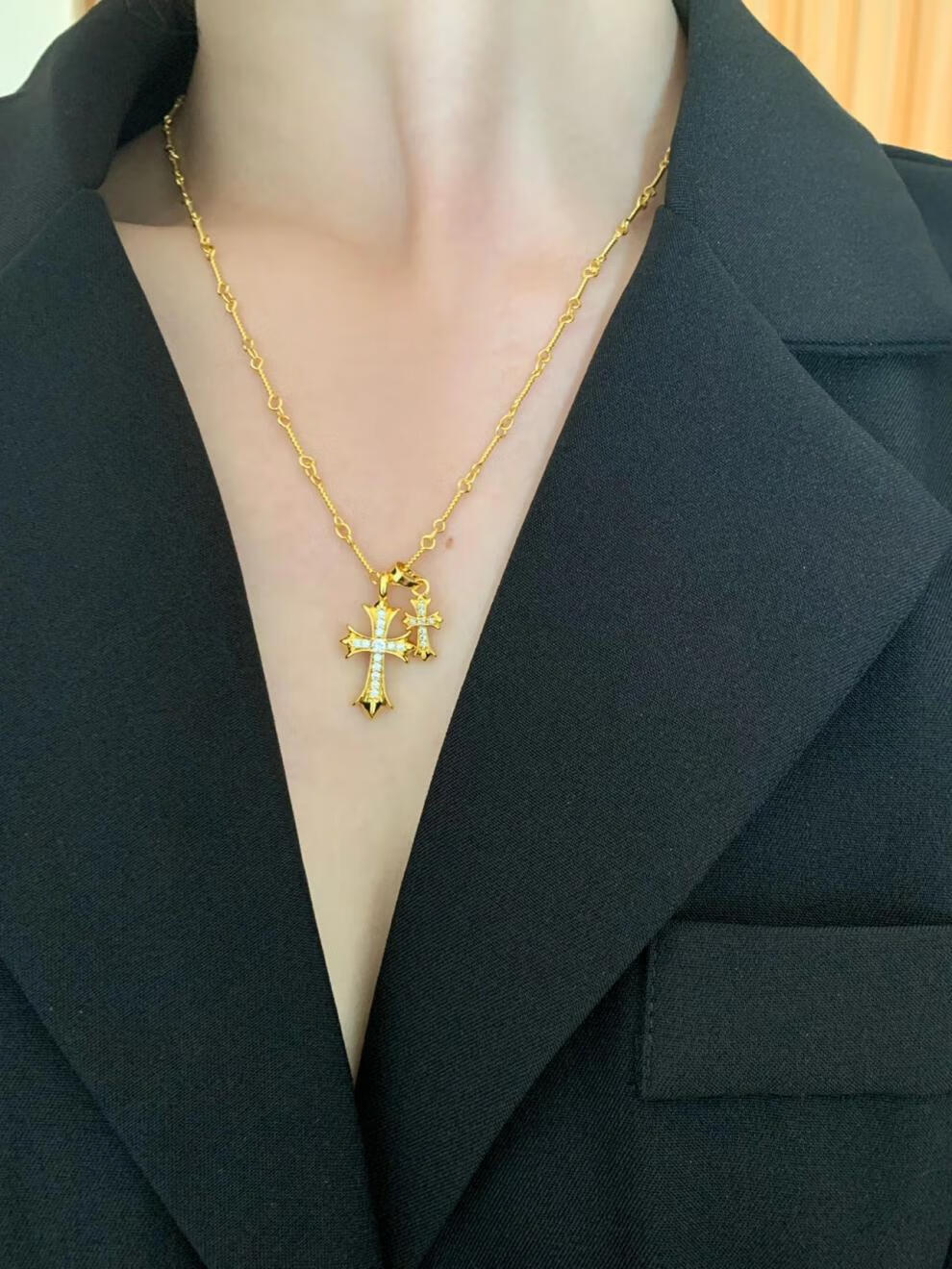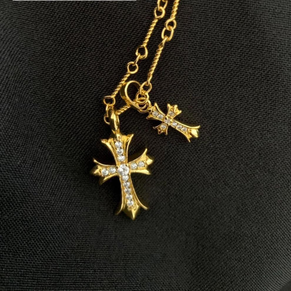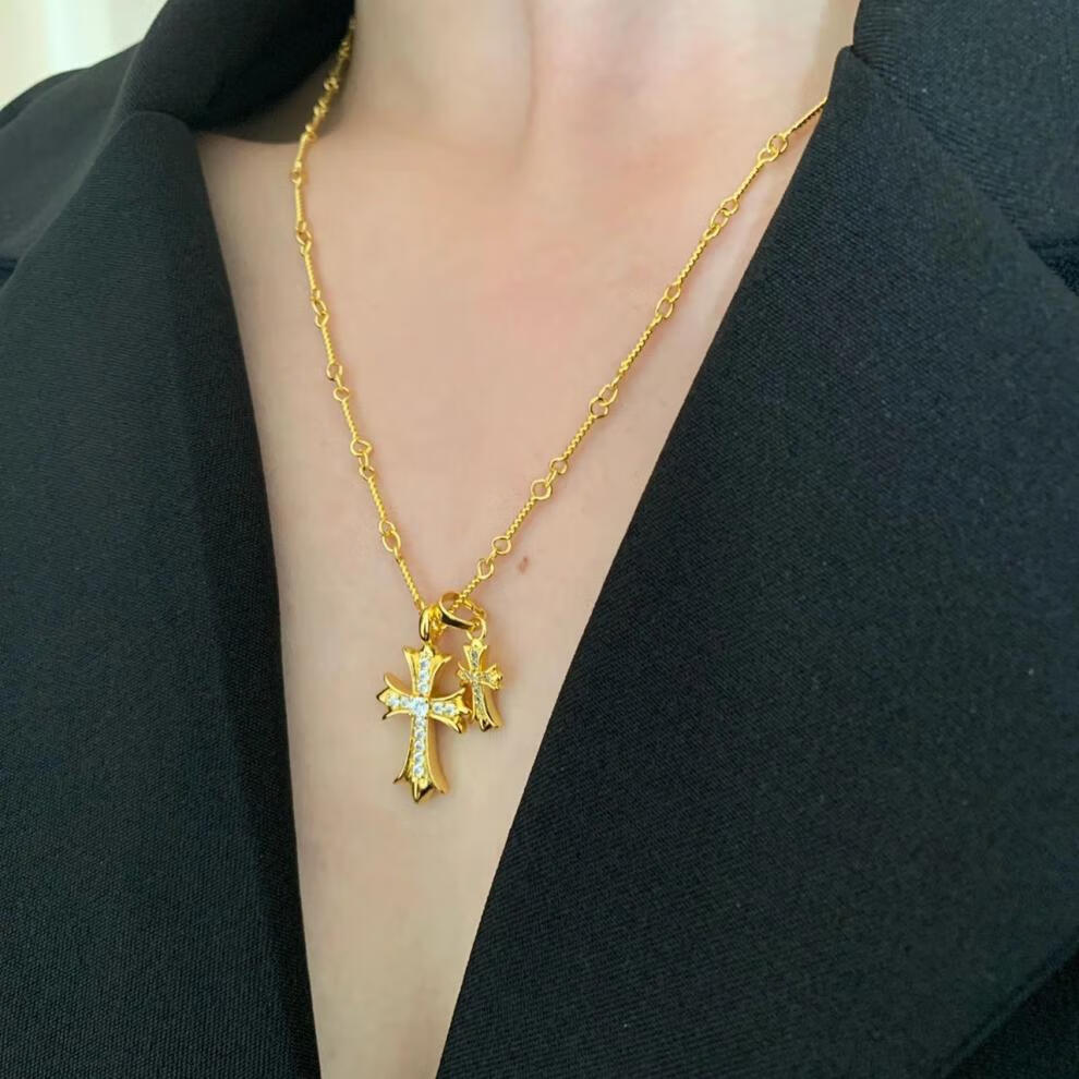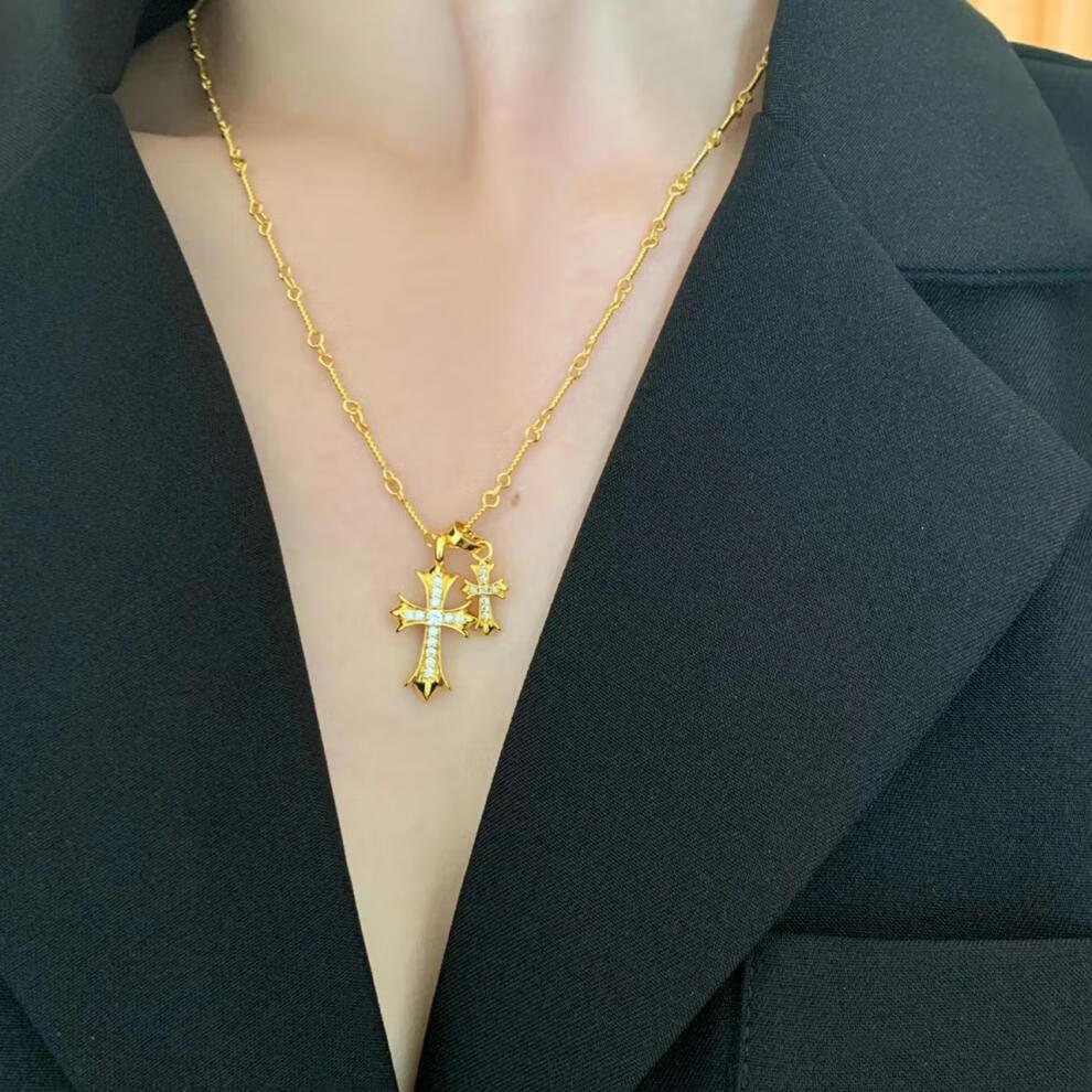 胖东来同款双十字架项链休闲潮牌镀金镶钻男女同款网红不掉色 金色十字架镶钻