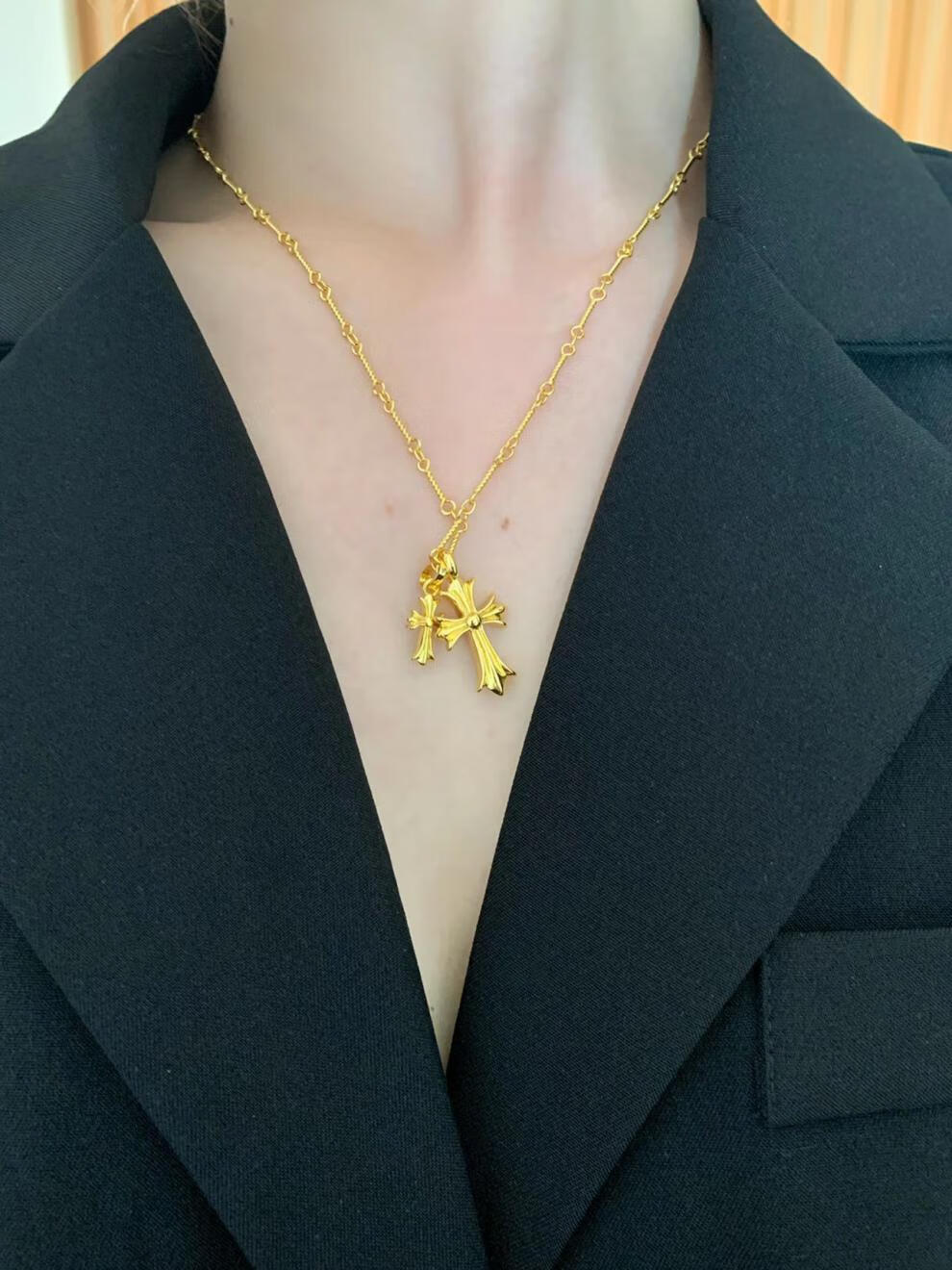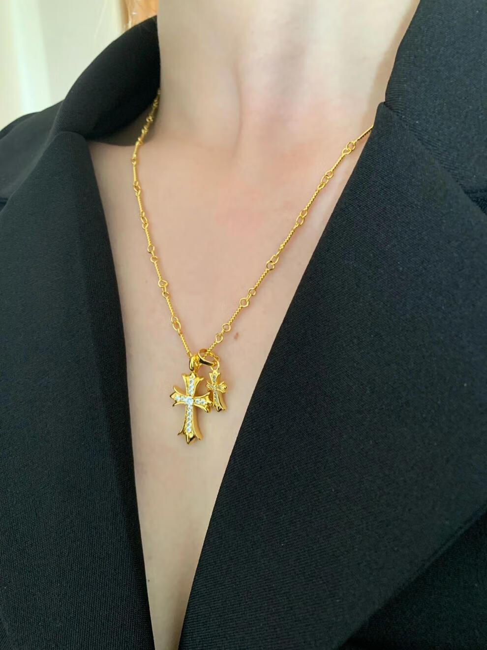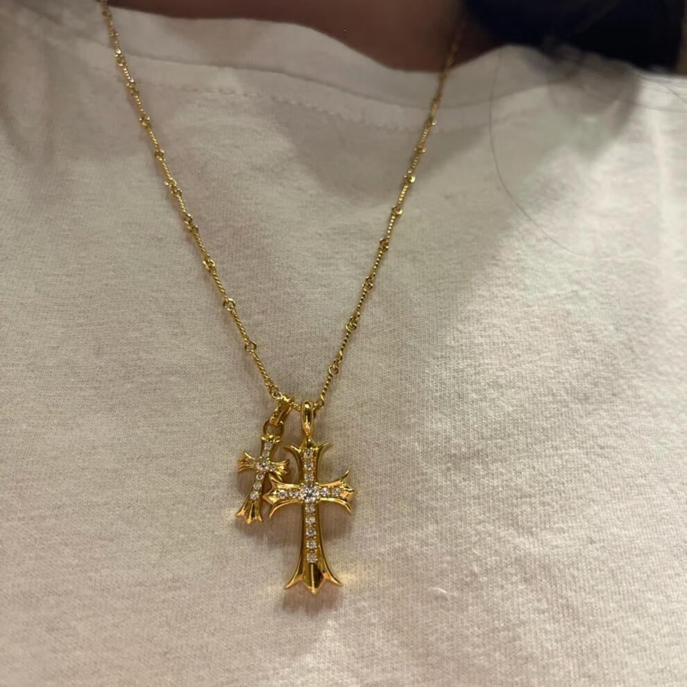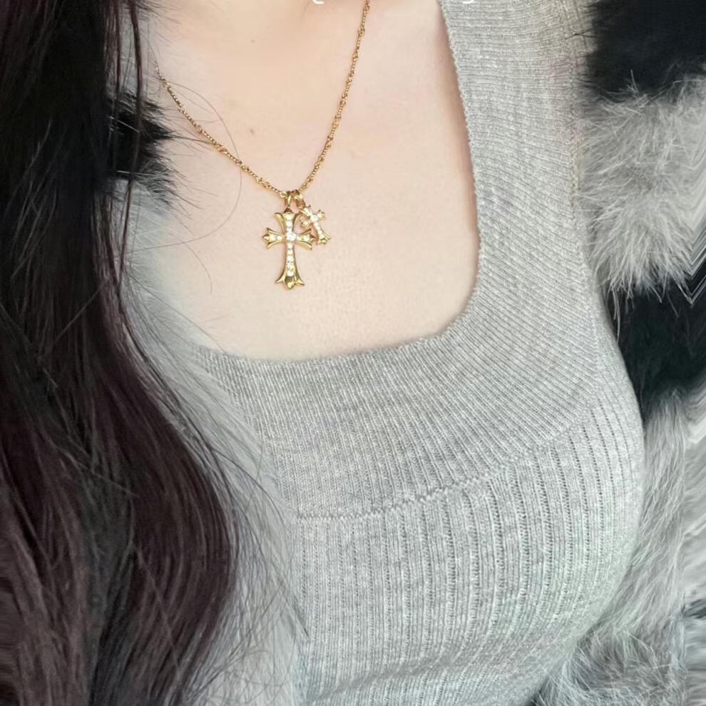 胖东来同款双十字架项链休闲潮牌镀金镶钻男女同款网红不掉色 金色十字架镶钻
