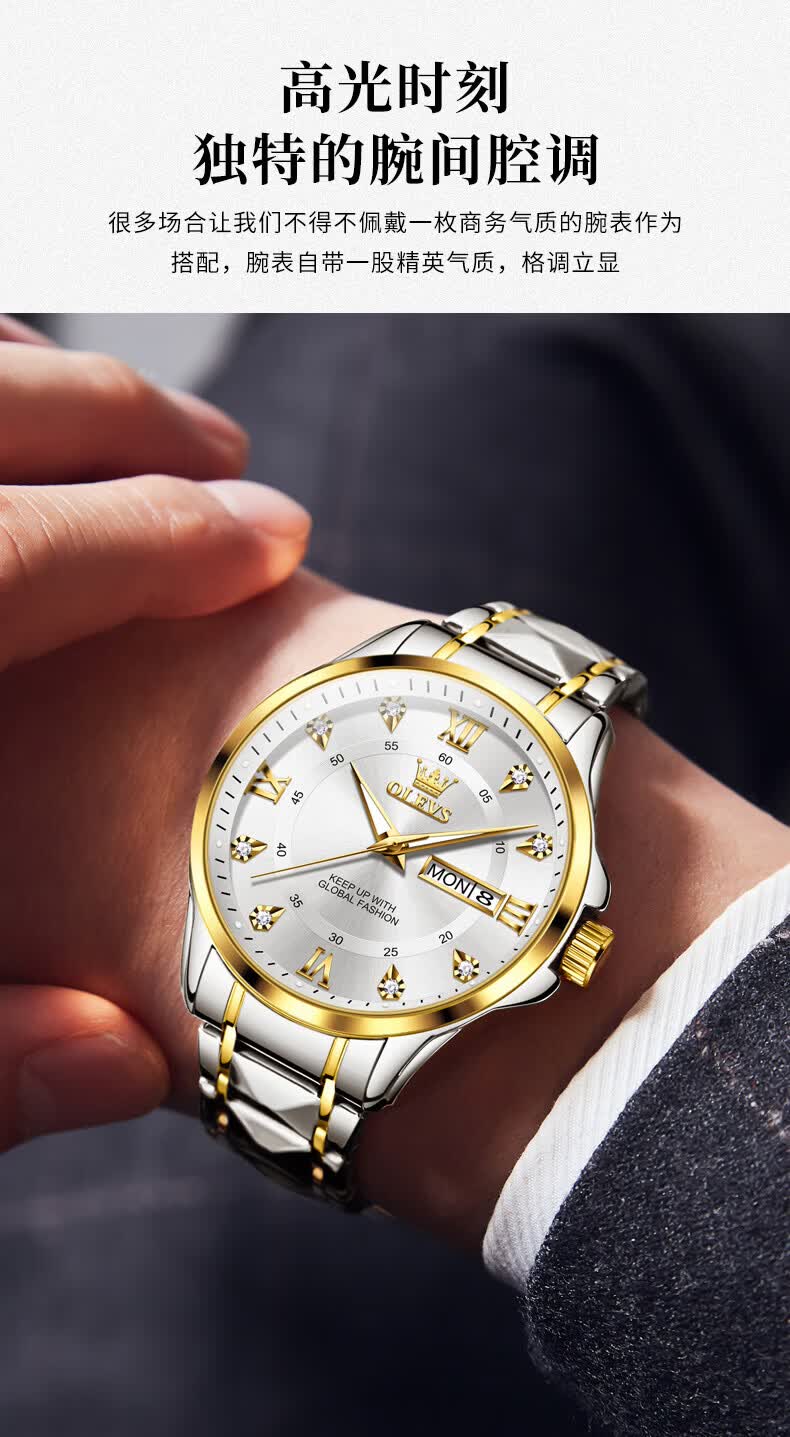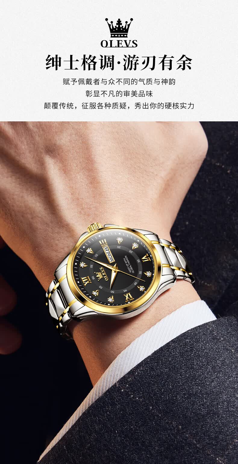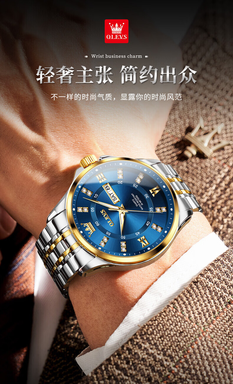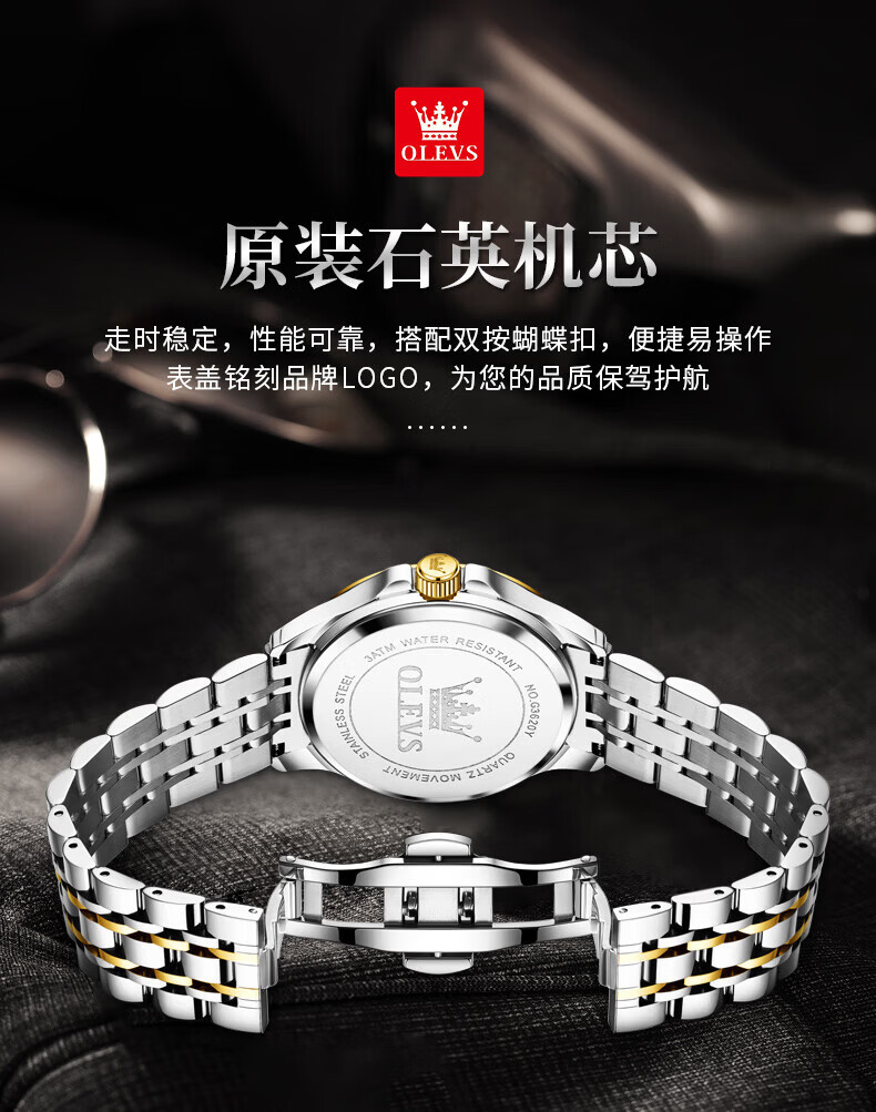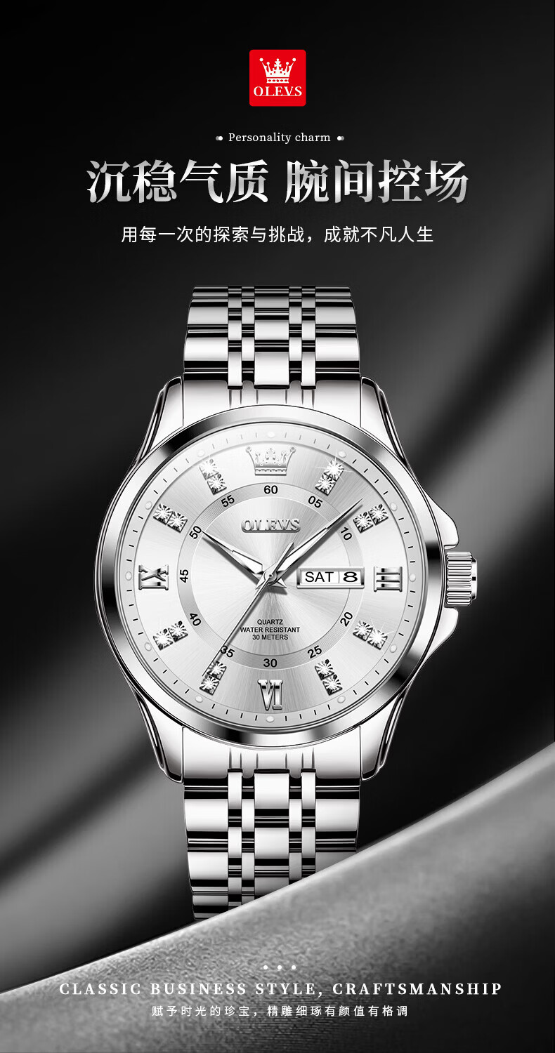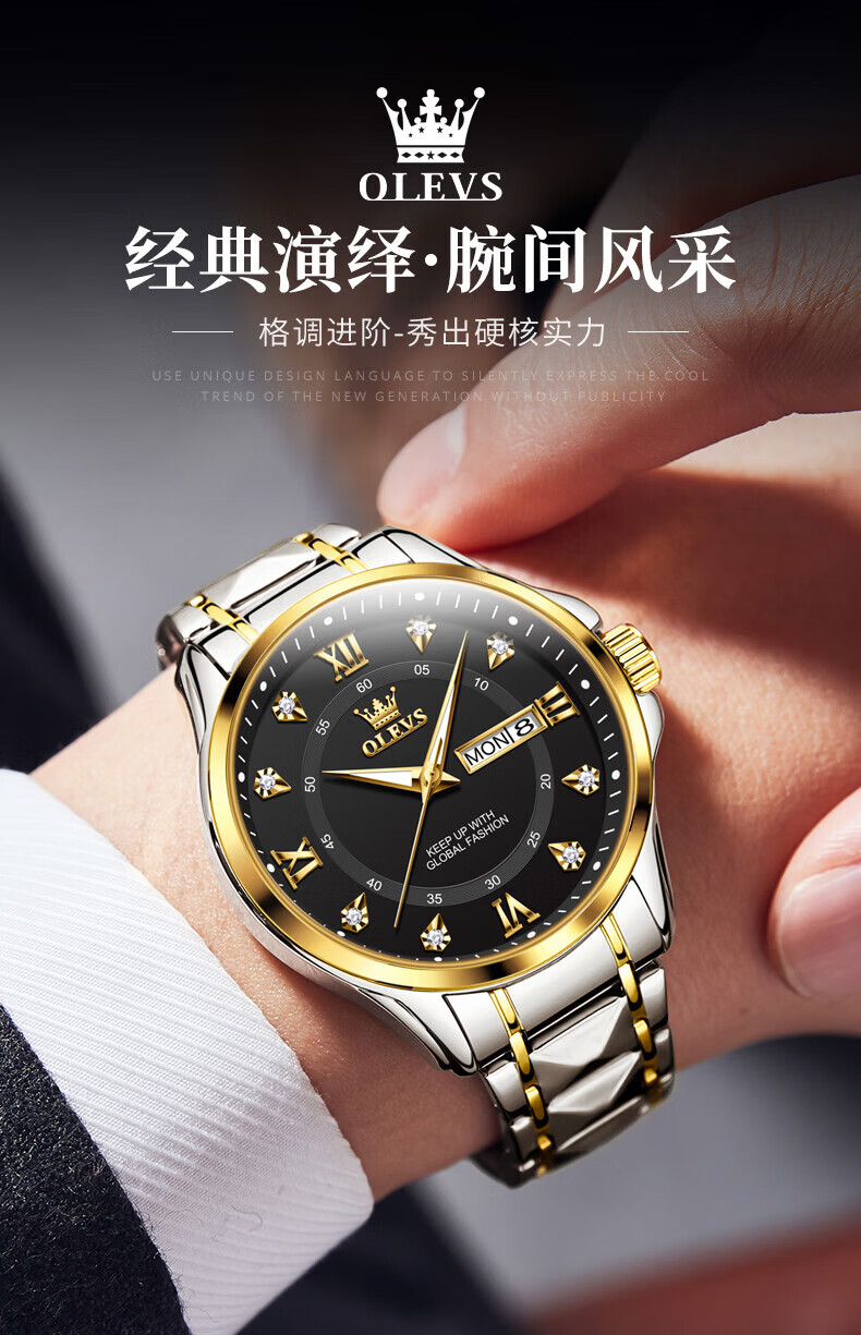 欧利时(OLEVS)瑞士认证手表男石英表品牌十大名表2026新款日历商务高端男士手表 典藏版2906钢带全金男 免费刻字 终身质保