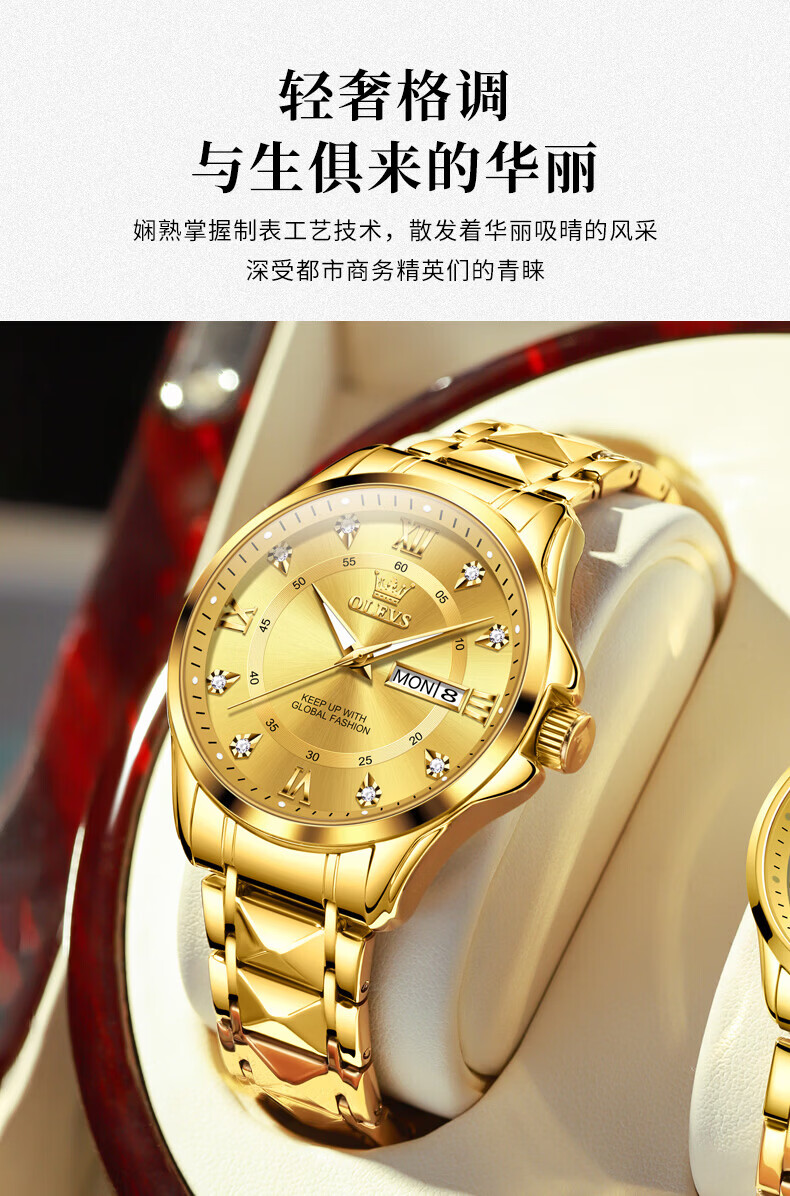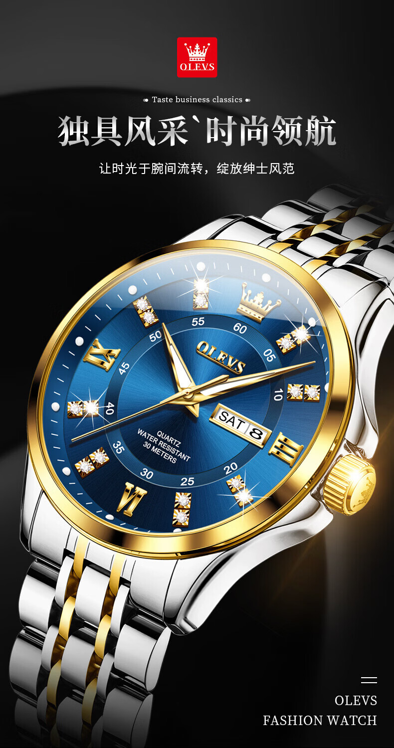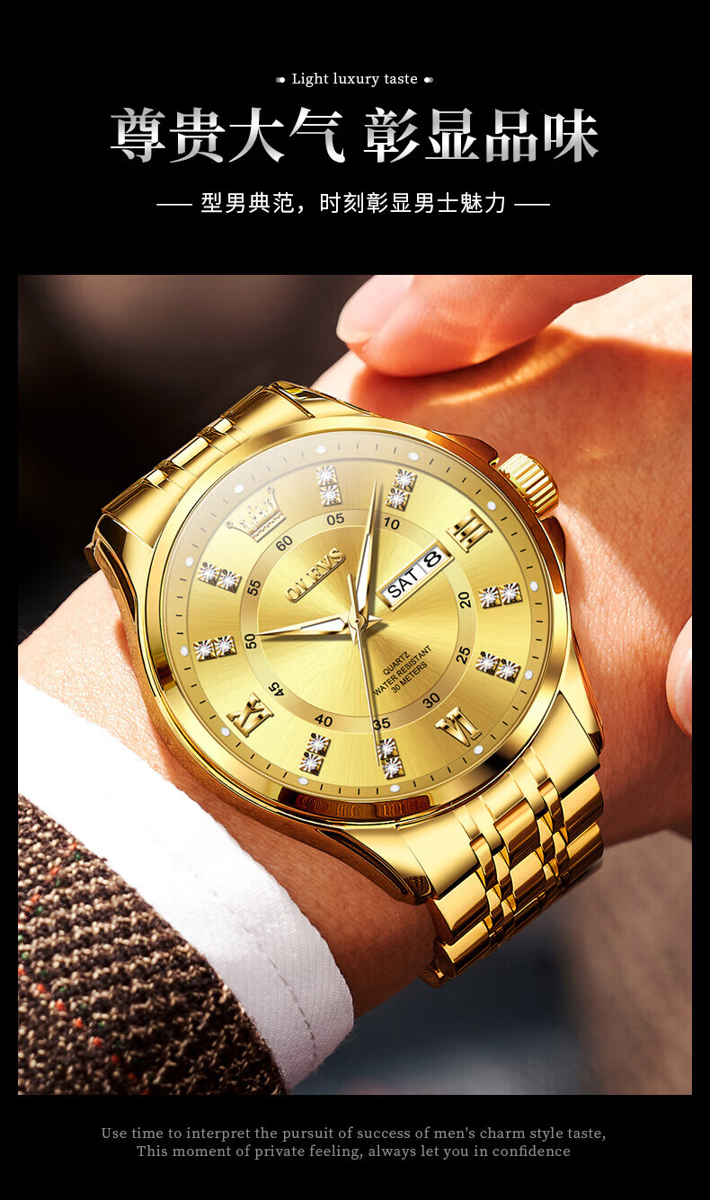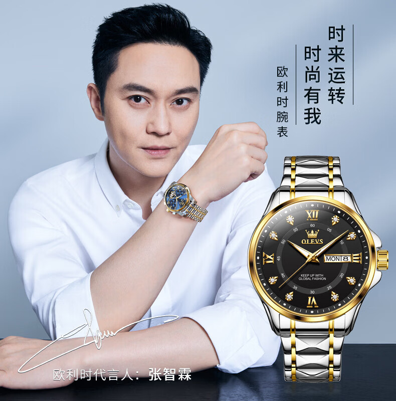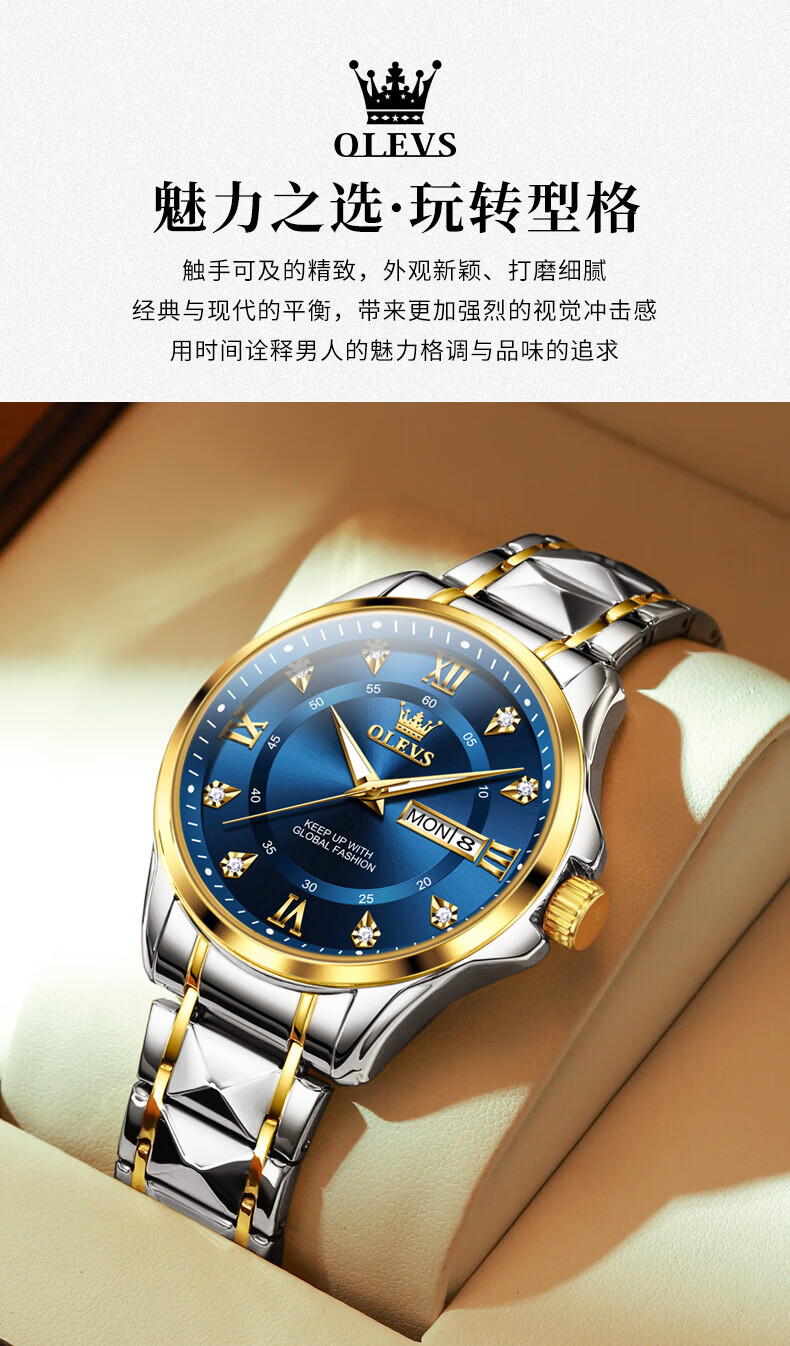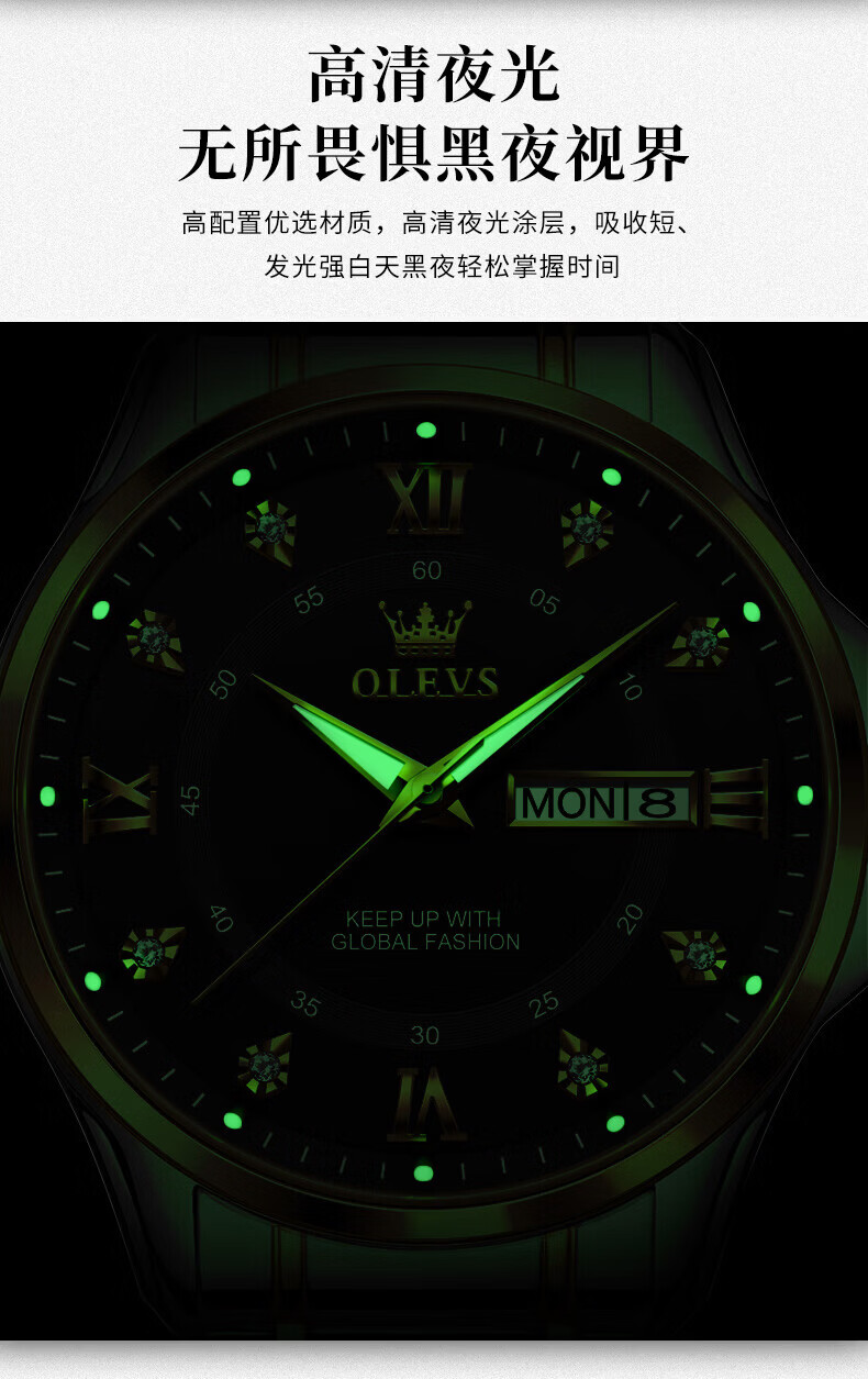 欧利时(OLEVS)瑞士认证手表男石英表品牌十大名表2026新款日历商务高端男士手表 典藏版2906钢带全金男 免费刻字 终身质保