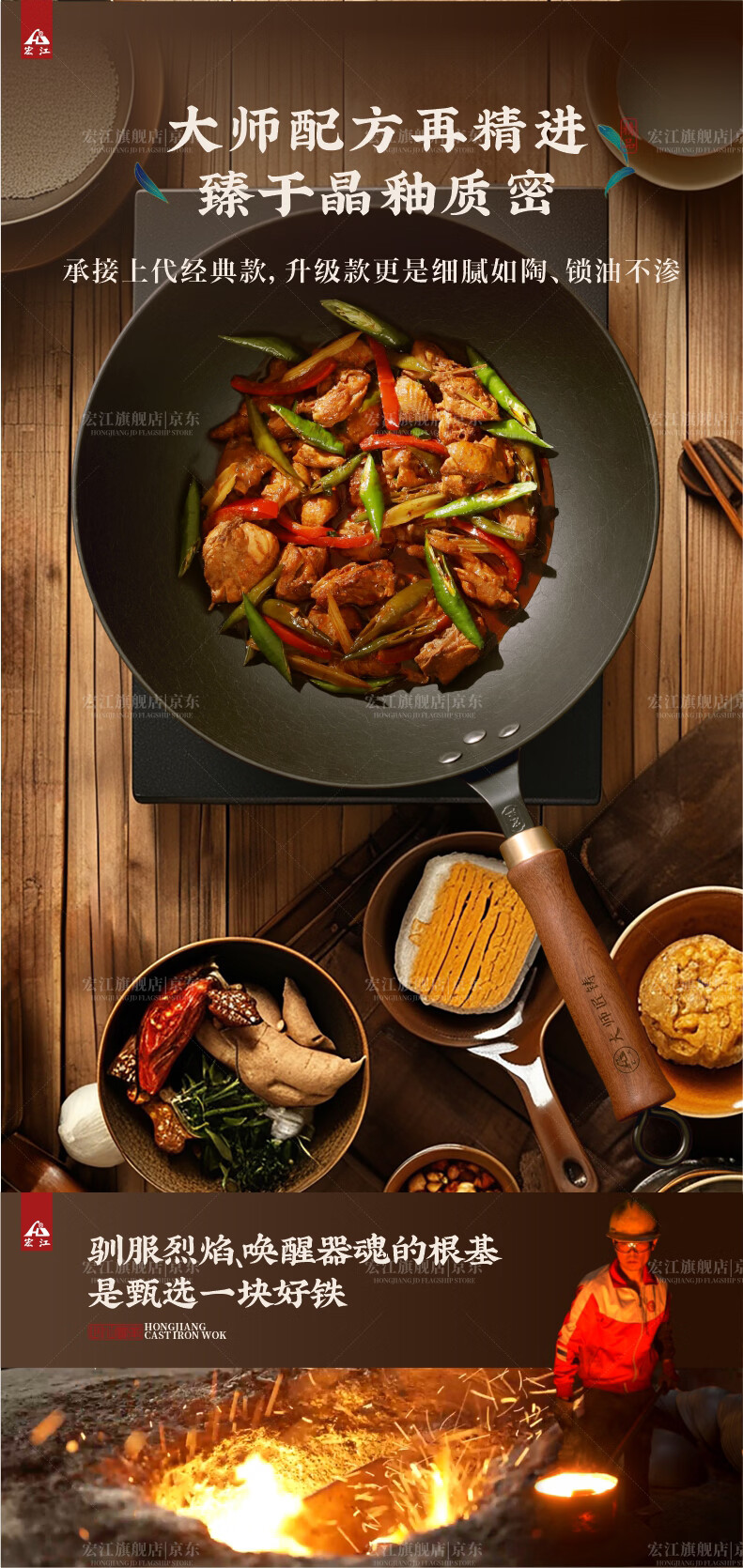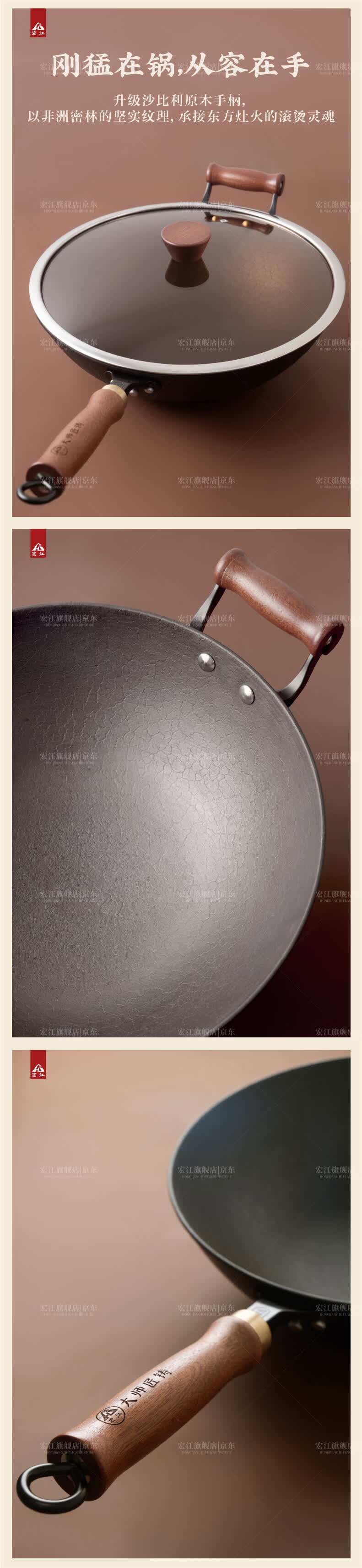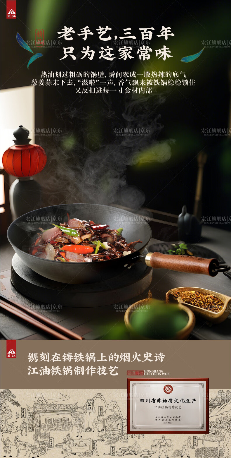 宏江 江油老式手工铁锅家用炒锅生铁圆底炒锅铸铁锅大师款升级款新款 34圆底带耳(大师款升级款套装) 34cm