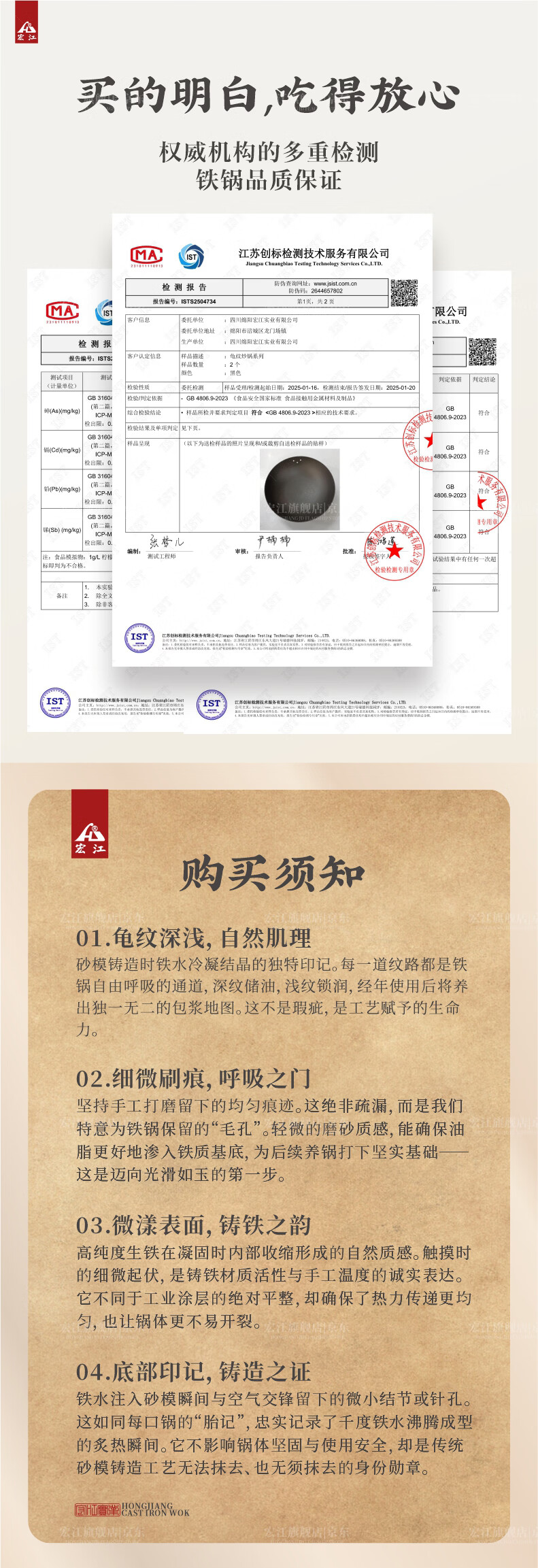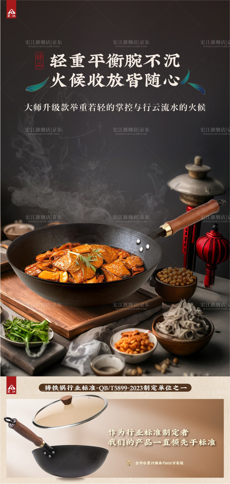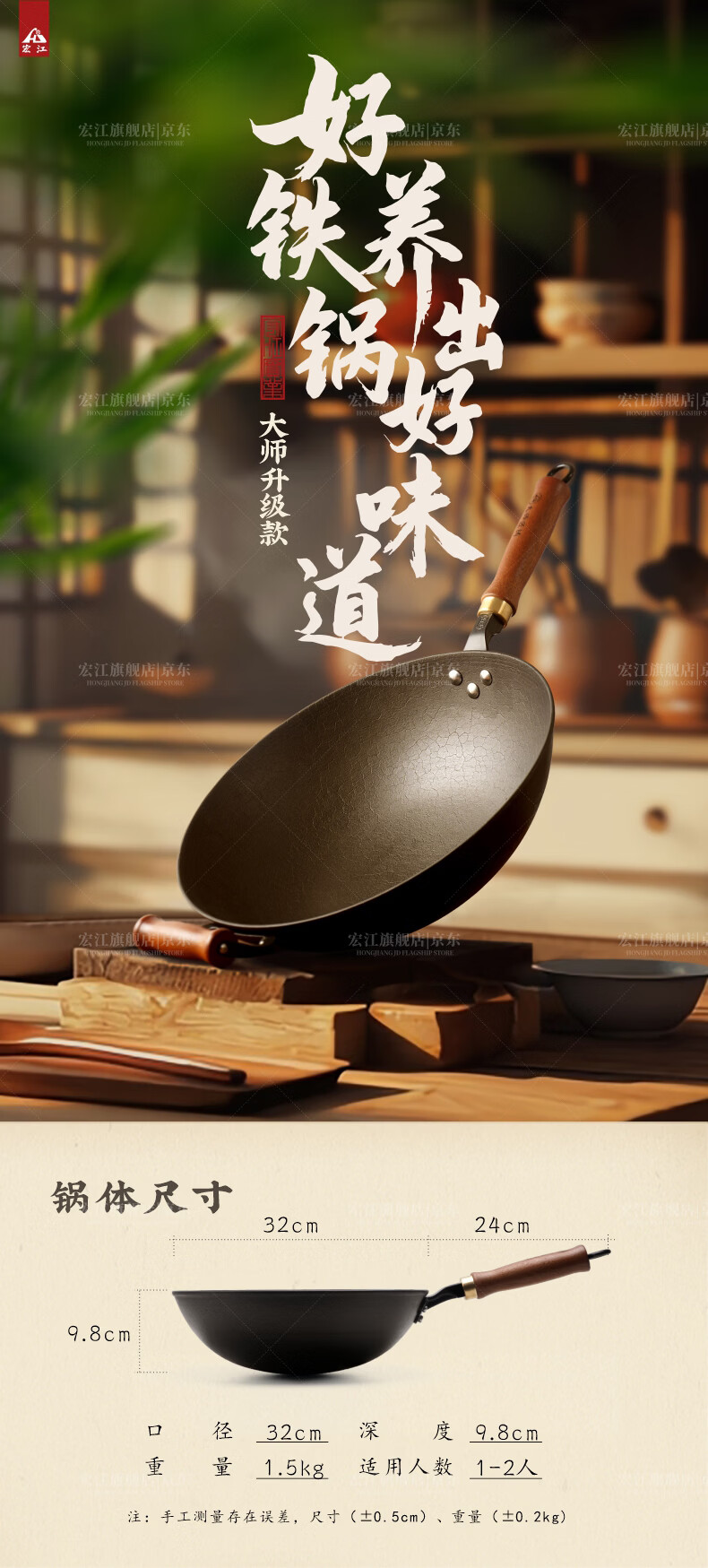 宏江 江油老式手工铁锅家用炒锅生铁圆底炒锅铸铁锅大师款升级款新款 34圆底带耳(大师款升级款套装) 34cm