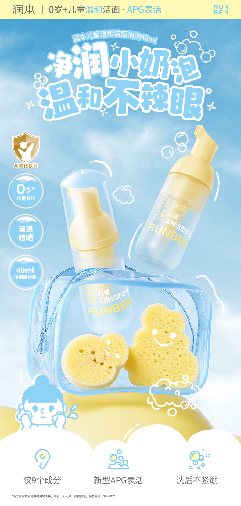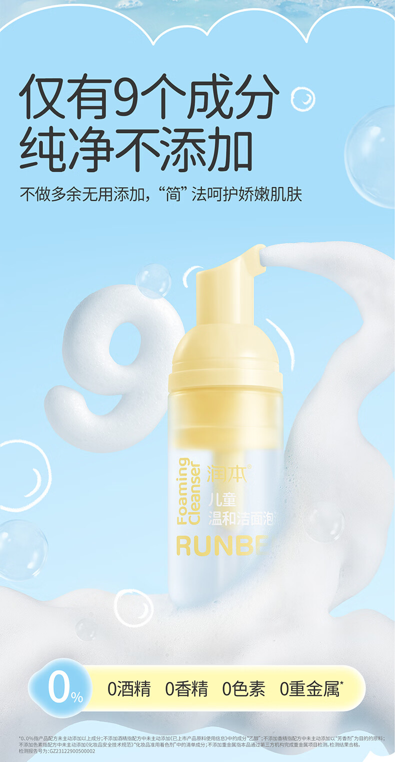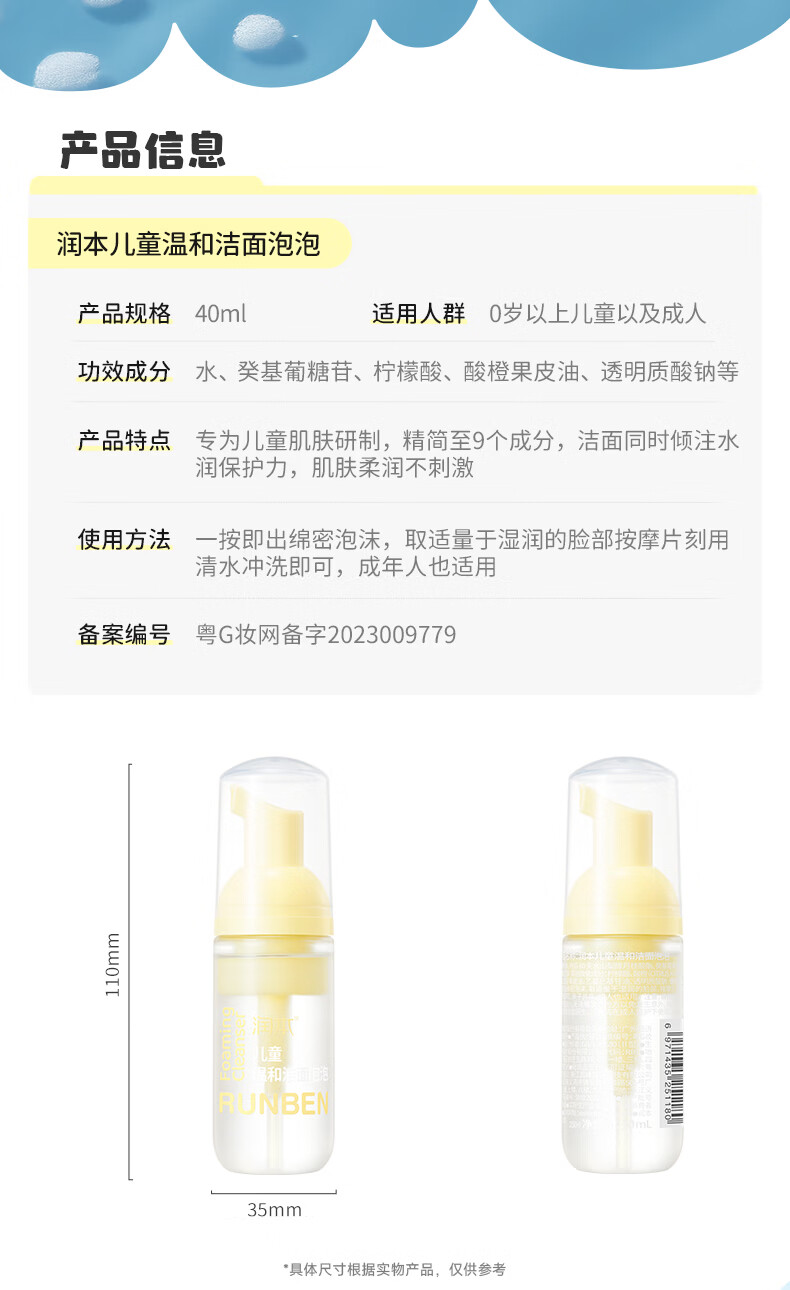 润本儿童洗面奶40ml儿童洁面泡沫0-3-6-12岁女孩男孩洁面乳护肤品