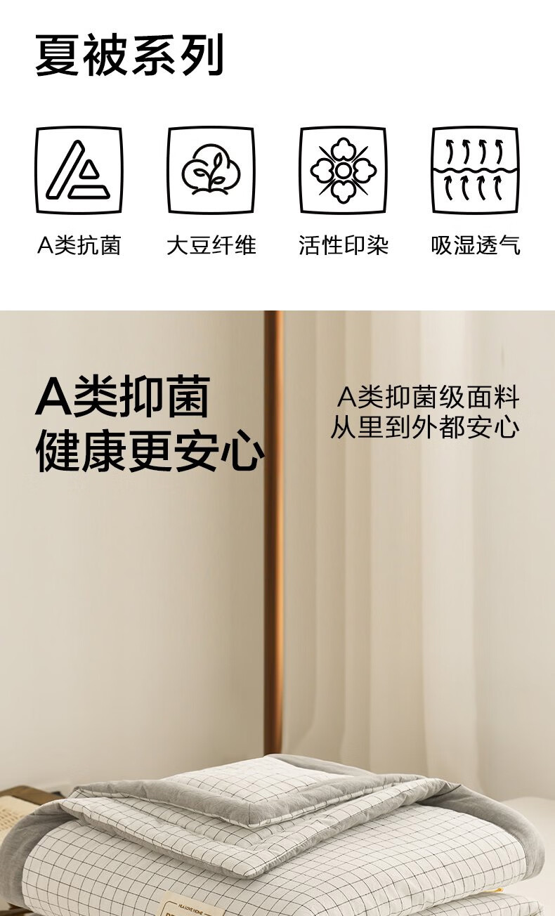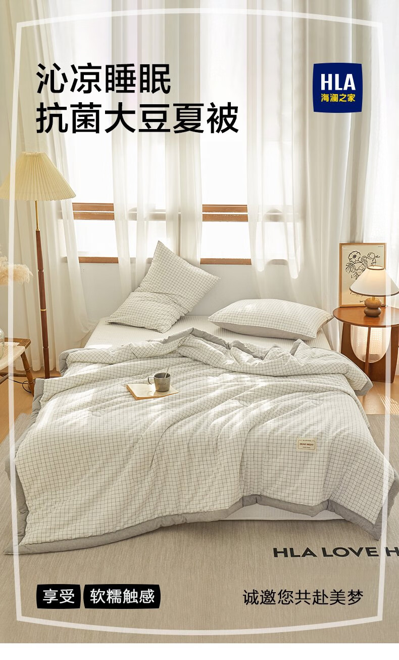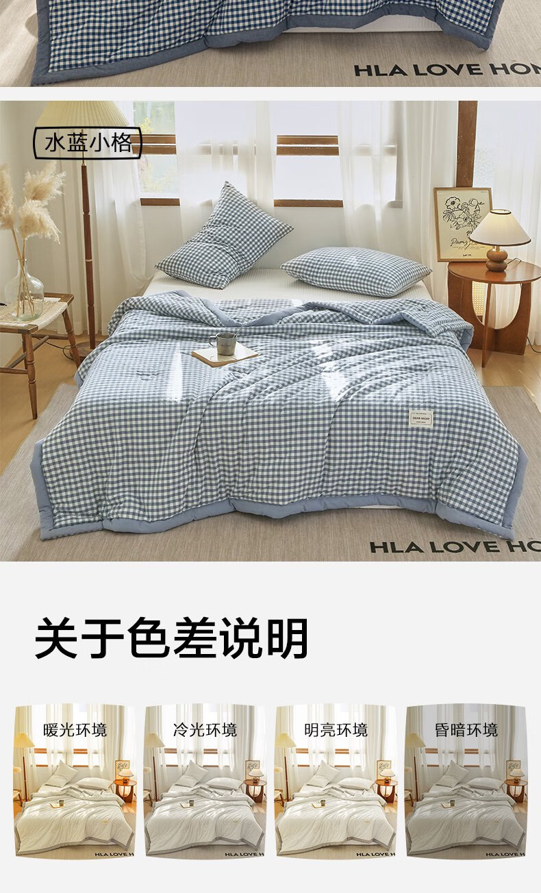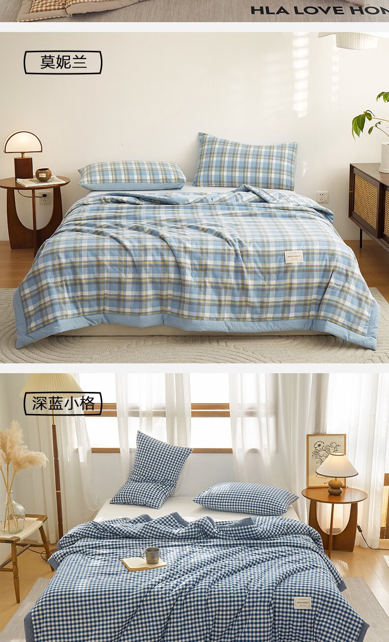 海澜之家(HLA)夏凉被空调夏被A类抗菌21%大豆纤维裸睡柔软舒适可机洗水洗薄被芯 水蓝格 200*230cm