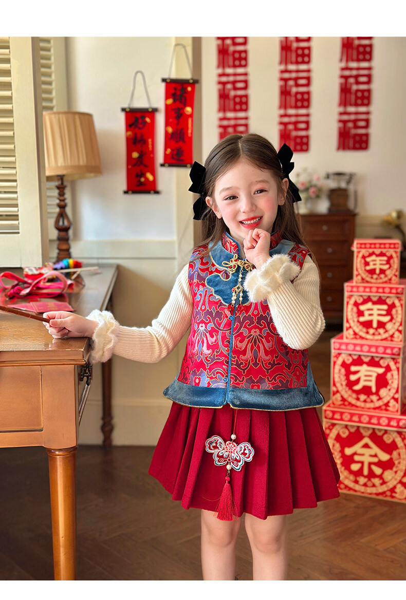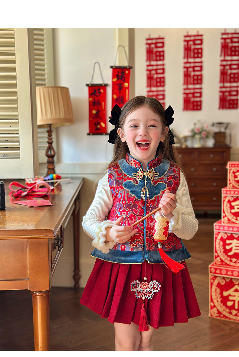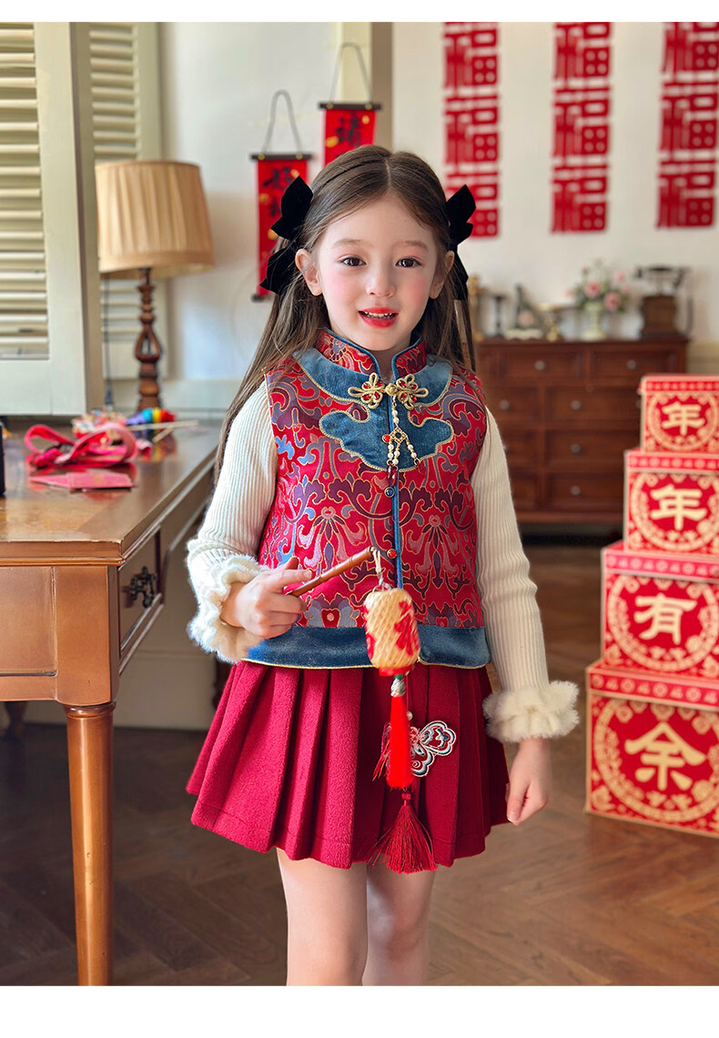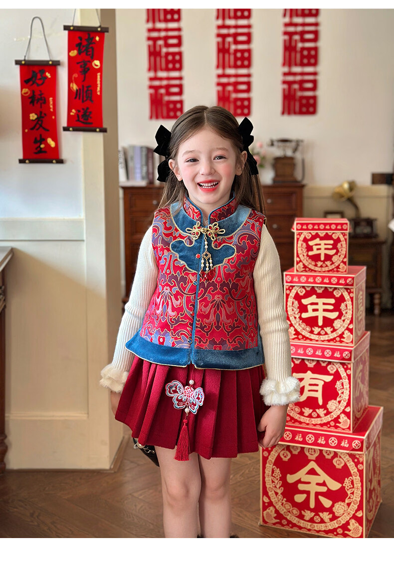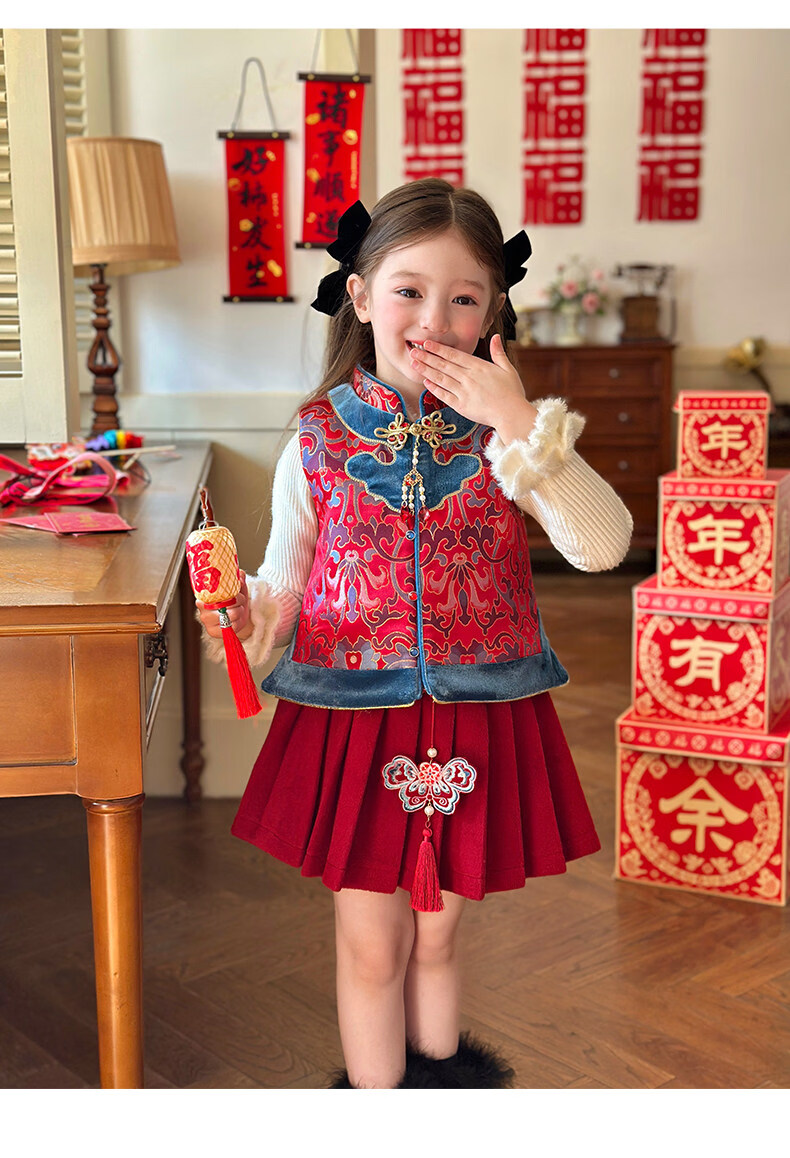 栀了成长记童装女童红色国风套装2025冬季儿童新年夹棉马甲两件套 红色 套装 100 cm