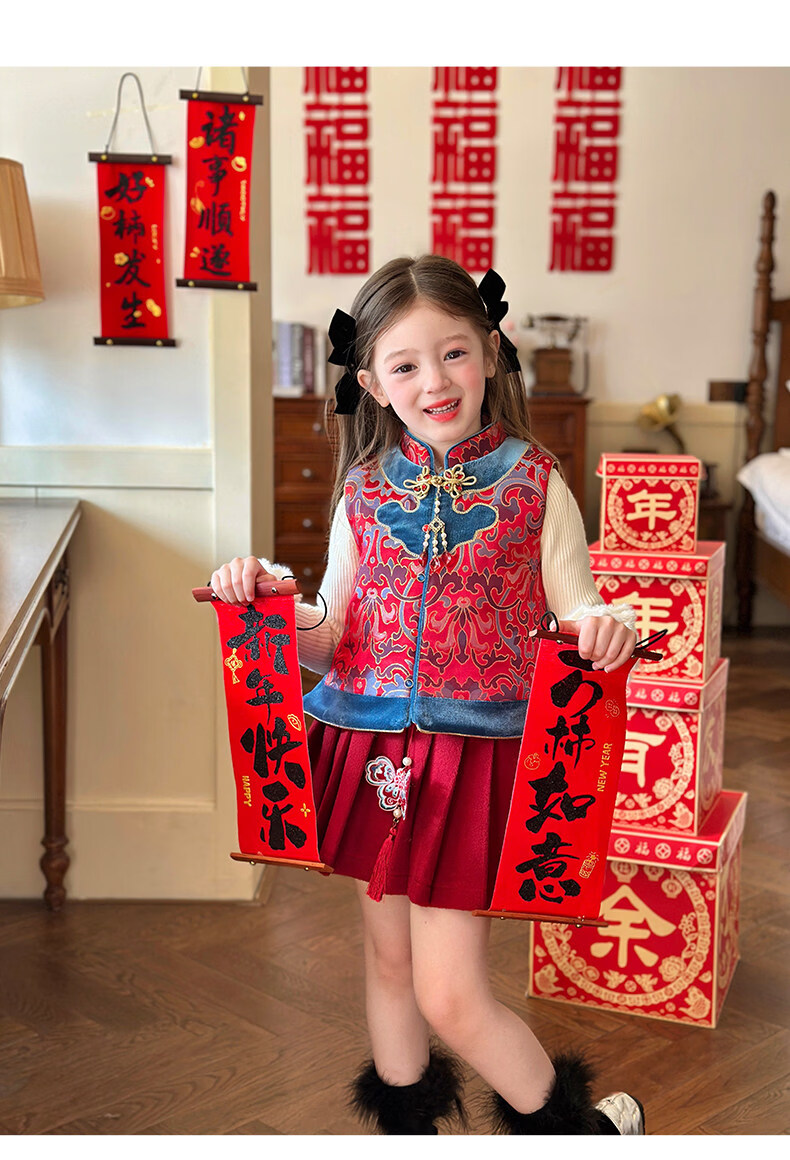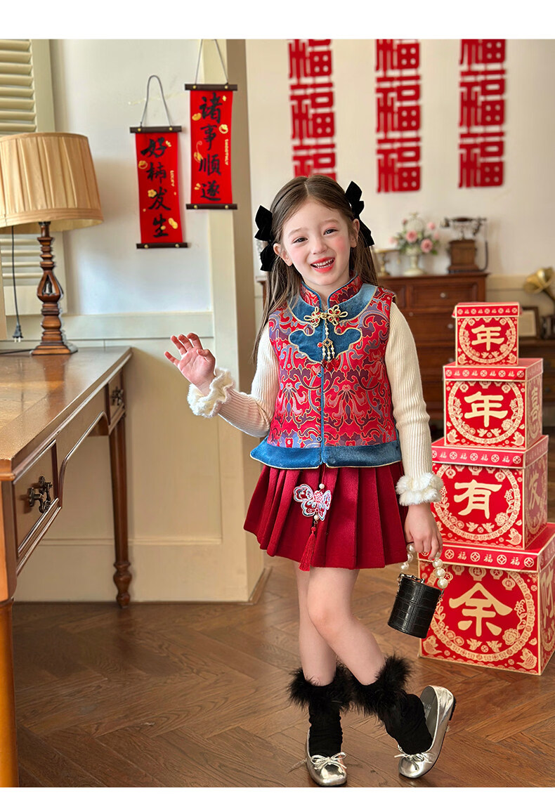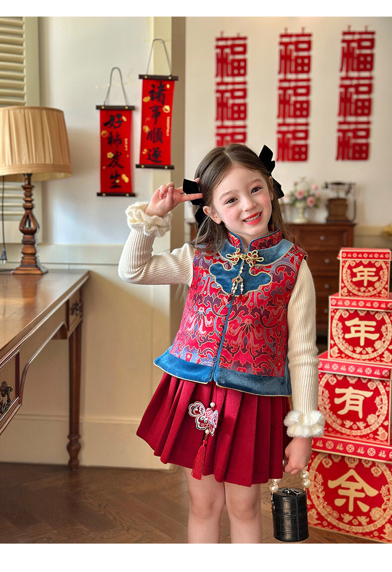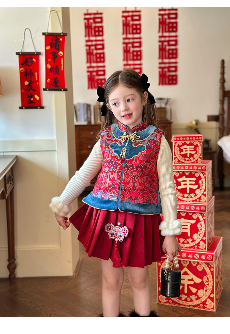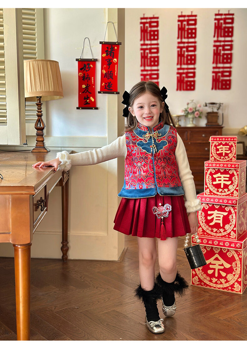 栀了成长记童装女童红色国风套装2025冬季儿童新年夹棉马甲两件套 红色 套装 100 cm