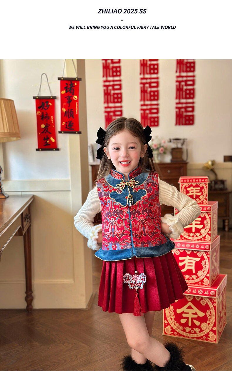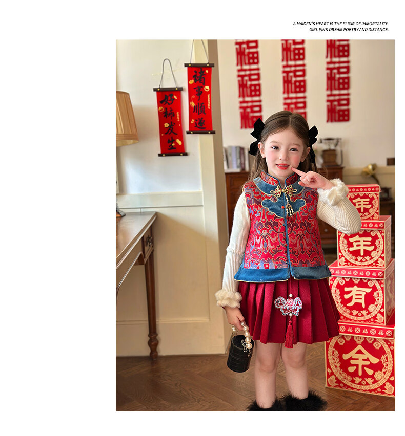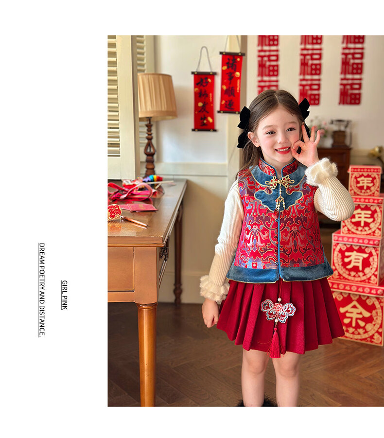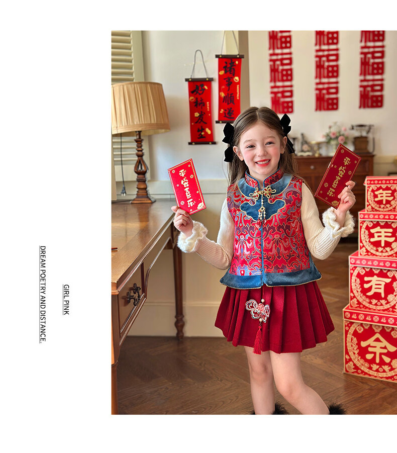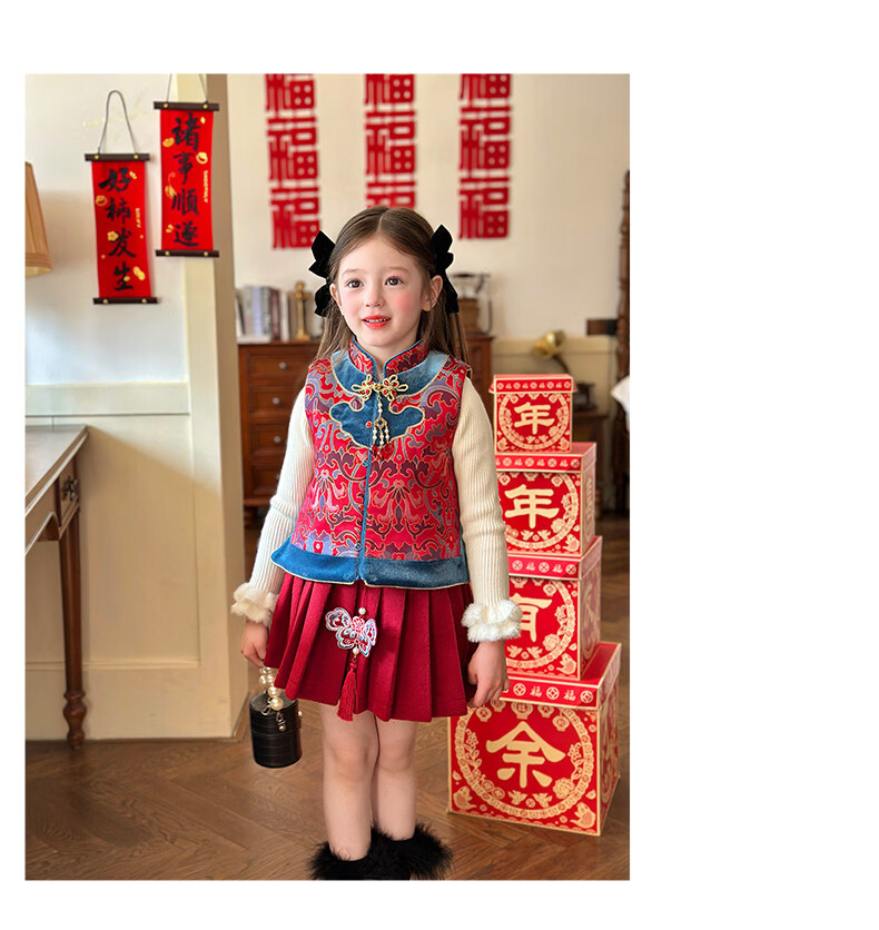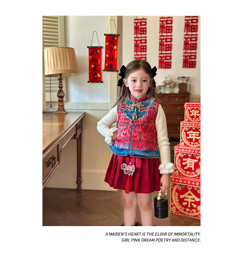 栀了成长记童装女童红色国风套装2025冬季儿童新年夹棉马甲两件套 红色 套装 100 cm
