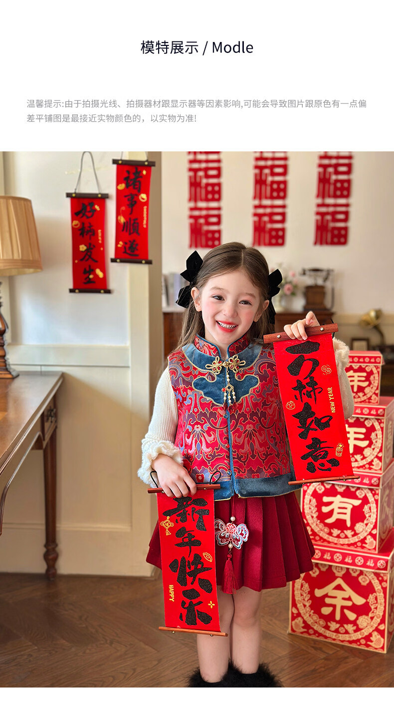 栀了成长记童装女童红色新年唐装上衣2025冬季儿童新中式夹棉马甲 红色 马甲 100