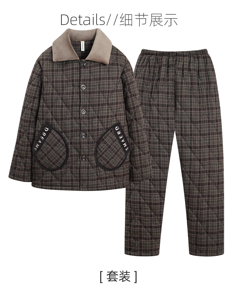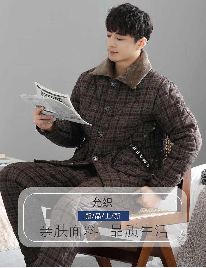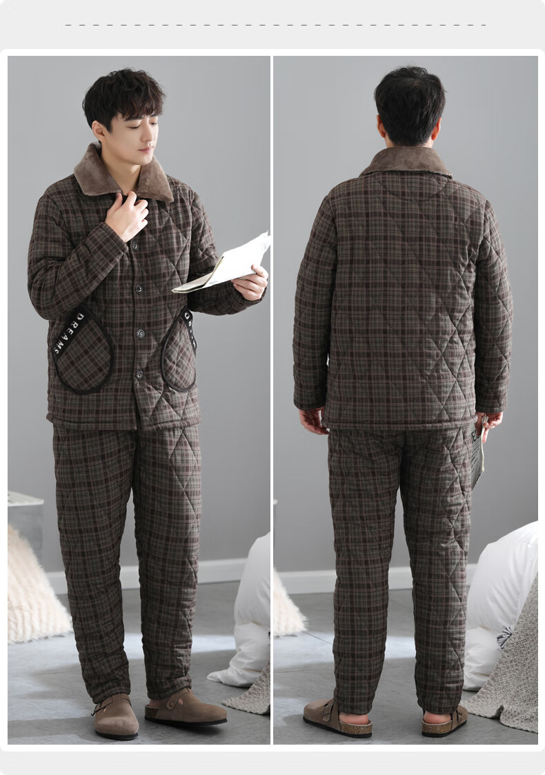 允织睡衣男士冬季三层加厚加绒梭织纯棉夹棉秋冬款珊瑚绒加大码家居服 68010-铁黑 L (170) :建议120-140斤穿着