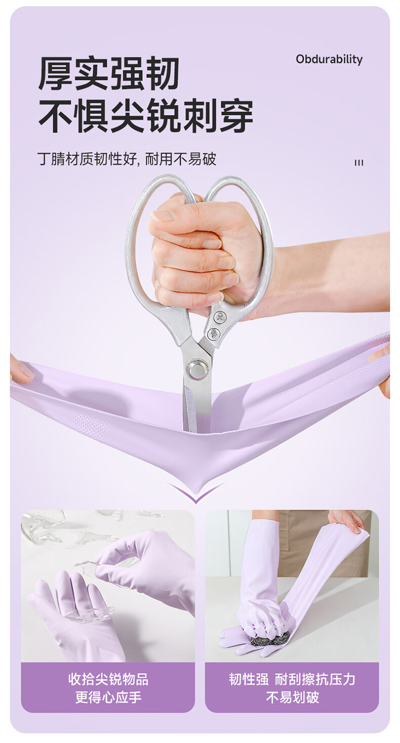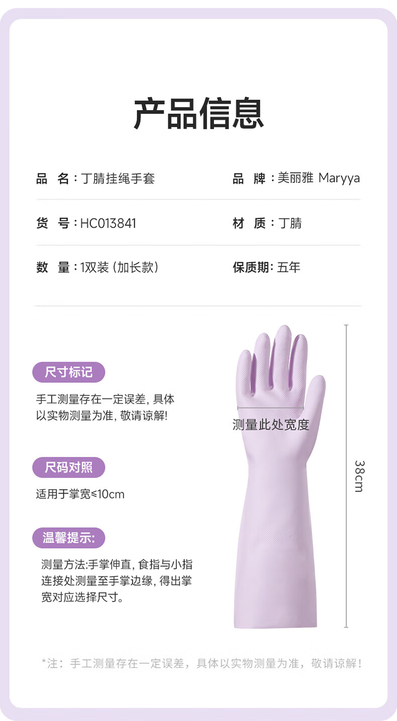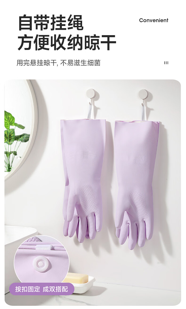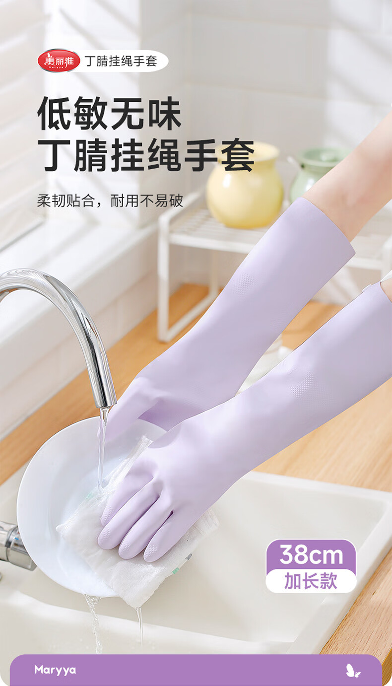 美丽雅(MARYYA)挂绳丁腈手套 家用厨房清洁洗碗家务手套加厚防水洗衣服手套 紫色- 1双 -中号