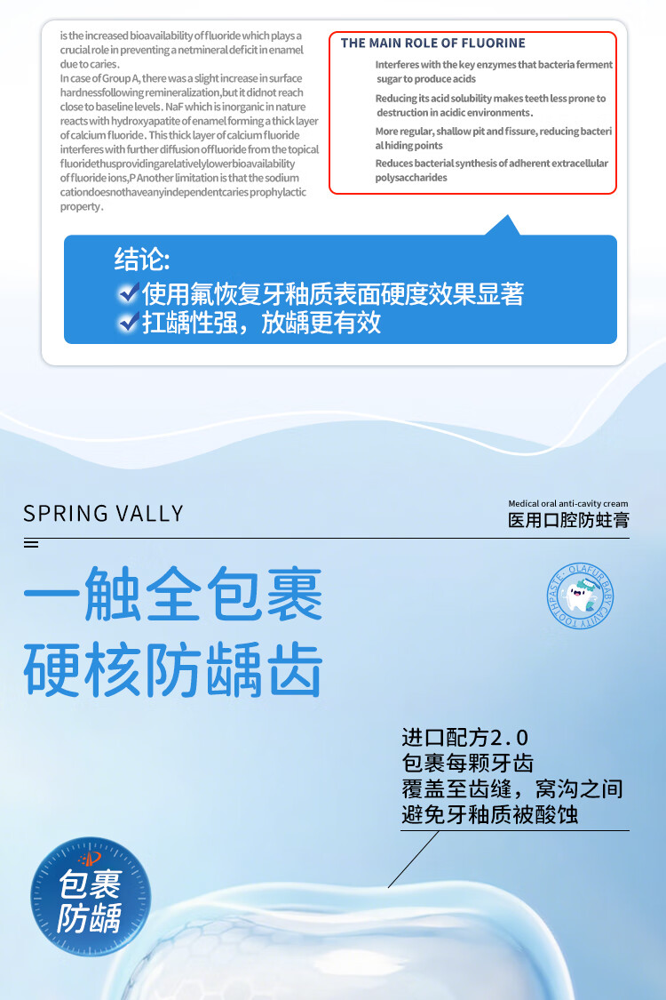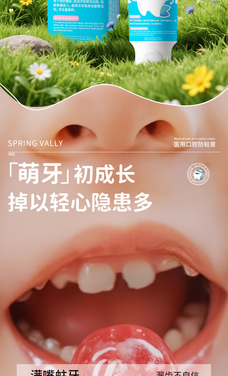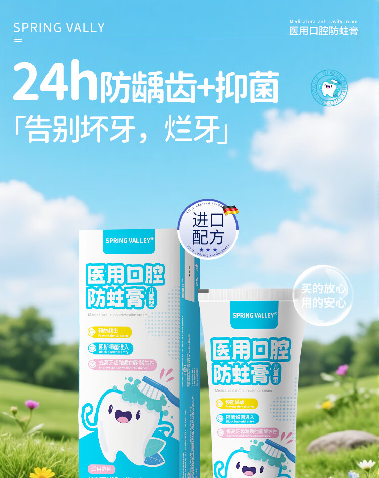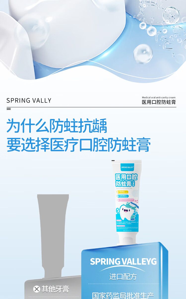 SPRING VALLEY儿童牙膏3-6-15岁换牙期防蛀含氟抗糖青少年初中生专用可吞去黄渍 防龋护齿100g2支【有效固齿抑菌】