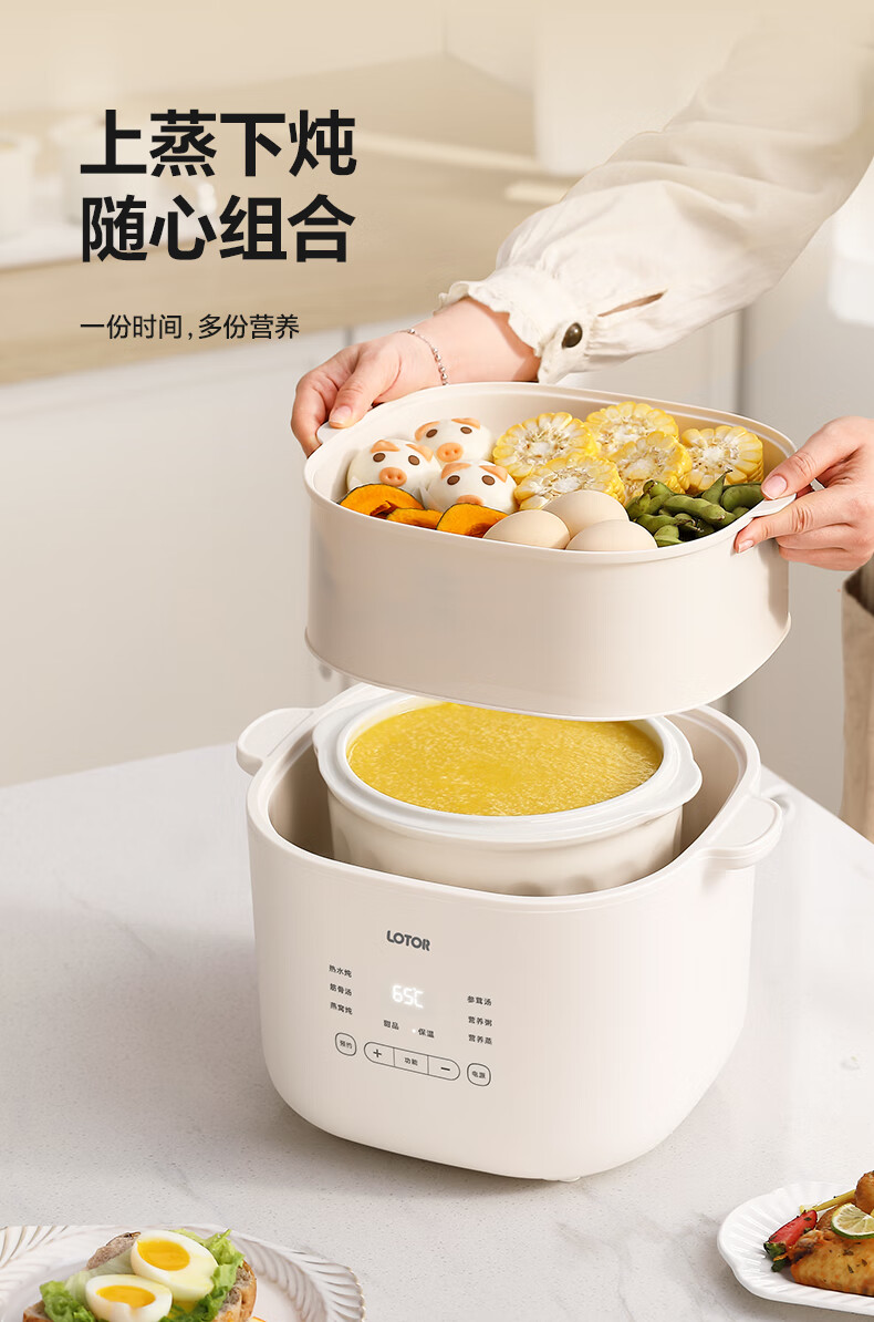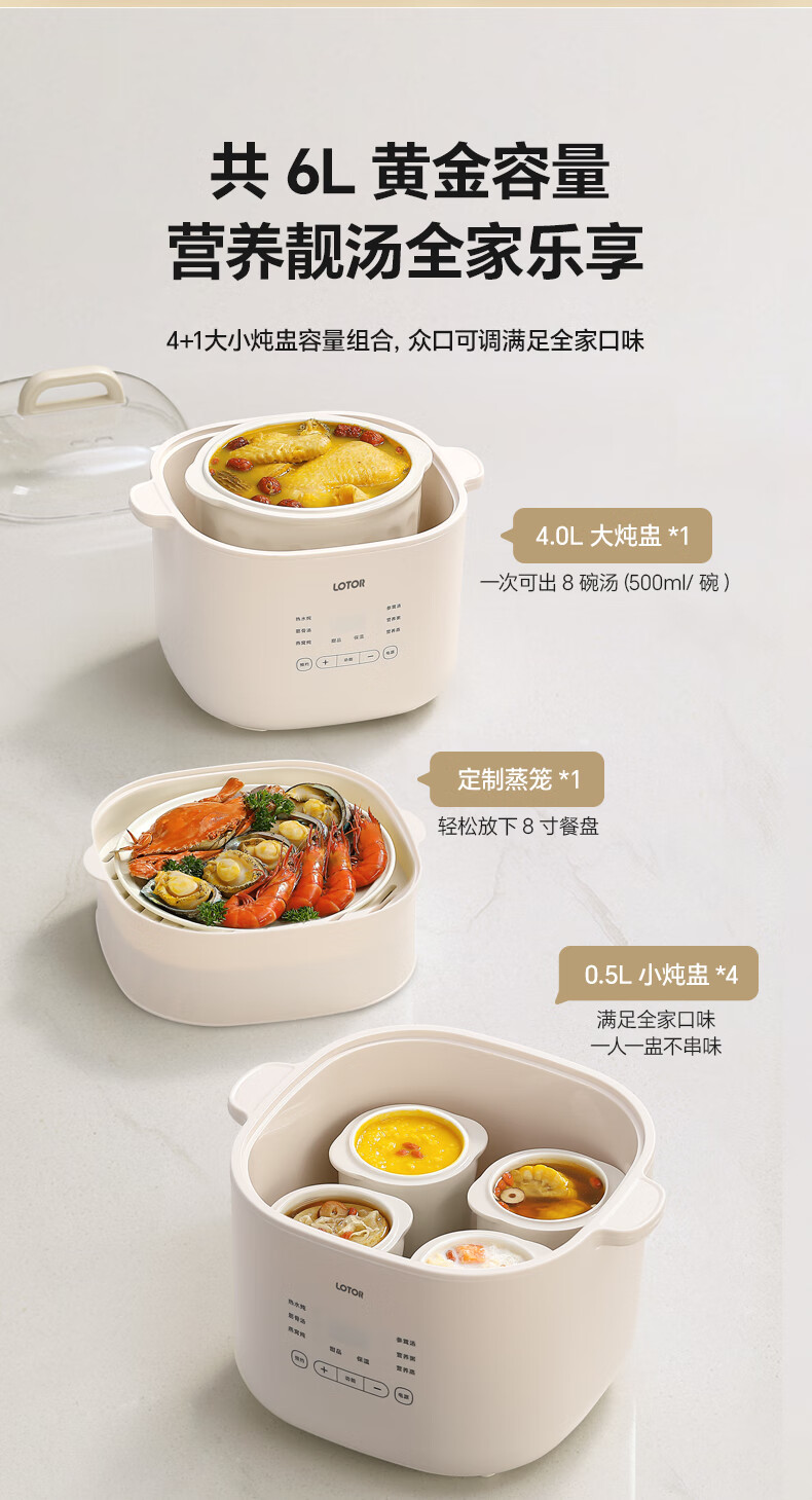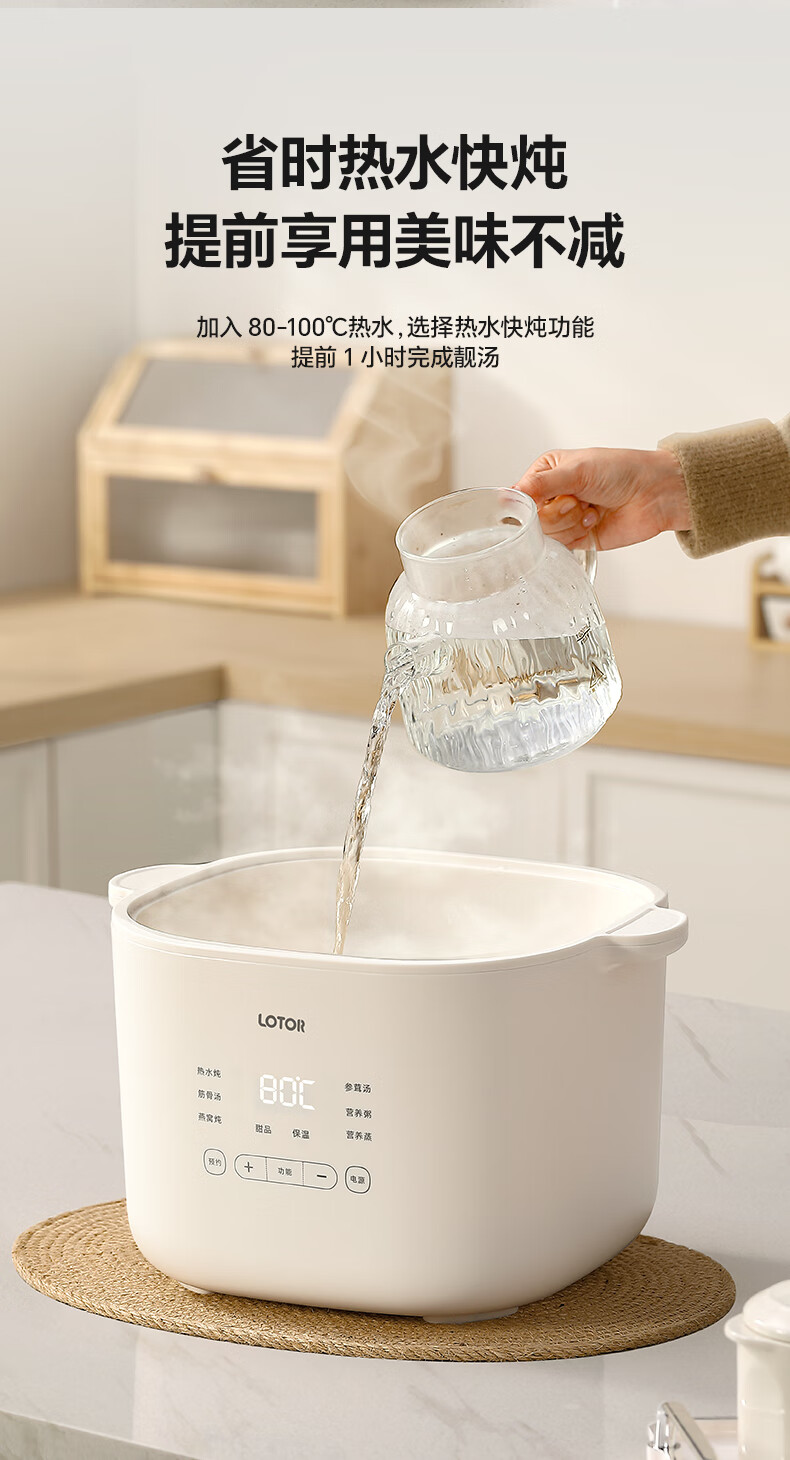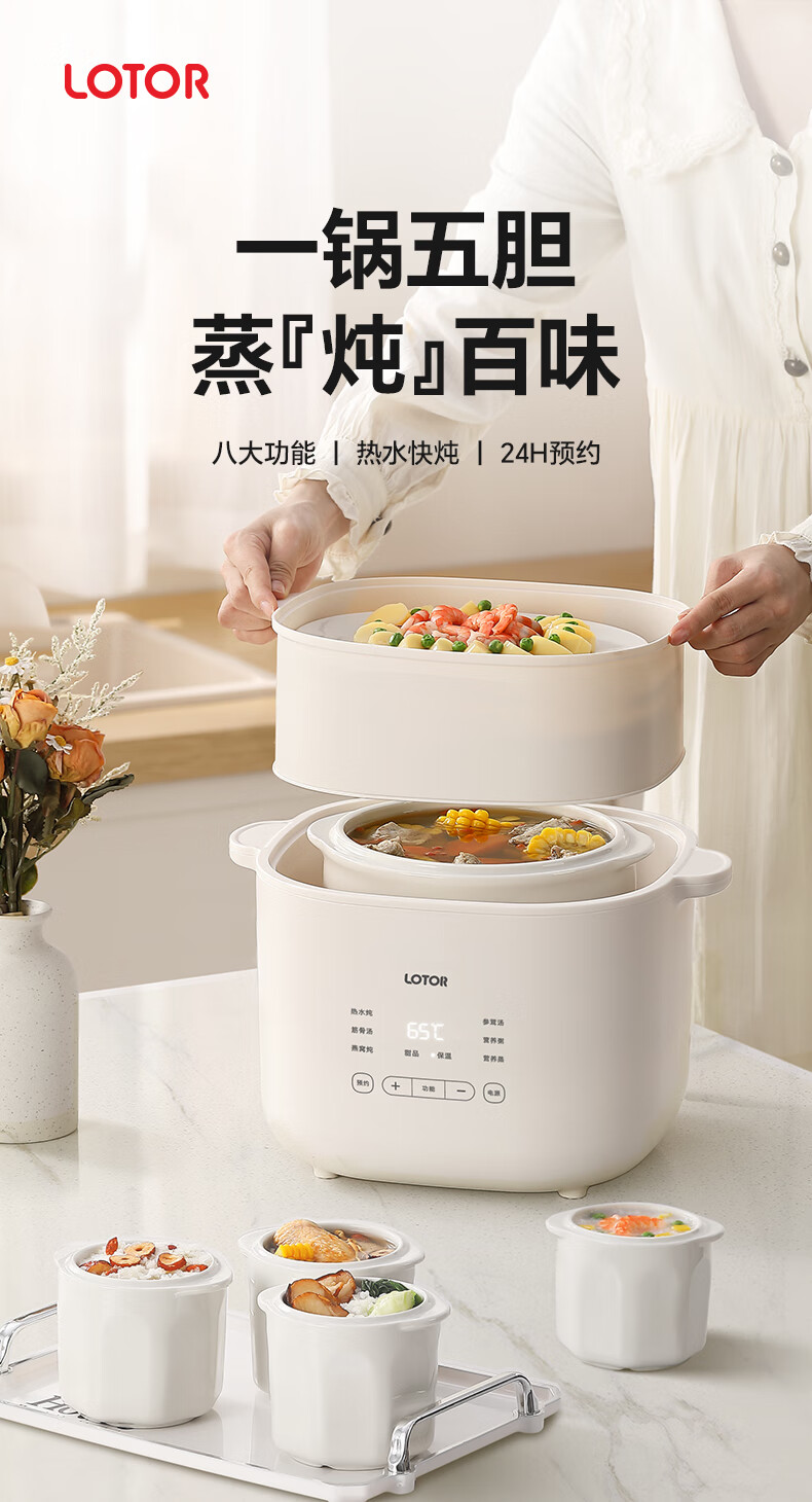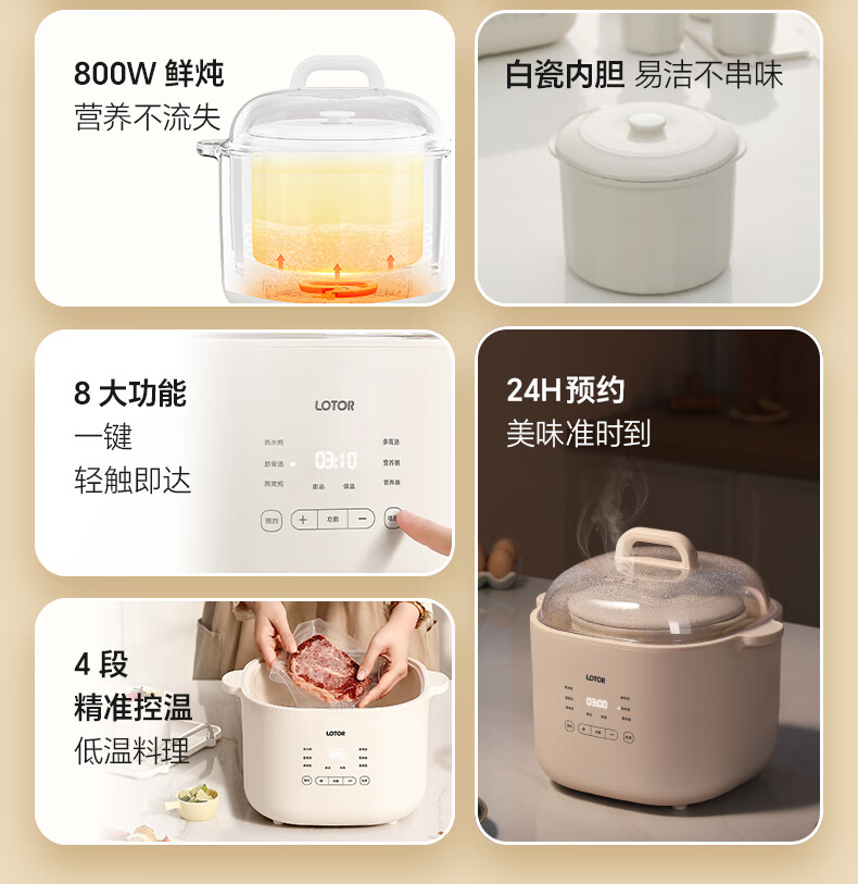 LOTOR徕多电炖锅家用炖盅大容量隔水多功能煲汤炖汤盅陶瓷燕窝电炖盅隔水煮粥神器宝宝辅食锅4-5人用 白色 8L 七胆旗舰款【彩屏12菜单】