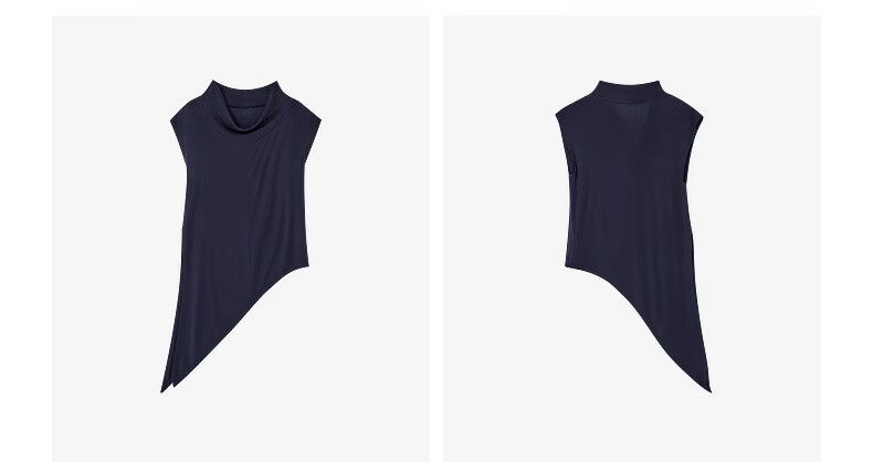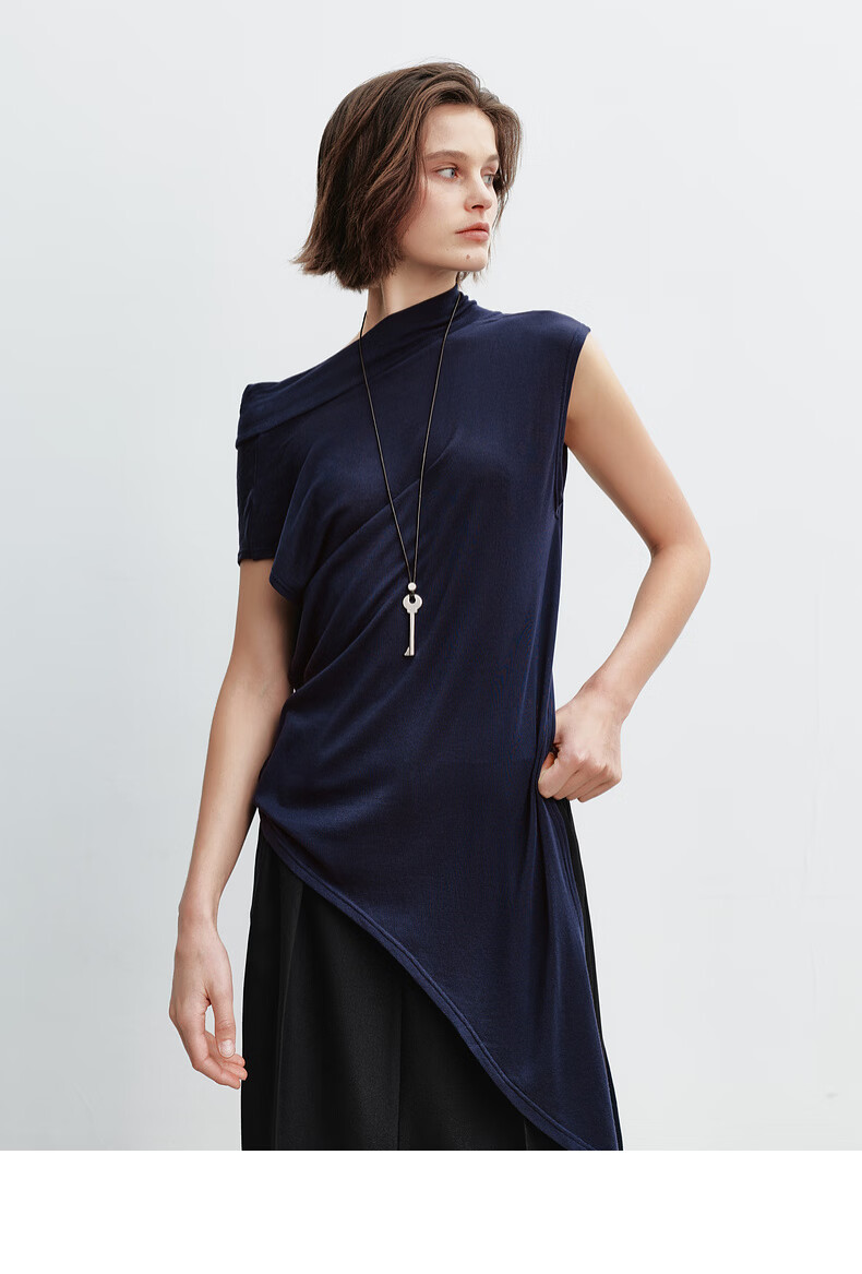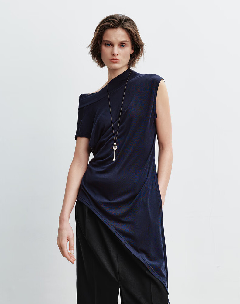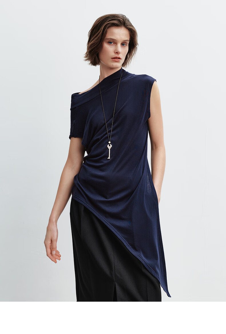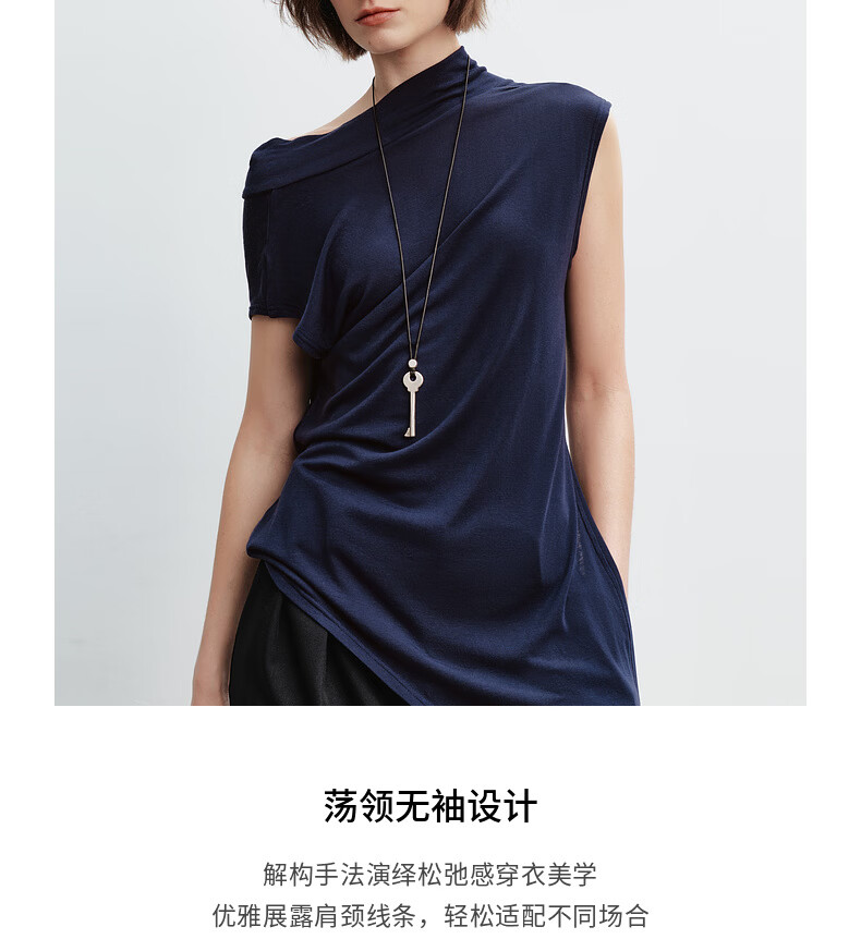 H's莱赛尔T恤女26年春季新款感觉设计感不对称荡领无袖背心上衣 藏青 S