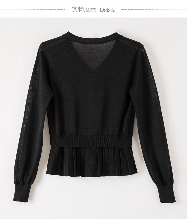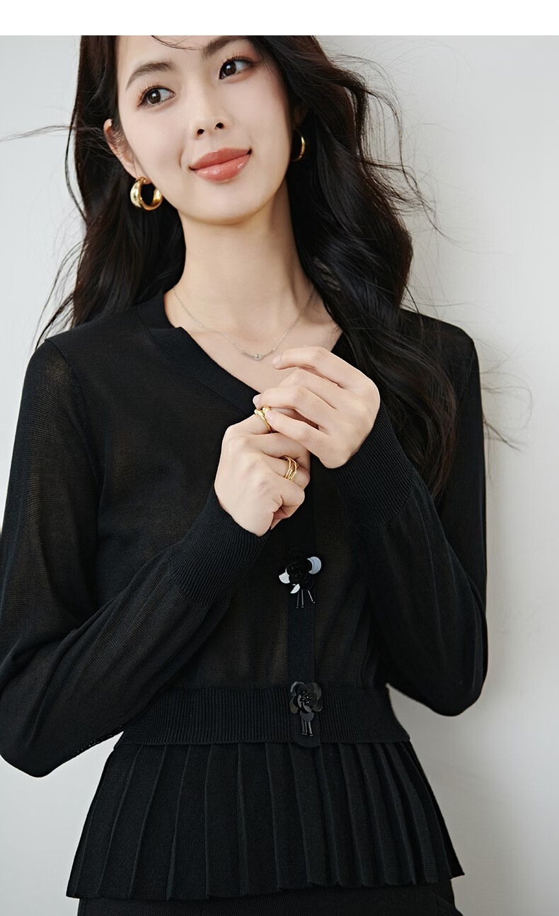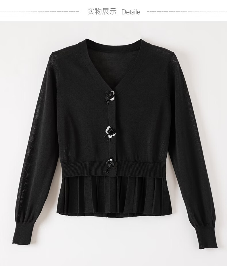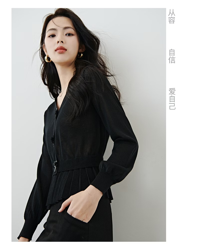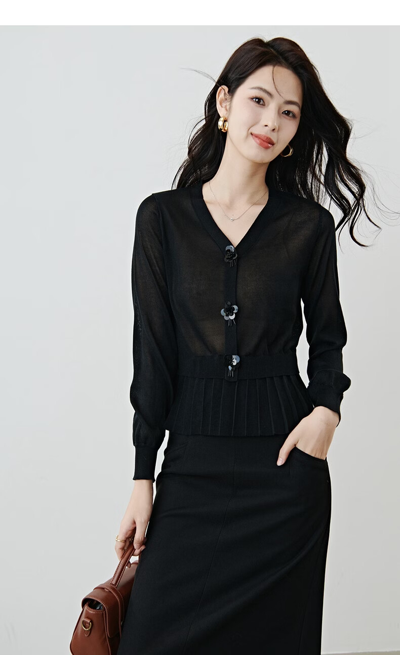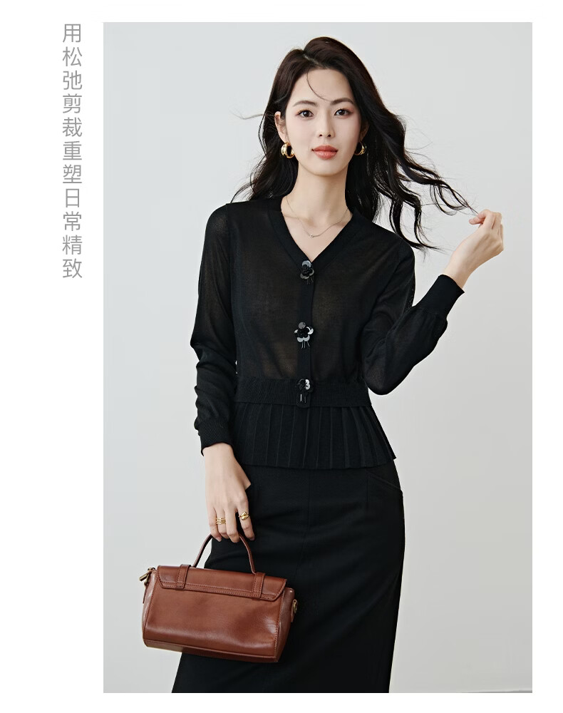 晚白2026春款设计感珠花扣装饰V领上衣小众百褶遮肉下摆莱赛尔针织衫 黑色 L